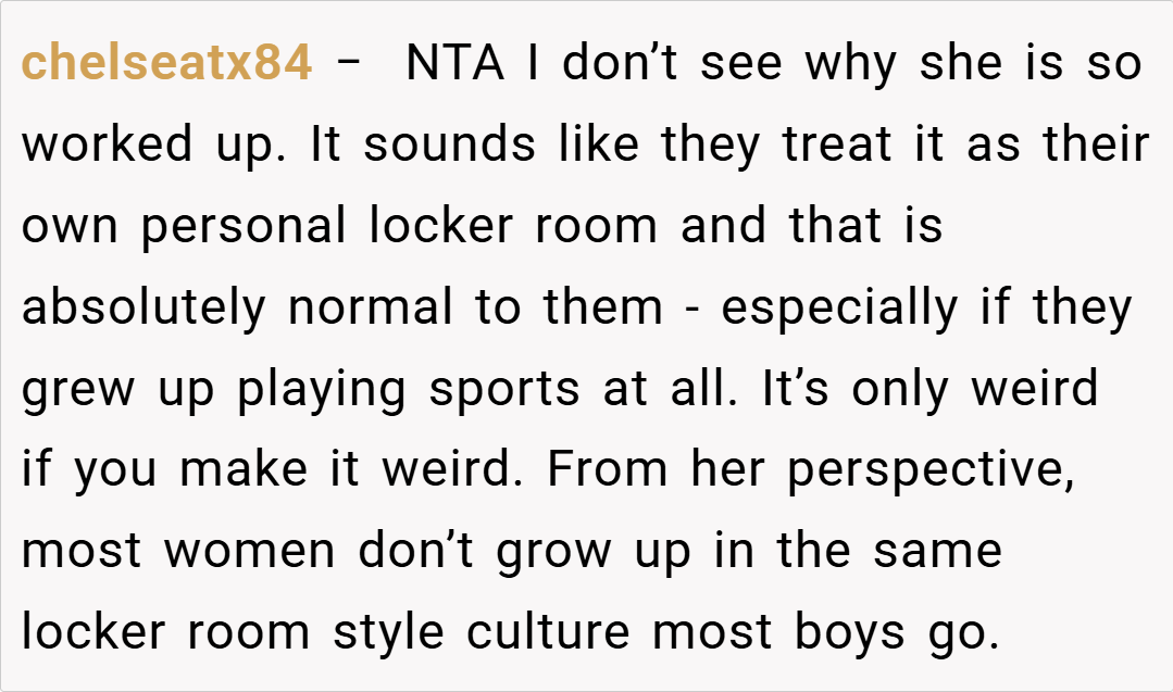 The OP’s stance brings to light the broader issue of differing comfort levels within a family. While his sons thrive in their self-contained world, the stark reaction from his sister illustrates how personal boundaries can vary widely. In many athletic environments, overlapping shower times are simply part of the routine, molded by cultural and social norms. This conflict of opinion invites a thoughtful conversation on the balance between individual family values and inherited societal expectations.