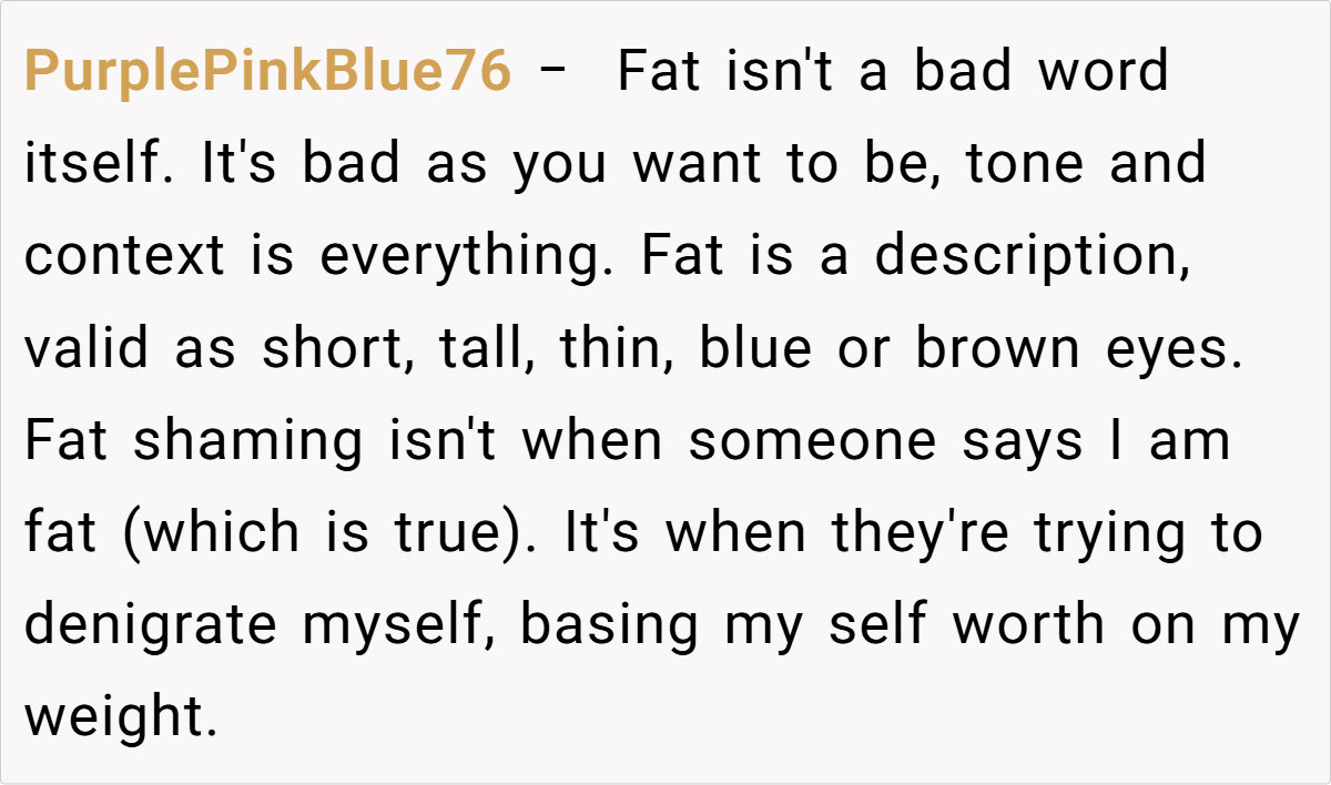 Body Positivity vs. Body-Shaming: Some applauded the wife’s openness about calling herself “fat,” emphasizing that it’s only insulting if used to degrade, not if it’s simply descriptive.
