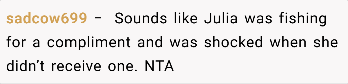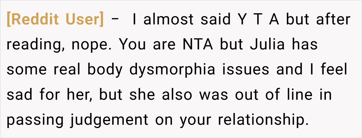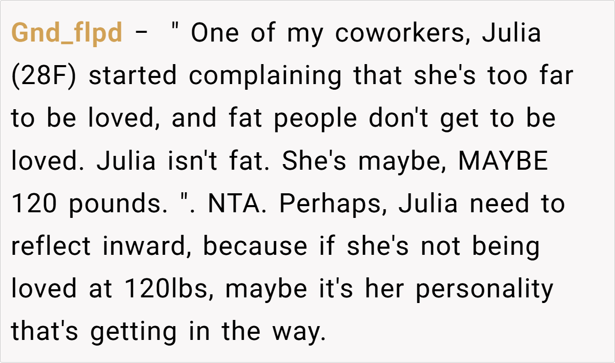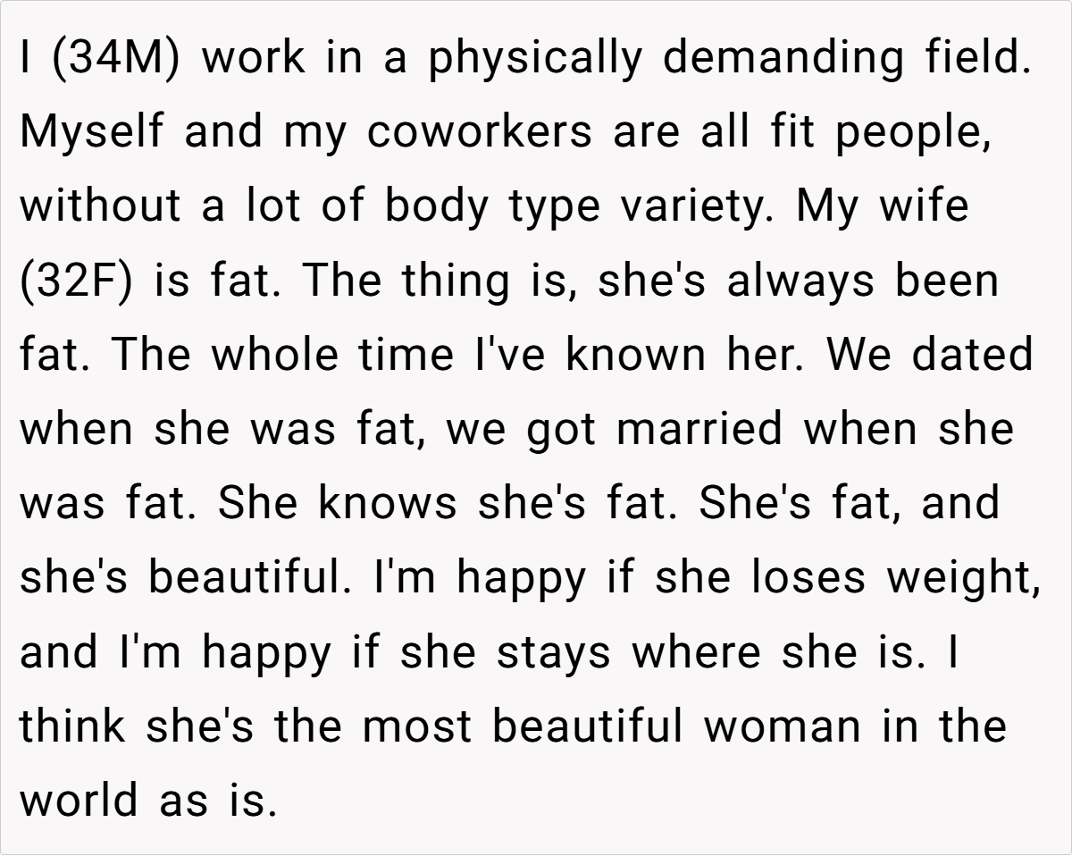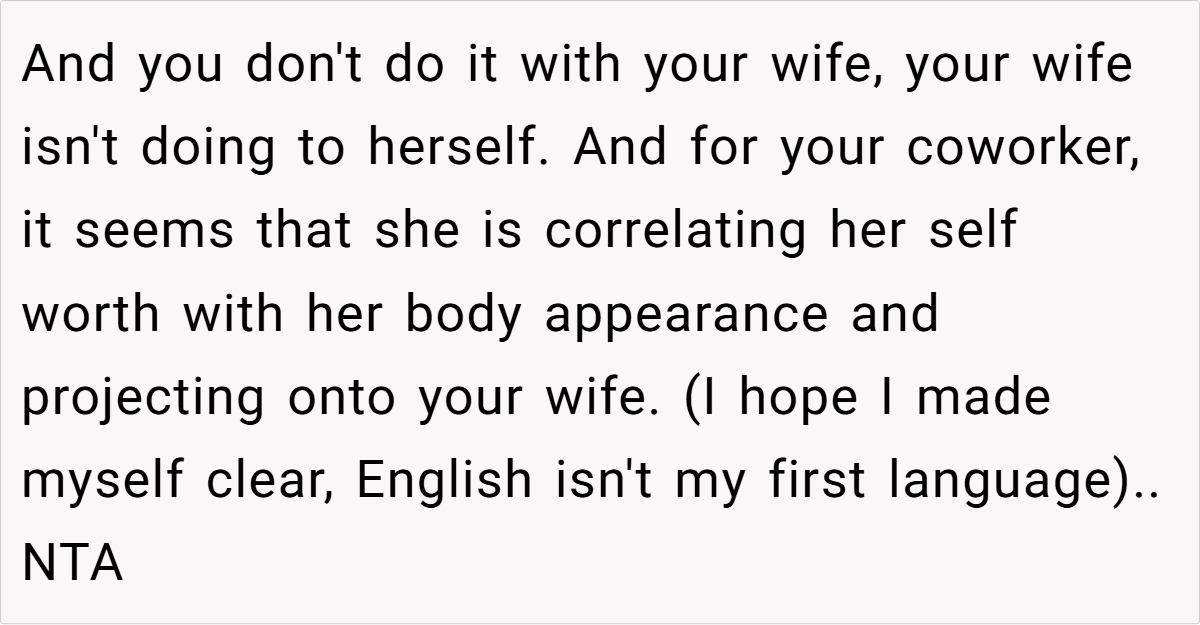 In professional environments, discussions about personal appearance or health can easily become landmines. Even if two consenting adults have a comfortable language for describing themselves, coworkers may interpret it differently. This is especially sensitive when someone has their own insecurities, as Julia clearly does. While the OP and his wife share a mutually respectful outlook, Julia’s strong reaction hints at deeper concerns about beauty standards and body acceptance.