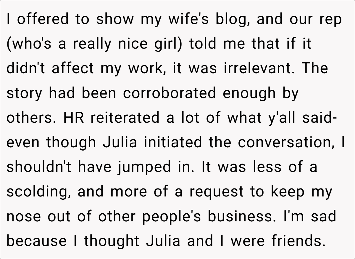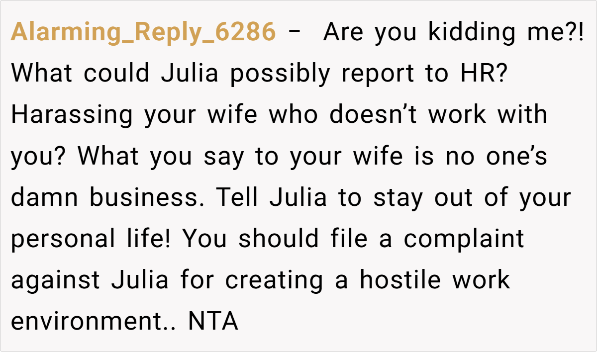 Coworker’s Projections: Many suspected Julia of projecting her own anxieties and labeling the OP as abusive without basis.