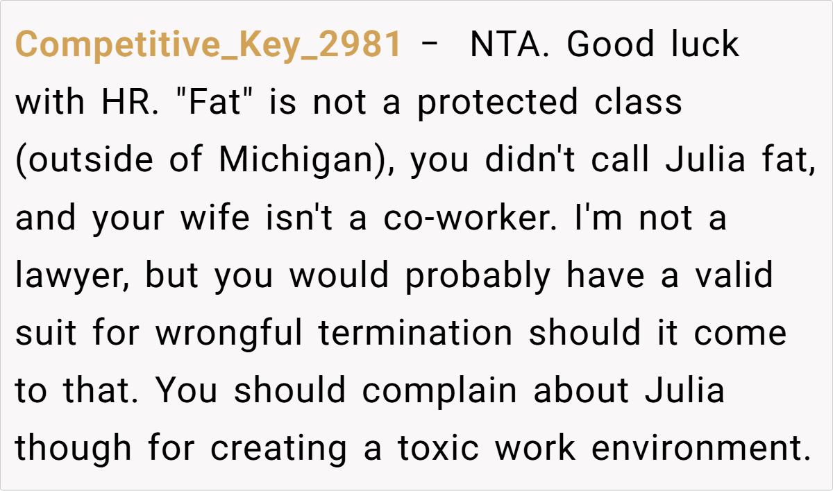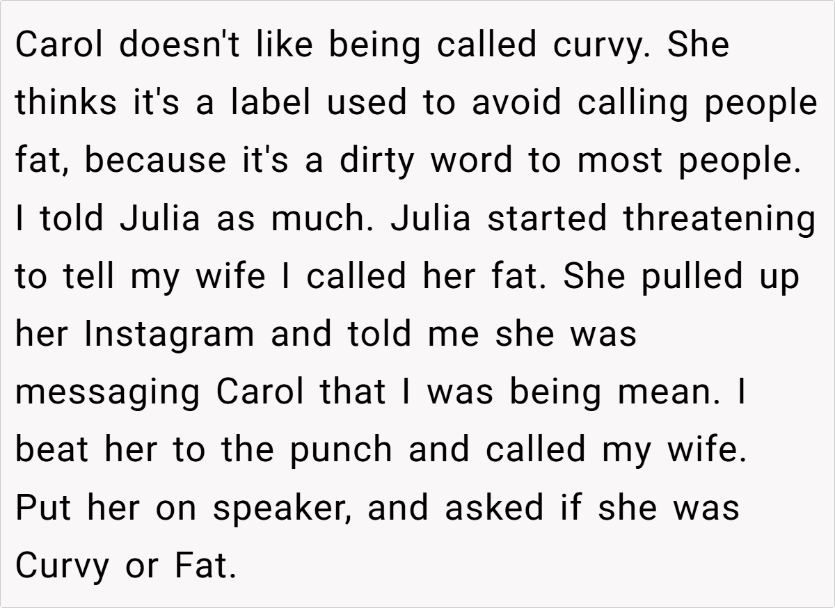 It’s a classic tale of personal boundaries crossing into the workplace. The husband insists that his wife’s comfort with the label is part of her identity—she’s proud of being “fat and beautiful,” and is vocal about it on social media. However, Julia sees the use of “fat” as automatically cruel. Now, the husband faces the messy fallout of a coworker who believes she’s protecting his wife from supposed verbal abuse.