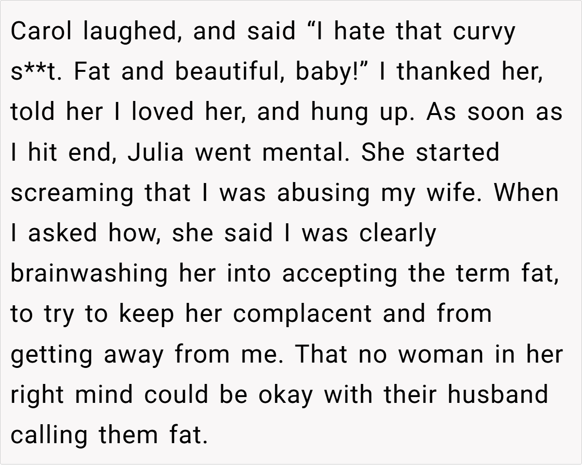 Finding a healthy way to discuss weight—even with loved ones—can be surprisingly complicated. In this story, a husband casually refers to his wife as “fat,” but not in the harsh or shaming sense we might expect. His wife, openly body-positive, embraces the word to describe herself without judgment or shame. Trouble arises at work when a coworker, Julia, overhears the conversation, decides that calling someone “fat” is demeaning, and reports him to HR.