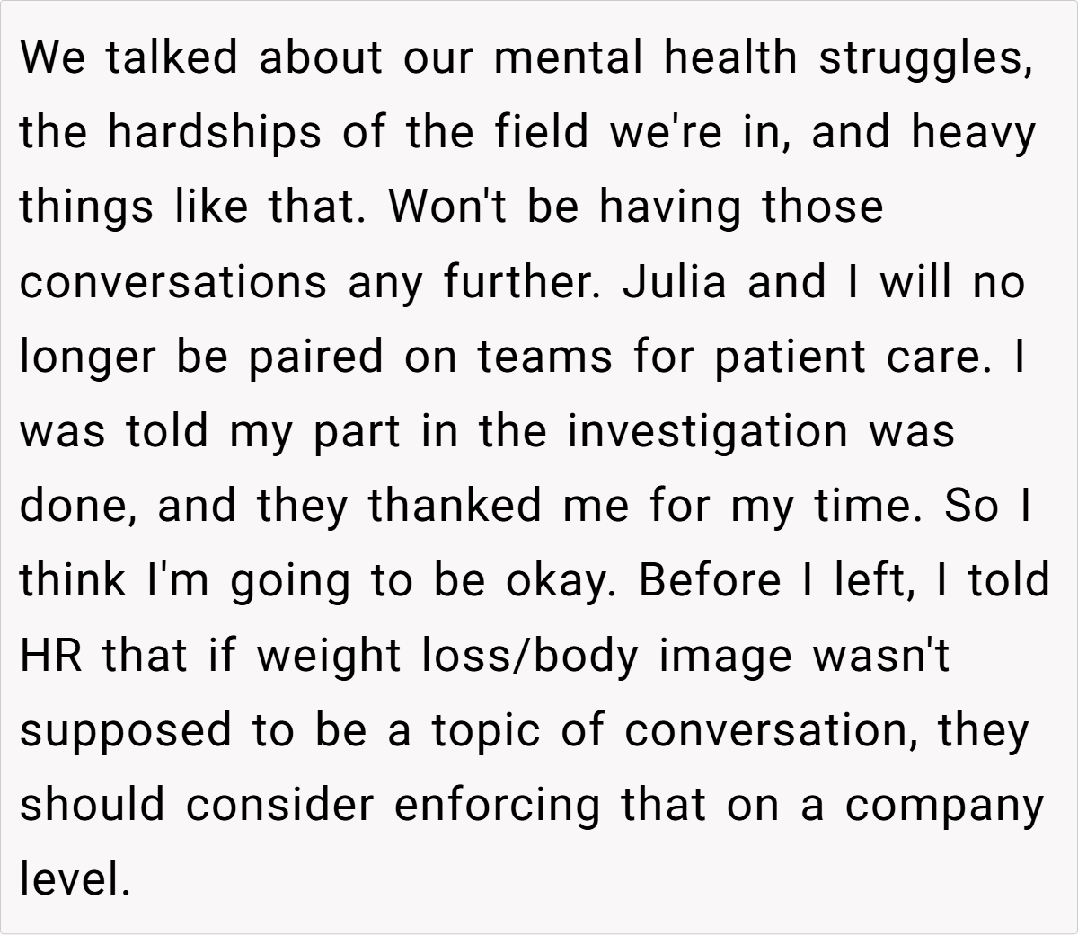 Workplace Boundaries: Several commenters questioned whether personal body talk belongs at work at all, warning that casual conversations can quickly escalate into HR issues.