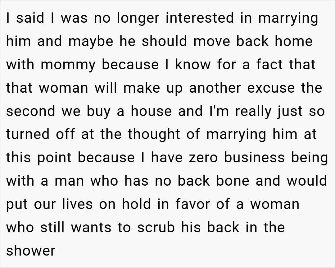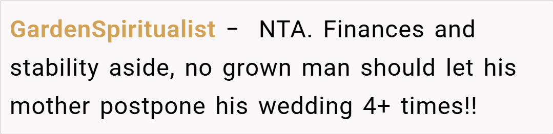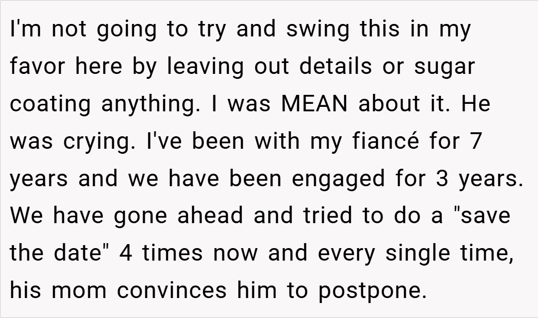 Many redditors sympathize with the OP’s frustration, arguing that the interference from his fiancé’s mother is more than just meddling—it’s a complete takeover of his future. They appreciate his candid admission that he’s had enough of the constant delays and excuses, and applaud his decision to stand up for his autonomy.