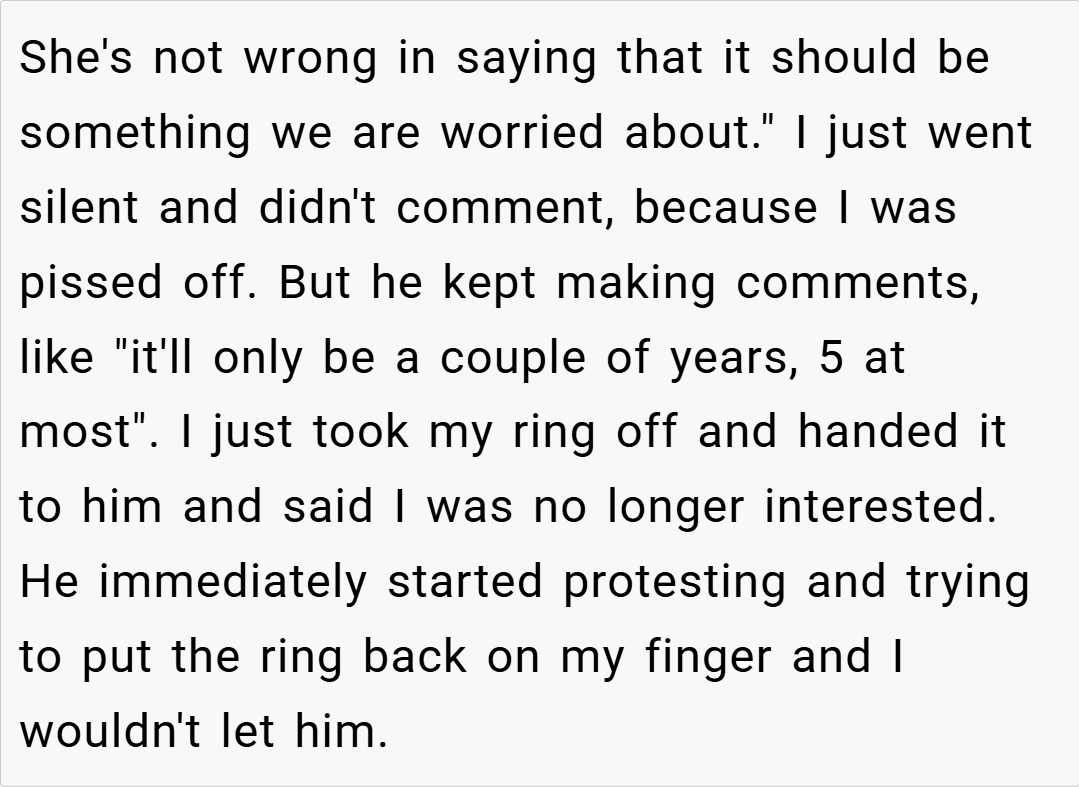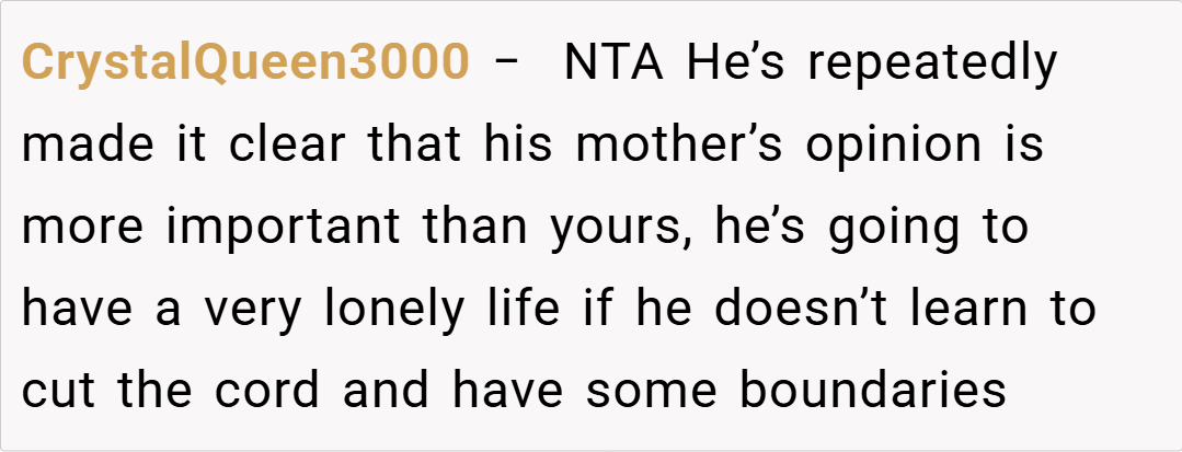 The OP’s action—removing his ring and verbally severing ties with his fiancé’s mother’s influence—may seem extreme, but it underscores the emotional toll of living under constant external pressure. Furthermore, relationship therapist Dr. Susan Johnson adds that such conflicts often indicate deeper issues within the couple’s relationship, not merely the meddling of extended family.