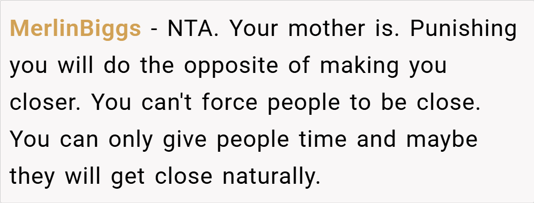 Blended families thrive when mutual respect is present, but does that mean emotional closeness should be expected? Is OP wrong for keeping his distance, or is his mother being unreasonable by punishing him for not feeling the way she wants him to? What’s the right balance between respecting family relationships and forcing an unwanted bond? Let’s discuss in the comments.