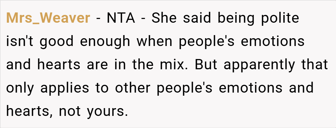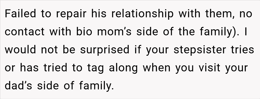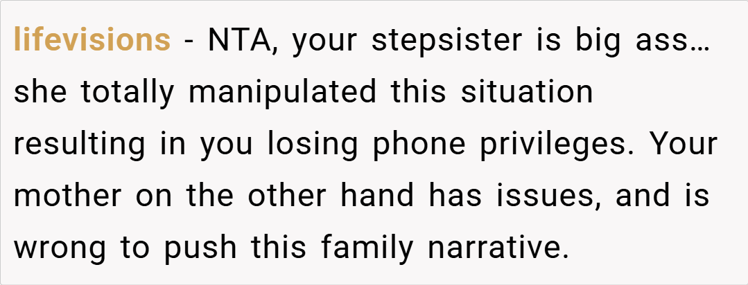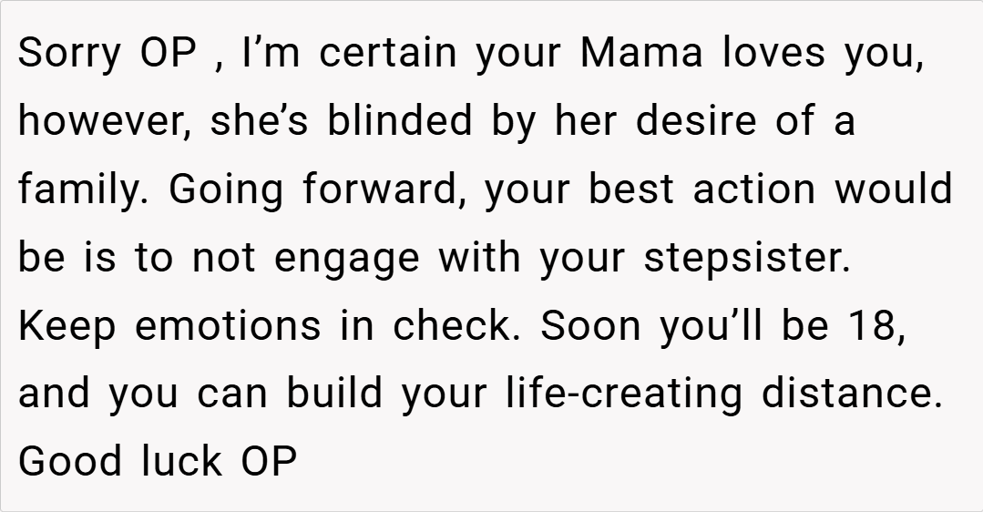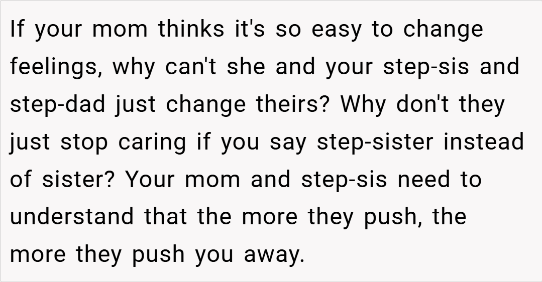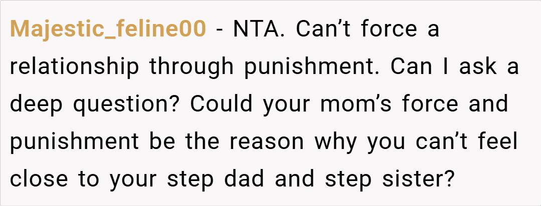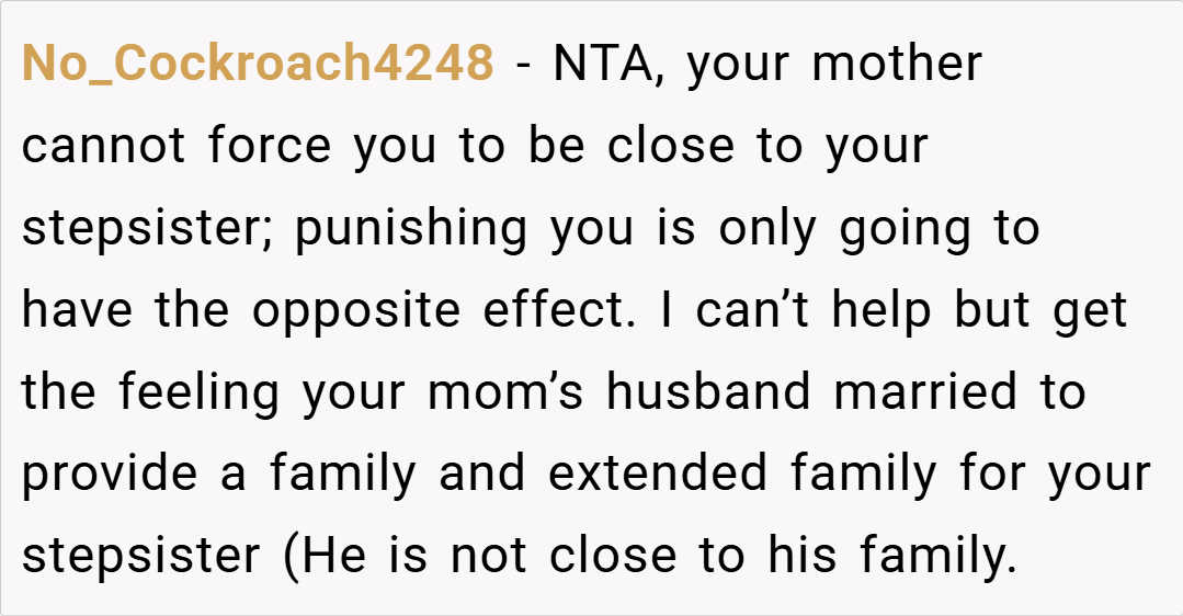 Most people felt that the stepsister’s question was inappropriate and placed the OP in an unfair position. Many agreed that while blended families take time, forcing emotions and punishing politeness isn’t the answer. Some also pointed out that the stepsister’s comment about deserving punishment showed a deeper issue with expectations in the family dynamic.
