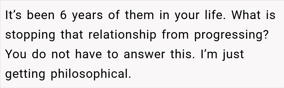 She highlights that OP is already showing respect and politeness, which are important building blocks for any relationship. However, his mother’s insistence that this isn’t enough ignores his emotional boundaries. The stepsister’s repeated questioning may also indicate that she is struggling with her own emotional issues, and this should be addressed in a way that doesn’t place responsibility on OP to fix it.