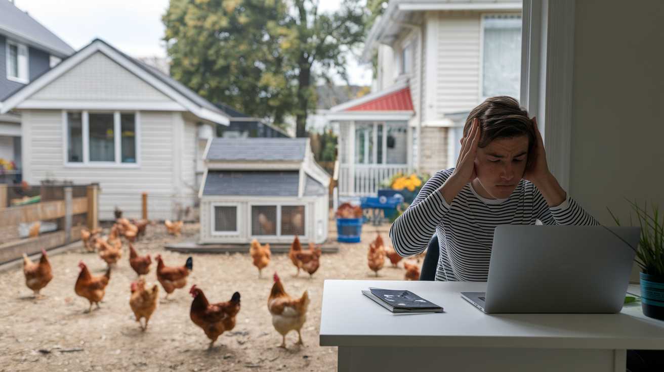 A person called the non-emergency police line on their neighbor, who keeps four noisy “therapy chickens” for anxiety support. The chickens start clucking loudly before dawn, disrupting the person’s work-from-home routine and mental peace.