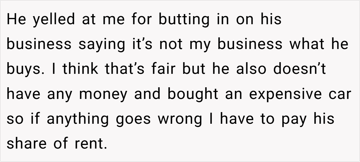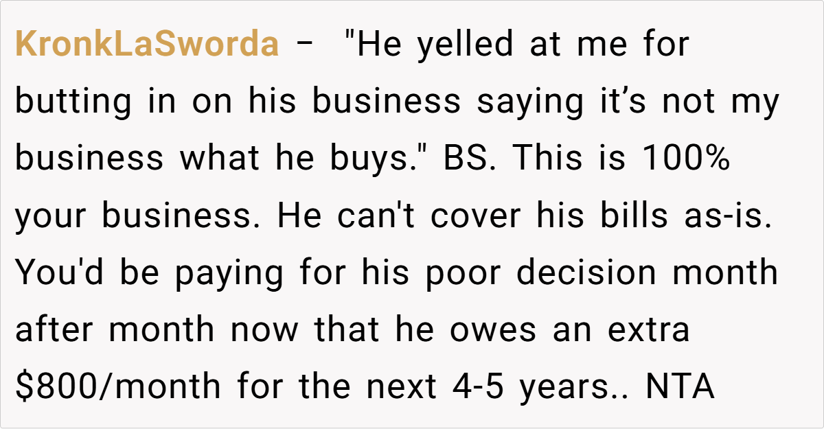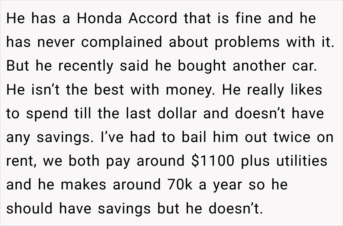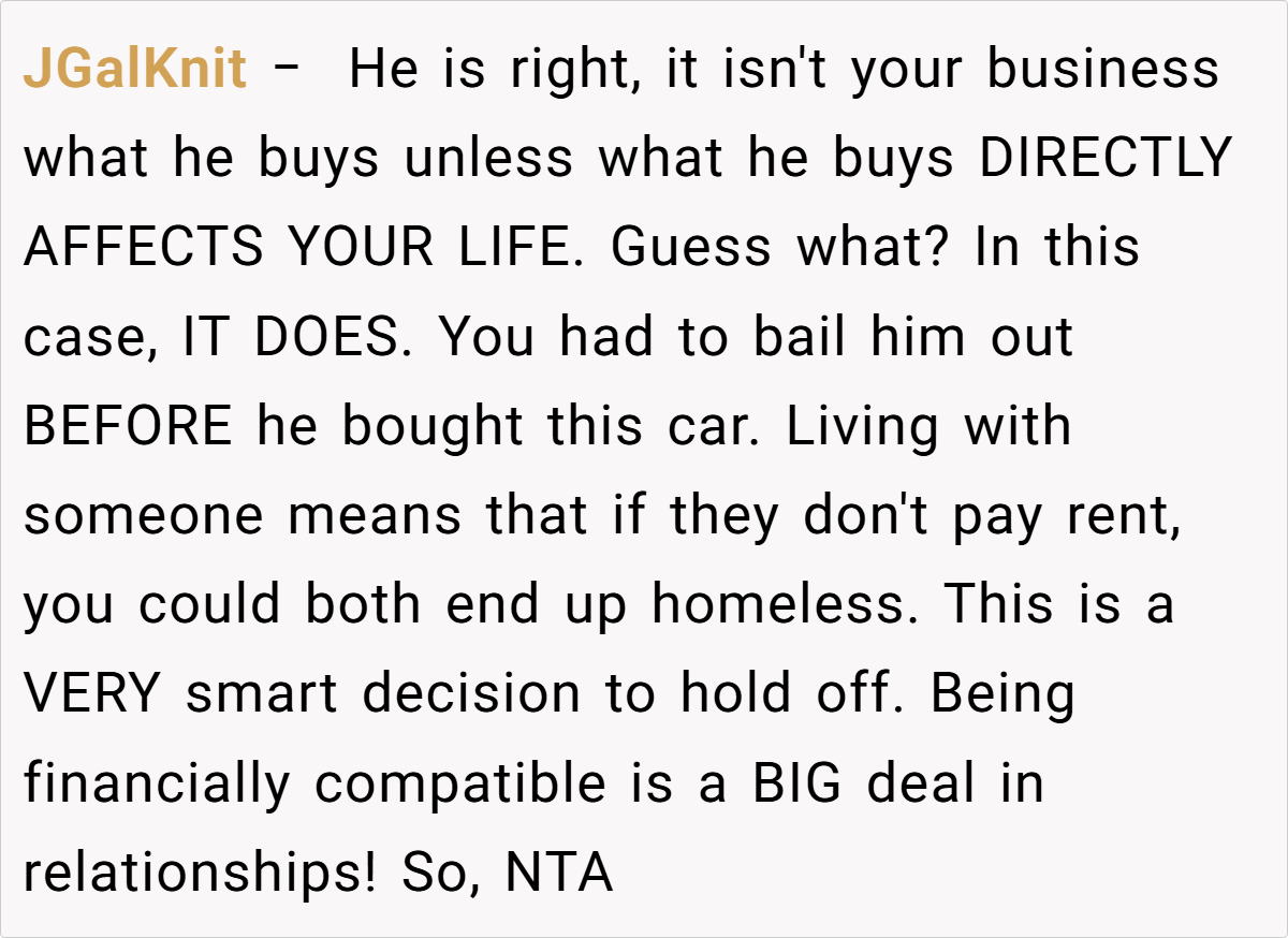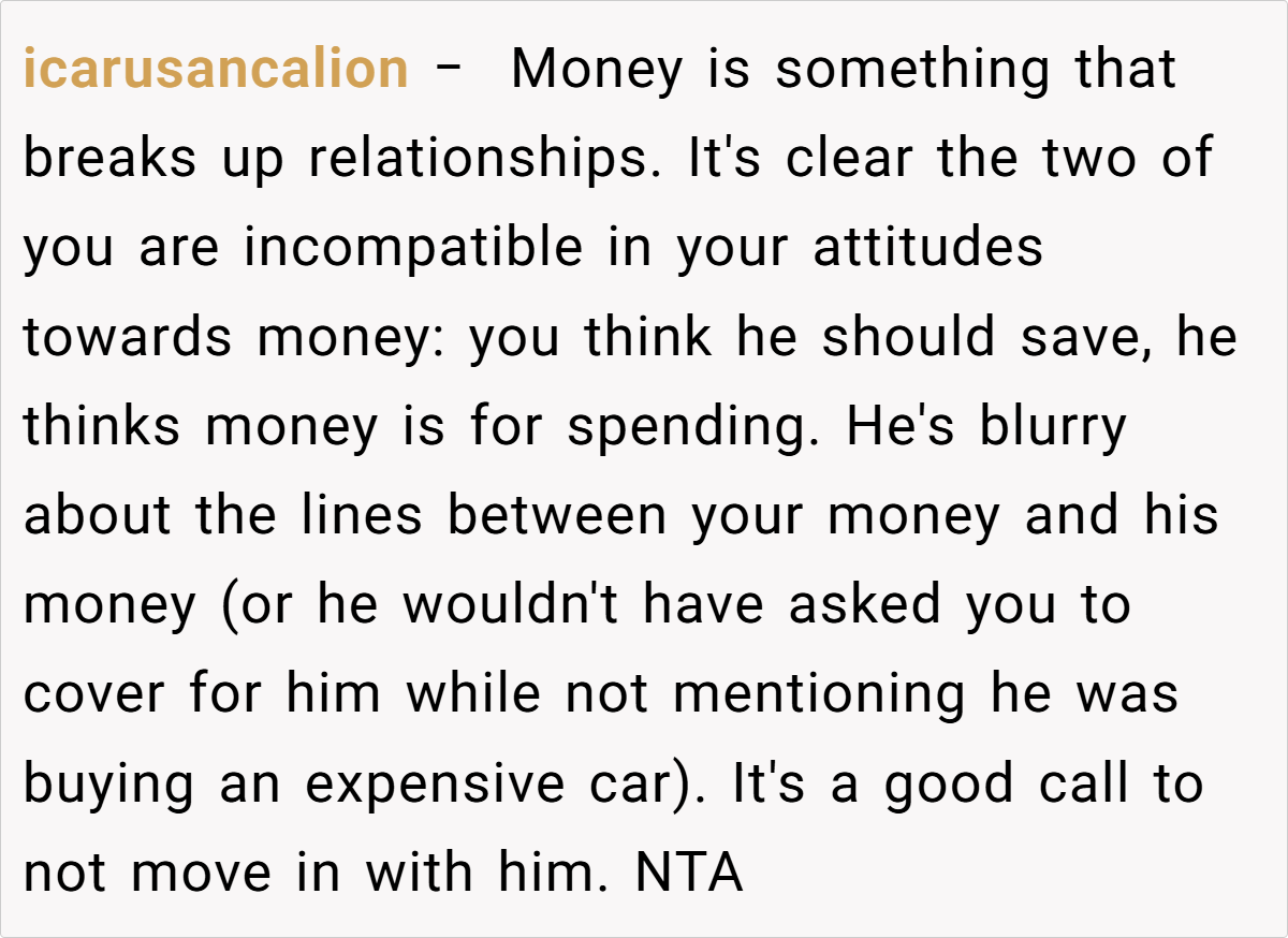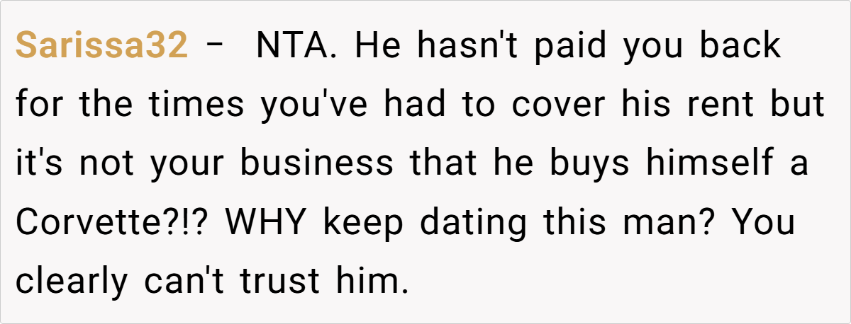 In our case, the OP’s concerns are valid. She has repeatedly covered for her boyfriend’s financial missteps, and his decision to invest in an expensive, non-essential car is indicative of deeper spending habits that could destabilize their shared future. When one partner consistently puts personal indulgence ahead of shared financial security, it creates an imbalance that can lead to resentment and long-term financial strain.