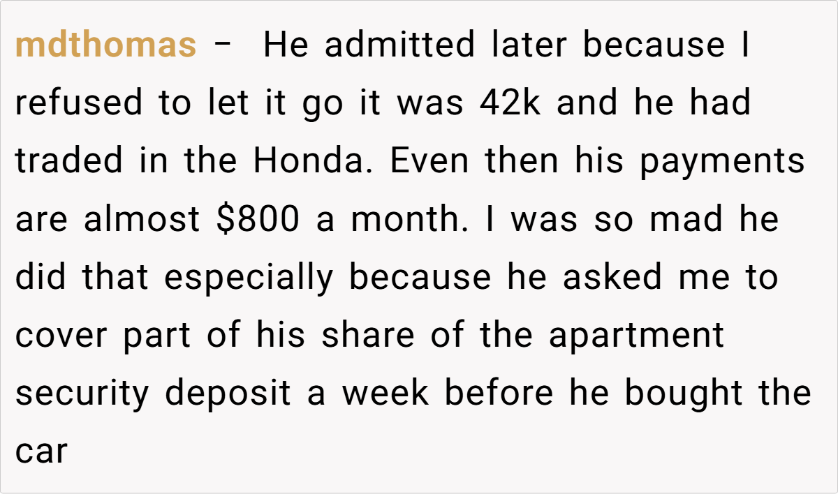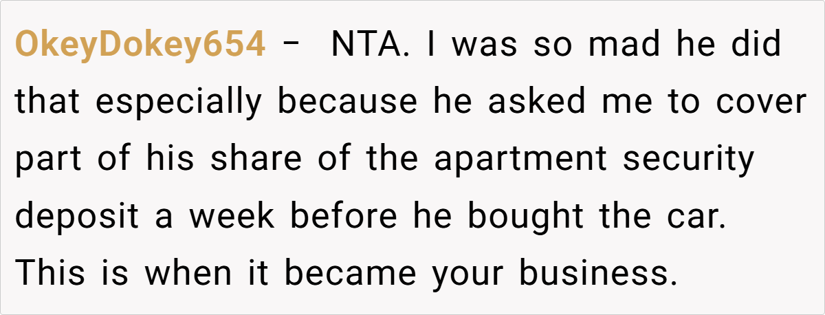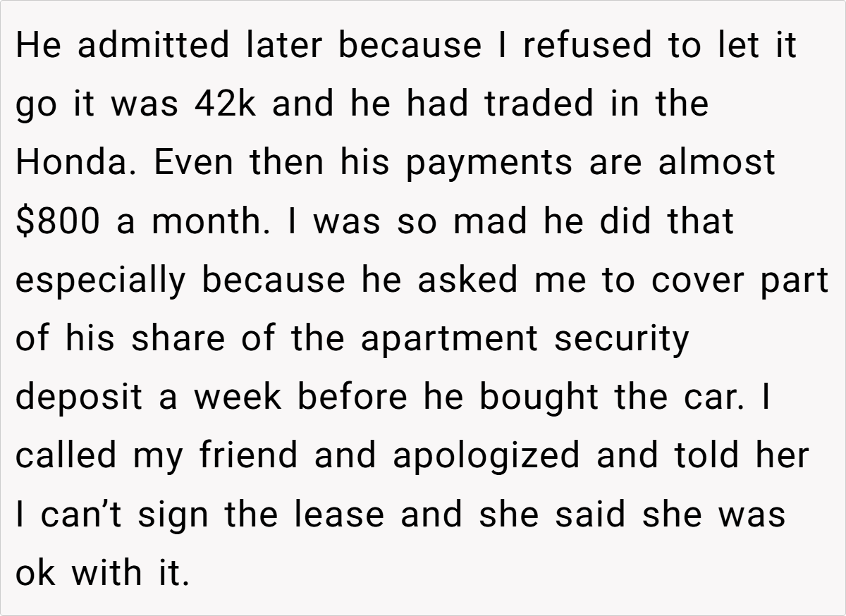 Faced with mounting financial concerns and an unwillingness to shoulder his irresponsible spending habits, the OP made the tough decision to cancel the apartment signing. What started as an opportunity for a fresh start together quickly turned into a turning point, forcing her to reconsider the foundation of their future as a couple. Could a single car purchase really jeopardize an entire living arrangement? It seems, in this instance, the answer is a resounding yes.