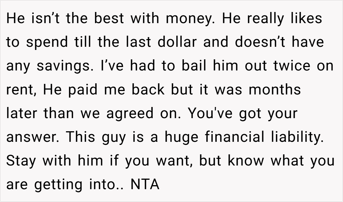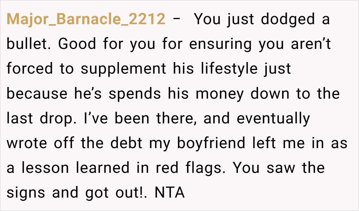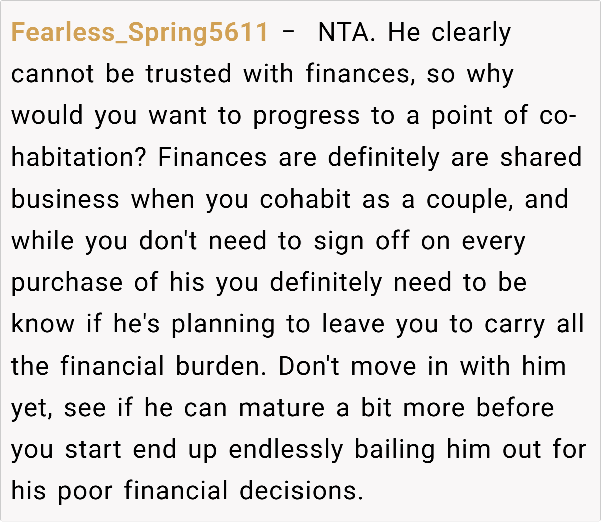 The Reddit community has been overwhelmingly supportive of the OP’s decision. Many commenters point out that if the boyfriend can’t manage his finances responsibly—despite earning a decent salary—it’s a major liability. One user remarked that she “dodged a bullet” by not moving in with someone whose impulsive spending could jeopardize both their futures.