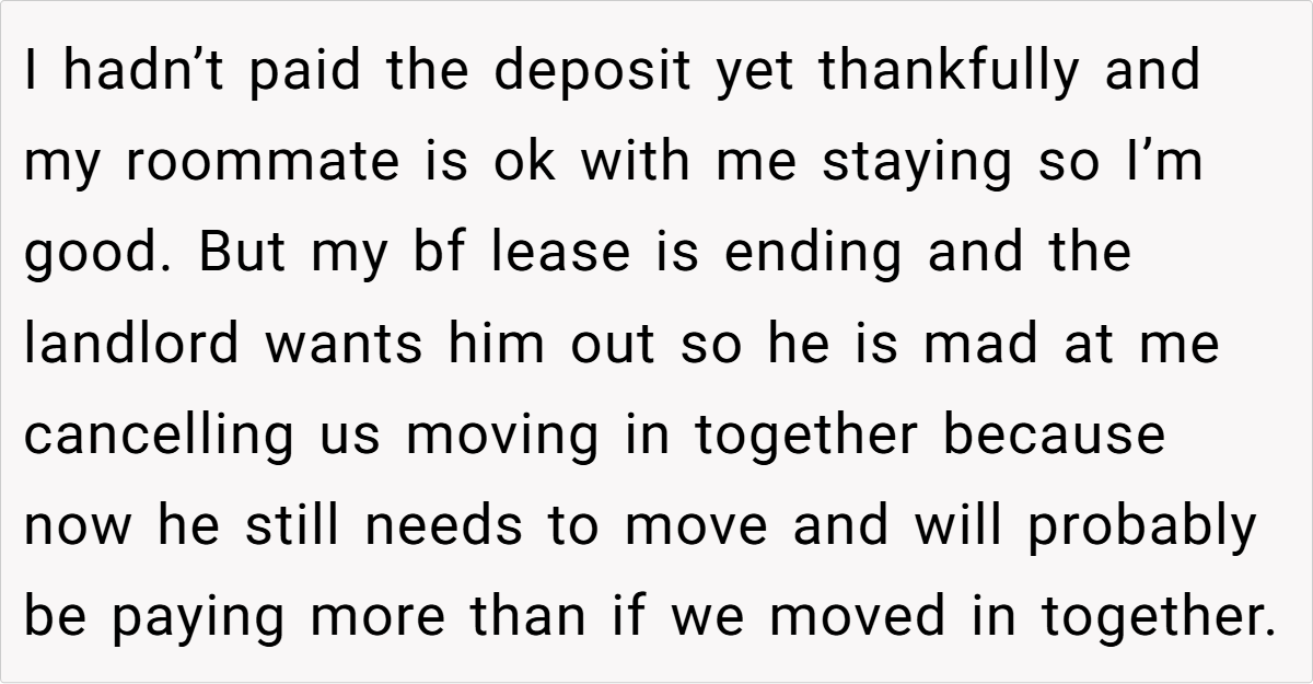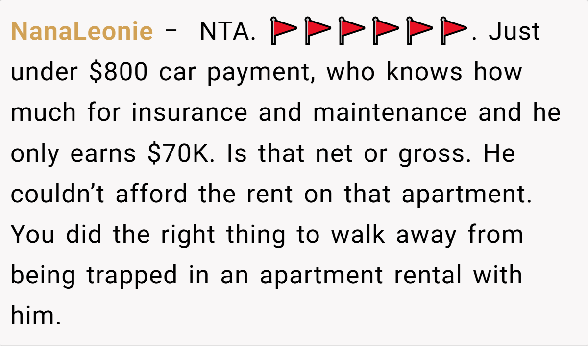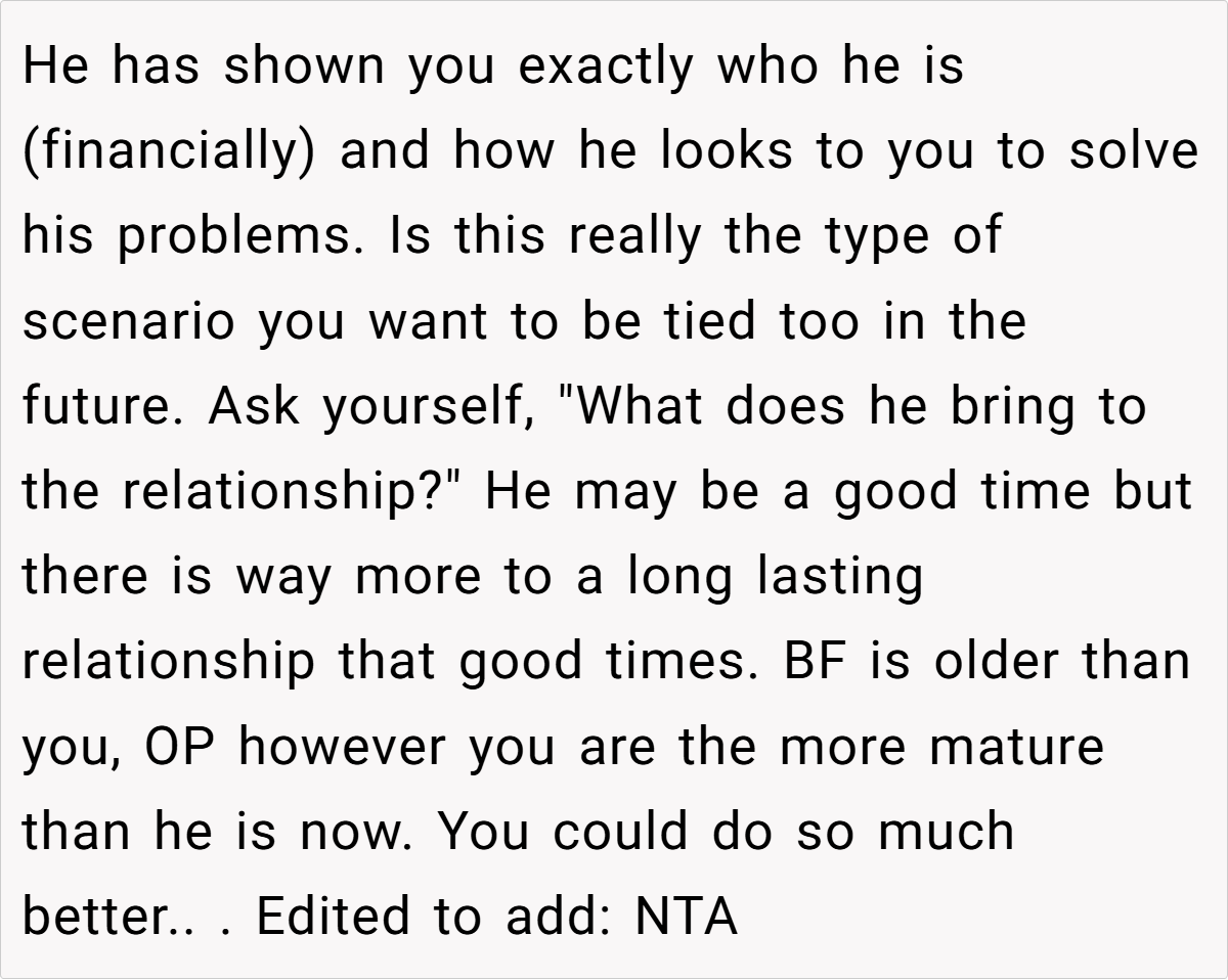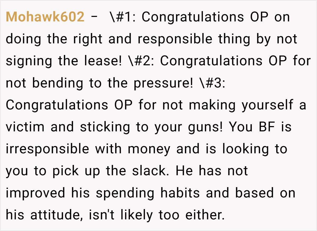 The Reddit community has been overwhelmingly supportive of the OP’s decision. Many commenters point out that if the boyfriend can’t manage his finances responsibly—despite earning a decent salary—it’s a major liability. One user remarked that she “dodged a bullet” by not moving in with someone whose impulsive spending could jeopardize both their futures.