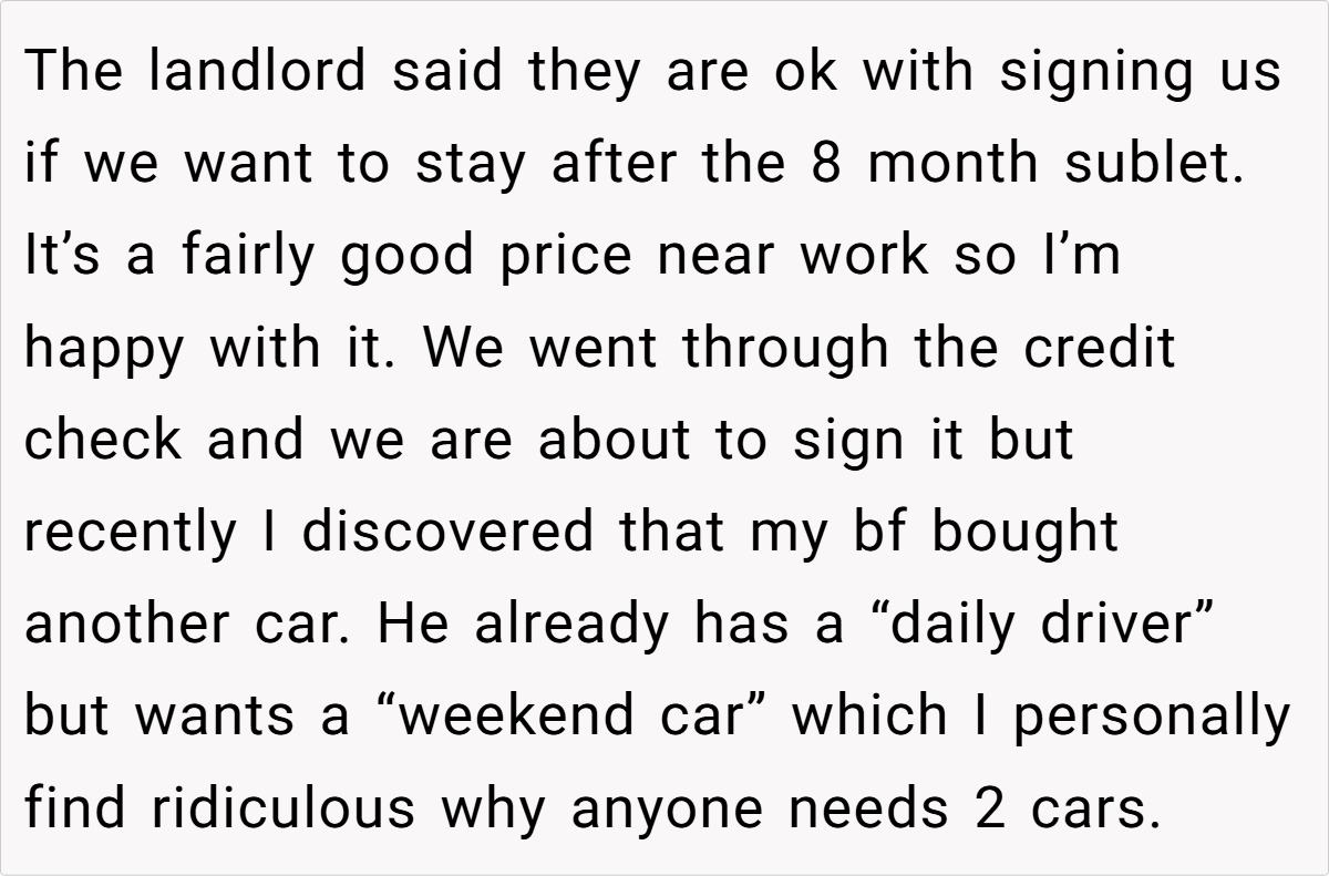 ‘AITA for cancelling our apartment signing after I found out that my bf bought an expensive car?’
