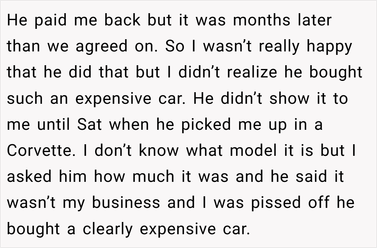 When financial red flags start flashing in a relationship, the repercussions can be felt in the most unexpected places—even on the eve of moving in together. In this case, our OP was all set to sign a promising lease on a cozy apartment when she discovered a shocking twist: her boyfriend had splurged on an expensive car. After years of stretching every dollar, covering late rent payments, and bailing him out more than once, the revelation that he’d traded in his practical Honda Accord for a flashy Corvette worth $42,000 was more than just surprising—it was a deal-breaker.