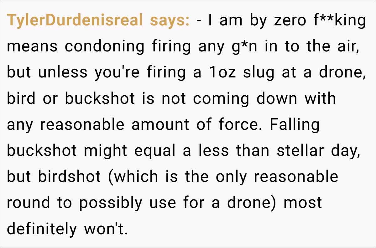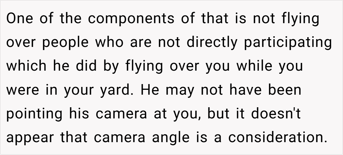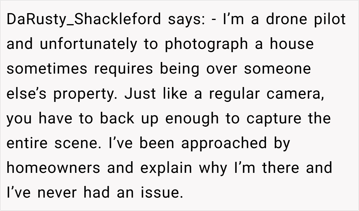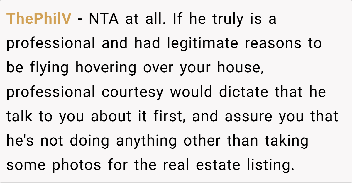However, others suggest that a more measured approach might have defused the situation better, recommending that they calmly request the drone operator to leave their property instead of engaging in a shouting match. The overall sentiment is that while the anger was understandable, there may have been less confrontational ways to address the issue.