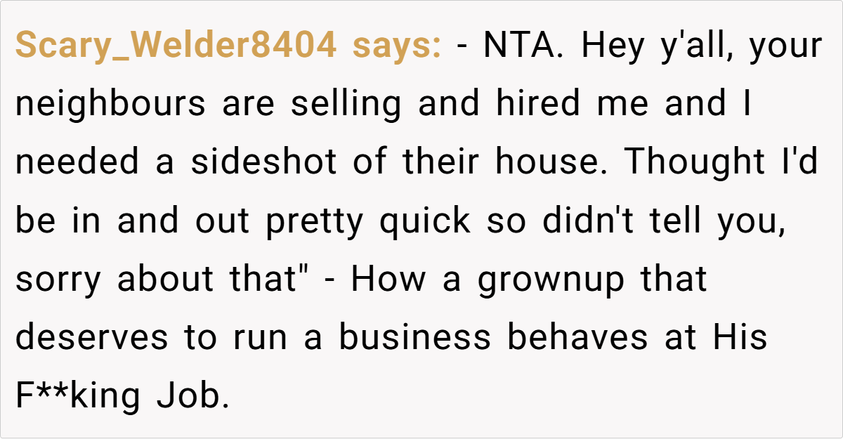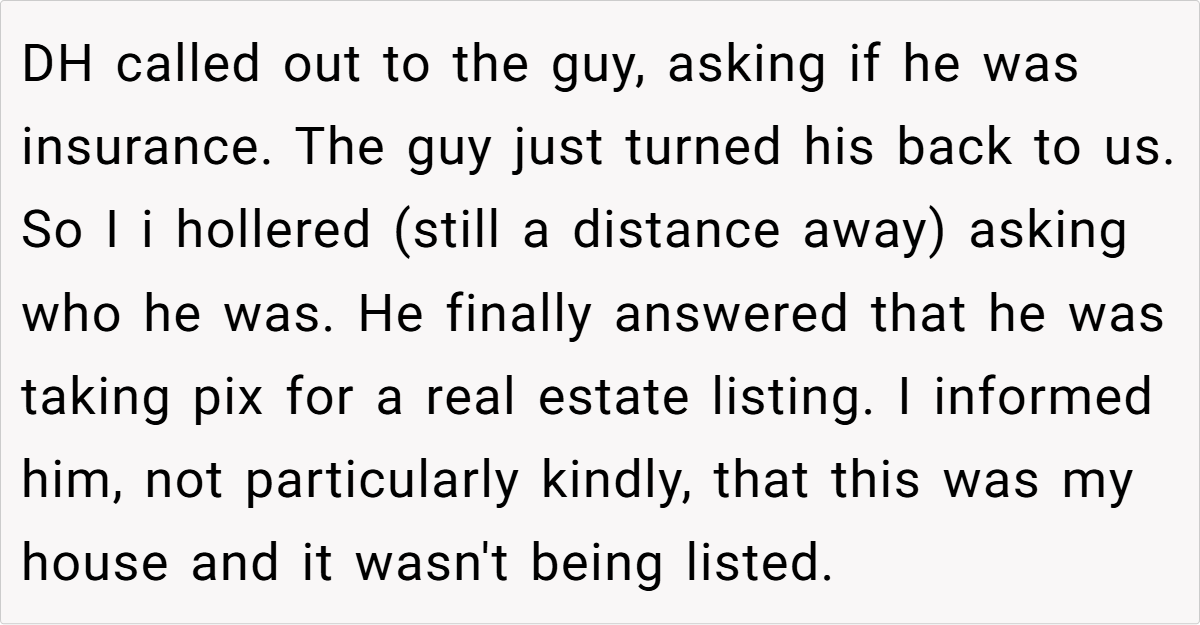 Frustrated by what they perceived as an invasion of their privacy and misrepresentation about whose property was being photographed, they ended up “chewing out” the guy on the spot. Was their reaction justified, or should they have handled the situation differently?