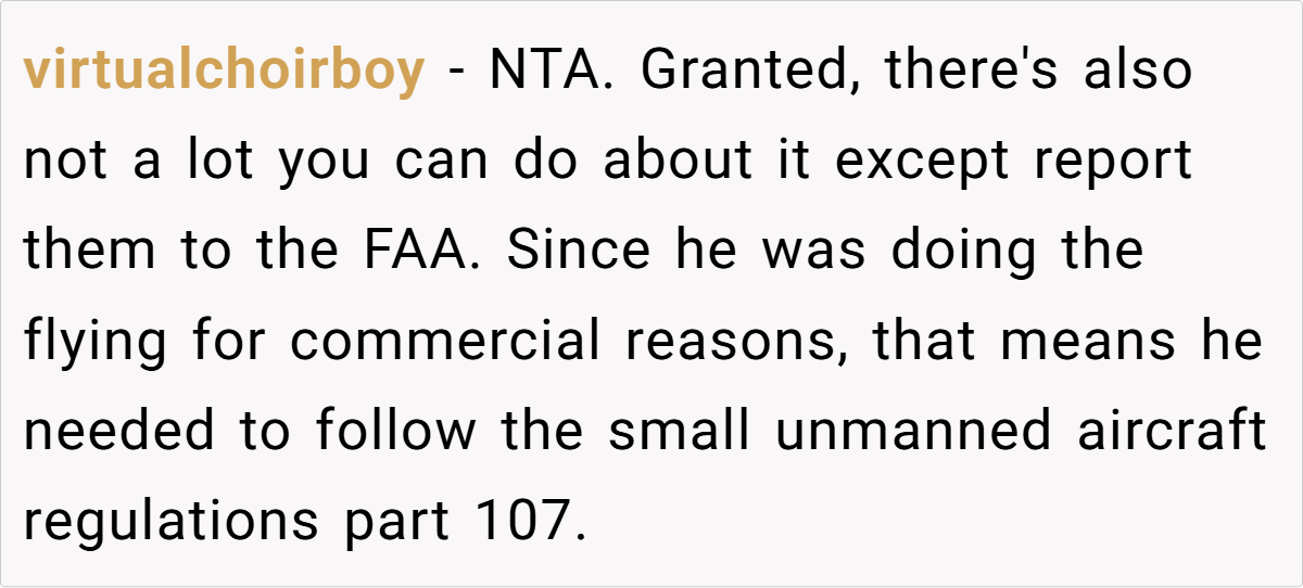 Many redditors empathize with the couple, arguing that if someone were to fly a drone over their backyard, they would likely feel the same violation of privacy. They commend the couple for standing up for themselves, especially after being met with dismissive and gaslighting behavior from the operator.