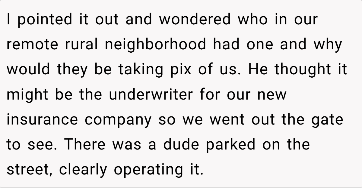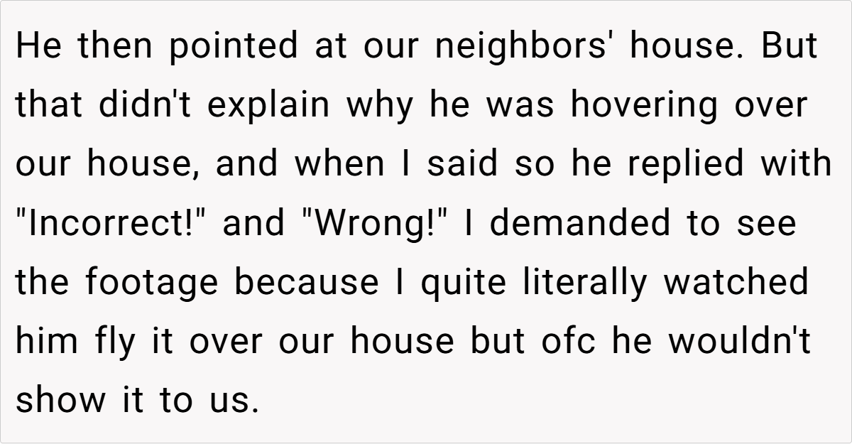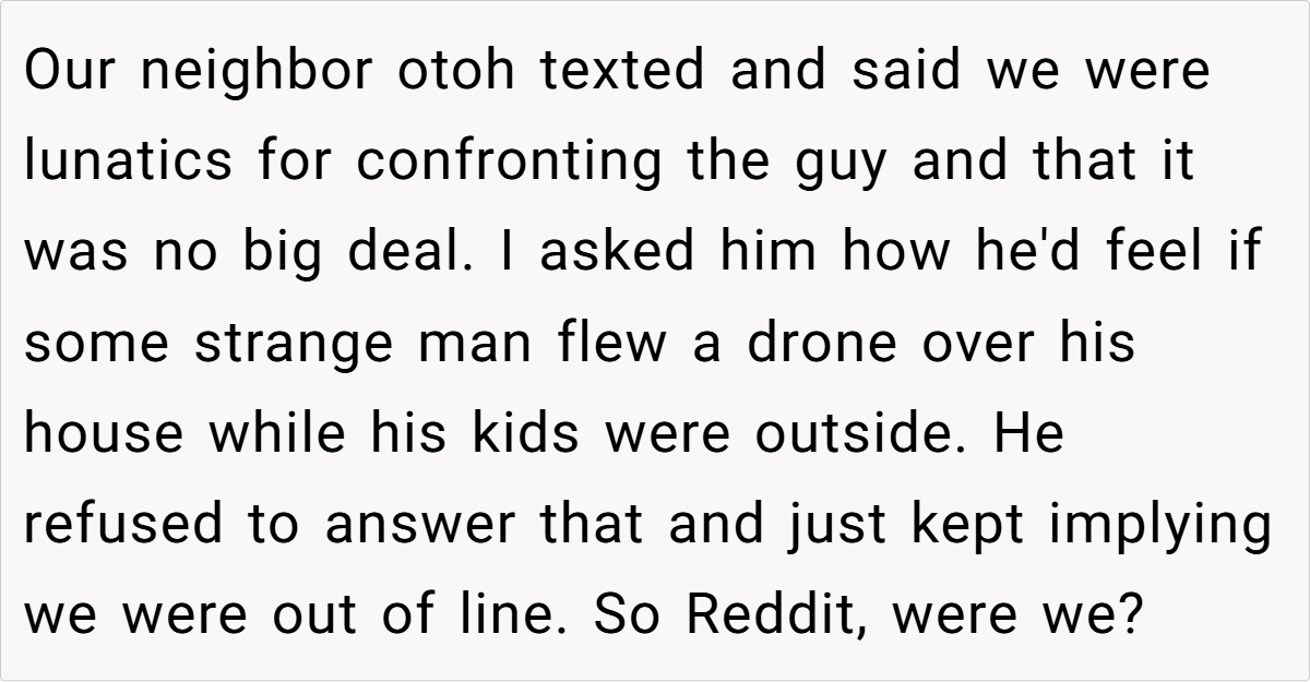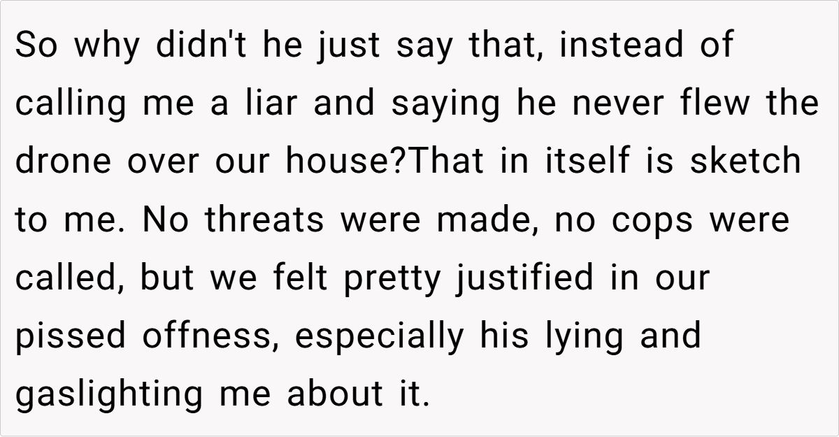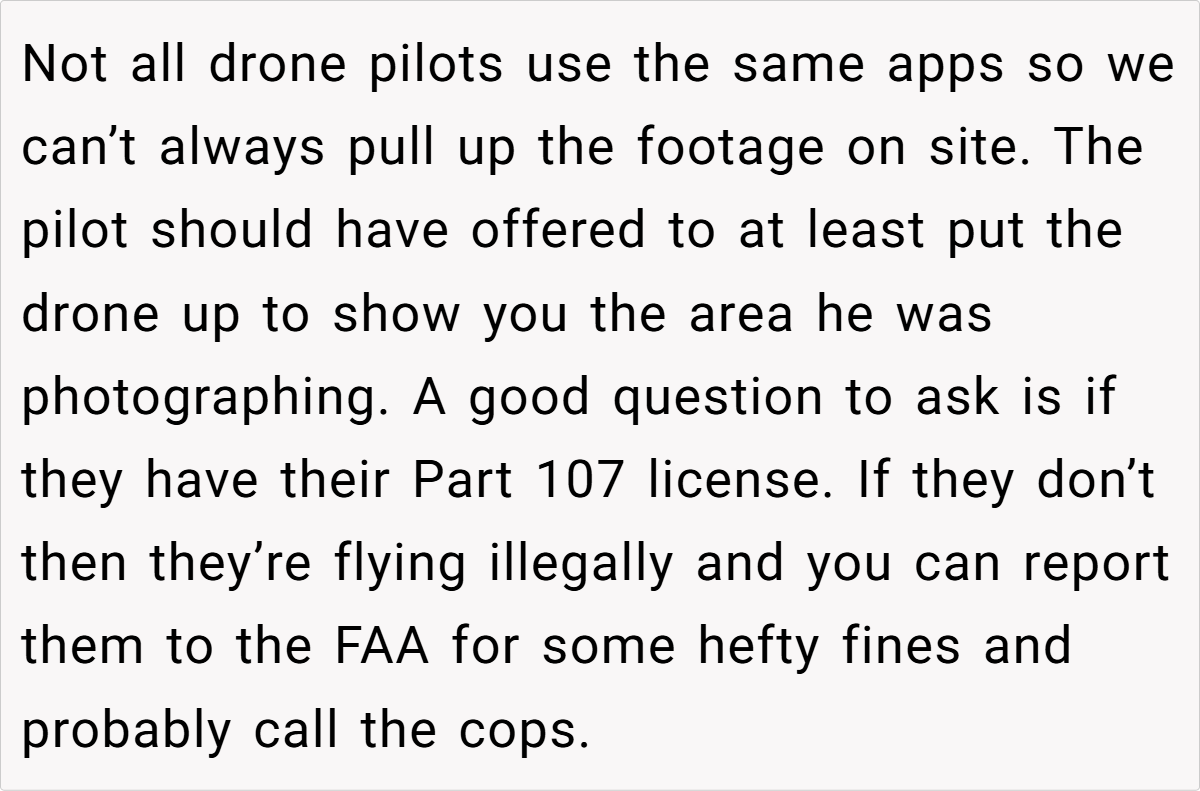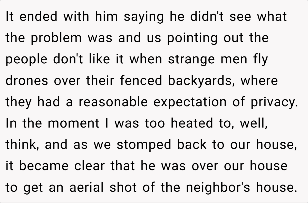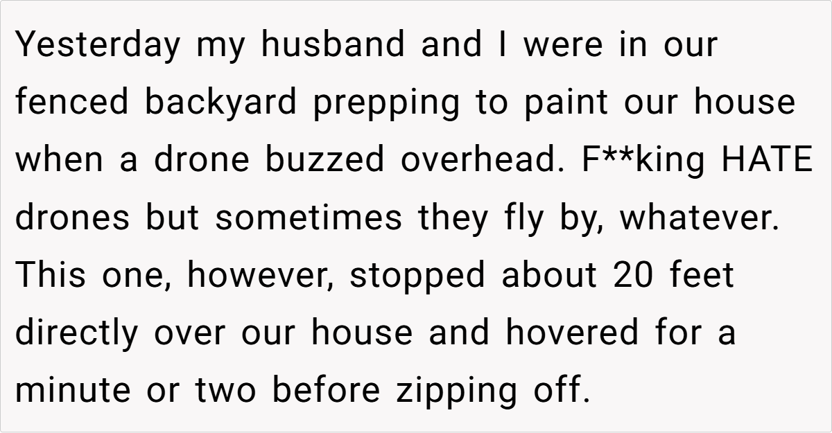 What do you think—were they right to “chew out” the drone guy, or should they have handled it more calmly? Share your thoughts, experiences, and advice below to help us navigate the delicate balance between asserting privacy rights and maintaining civility.