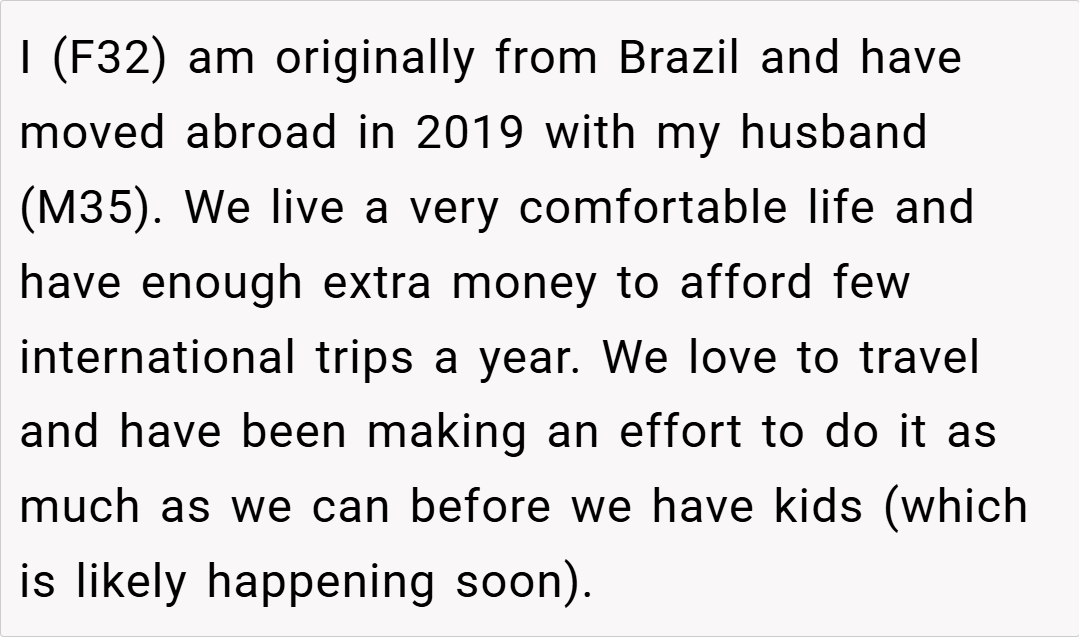 Family expectations can sometimes clash with personal dreams. I (32F), originally from Brazil, moved abroad in 2019 with my husband (35M). We both love traveling and take advantage of our extra funds to enjoy a few international trips each year before starting a family.
