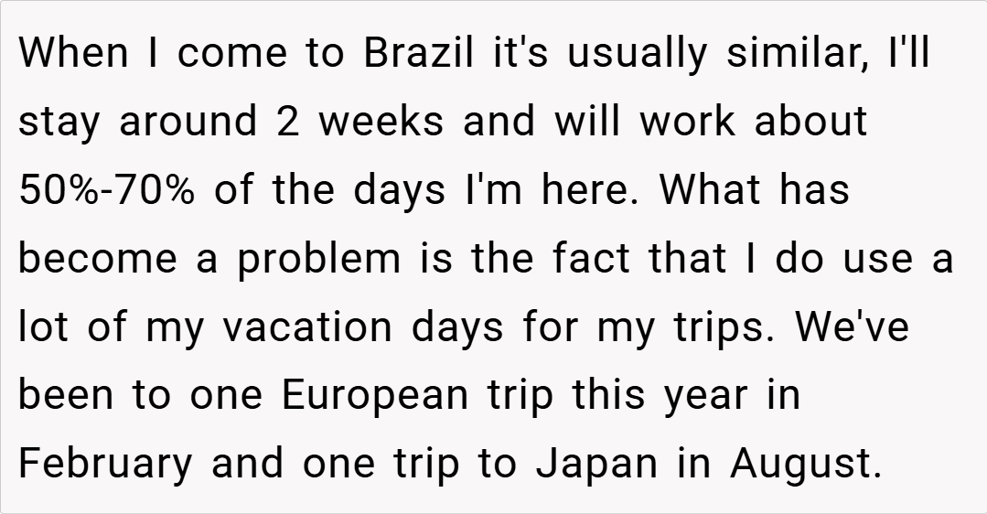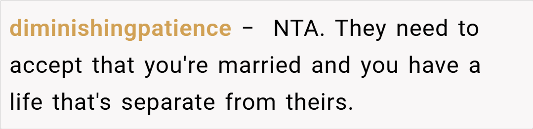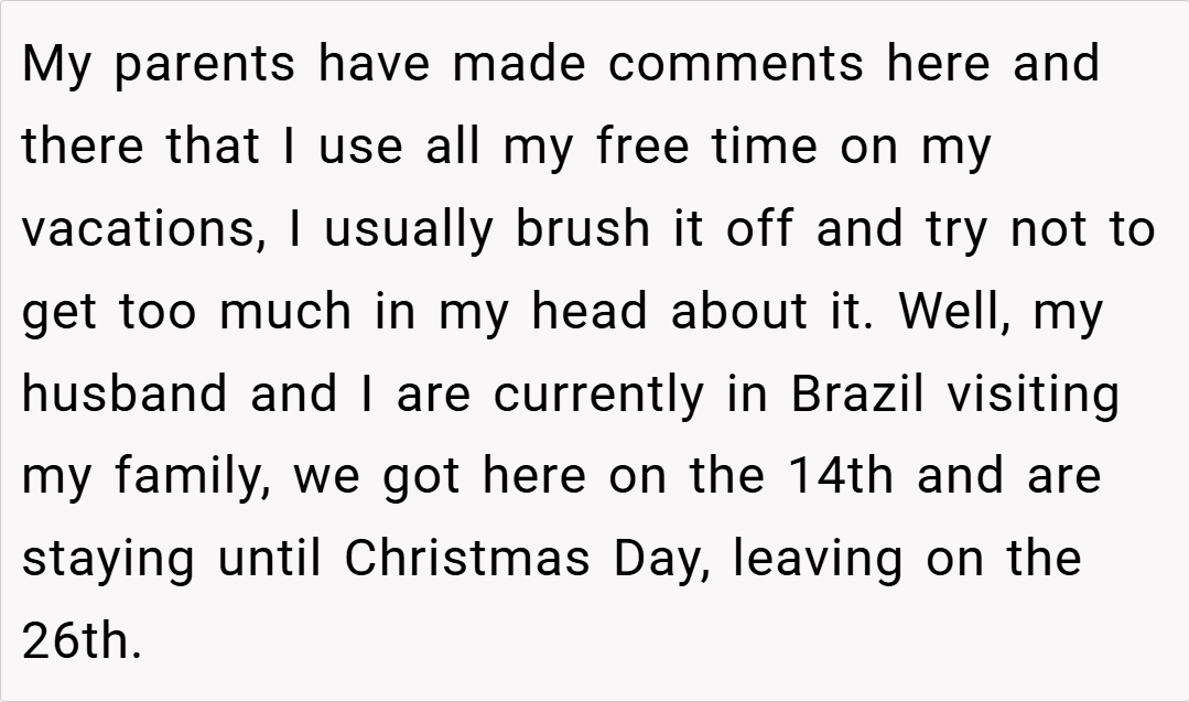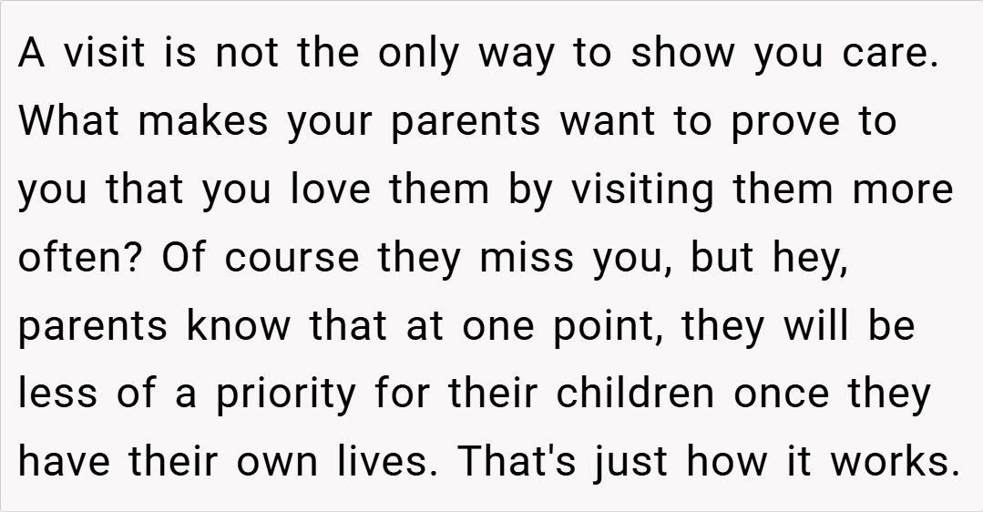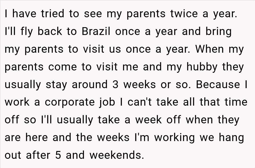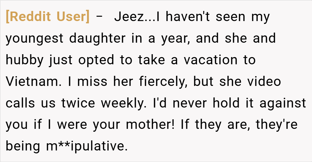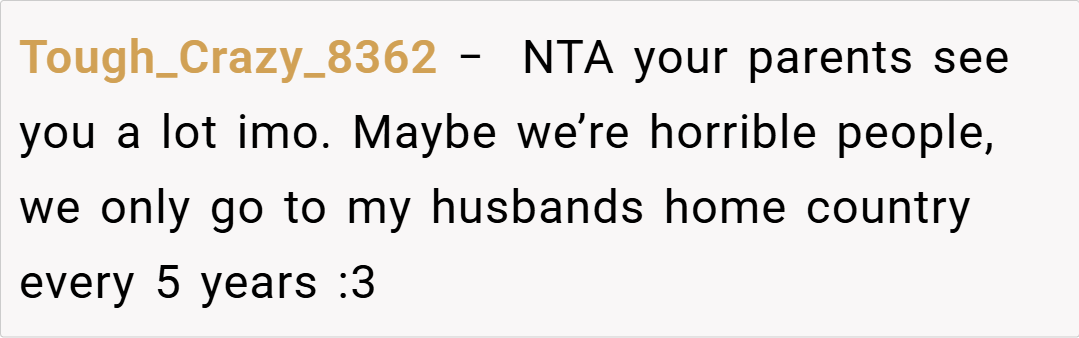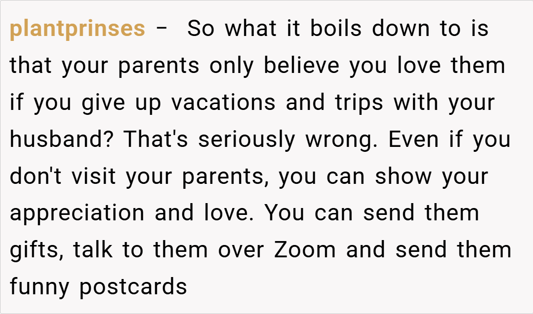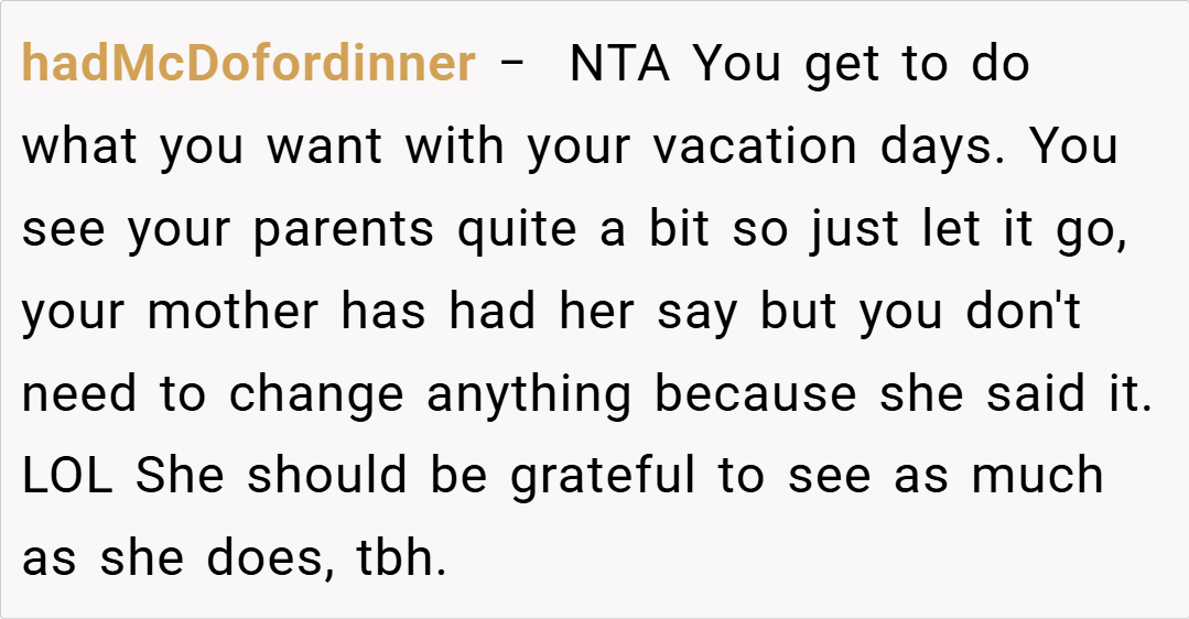 Several redditors expressed support for your decision. One user commented, “If you’ve been consistent about visiting your parents, using your vacation for a trip with your husband is perfectly reasonable. You’re allowed to pursue your own happiness too.”