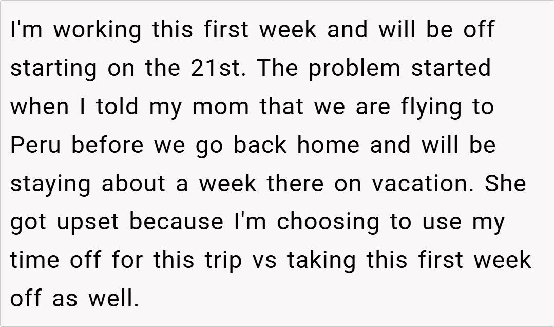 However, recently a conflict arose when I announced that we would be flying to Peru for a week-long vacation before returning home. My mother was upset because I chose to use my vacation days for this trip instead of spending that extra time with her. Now I’m questioning if I’m being selfish for prioritizing travel with my husband over more time with my parents.