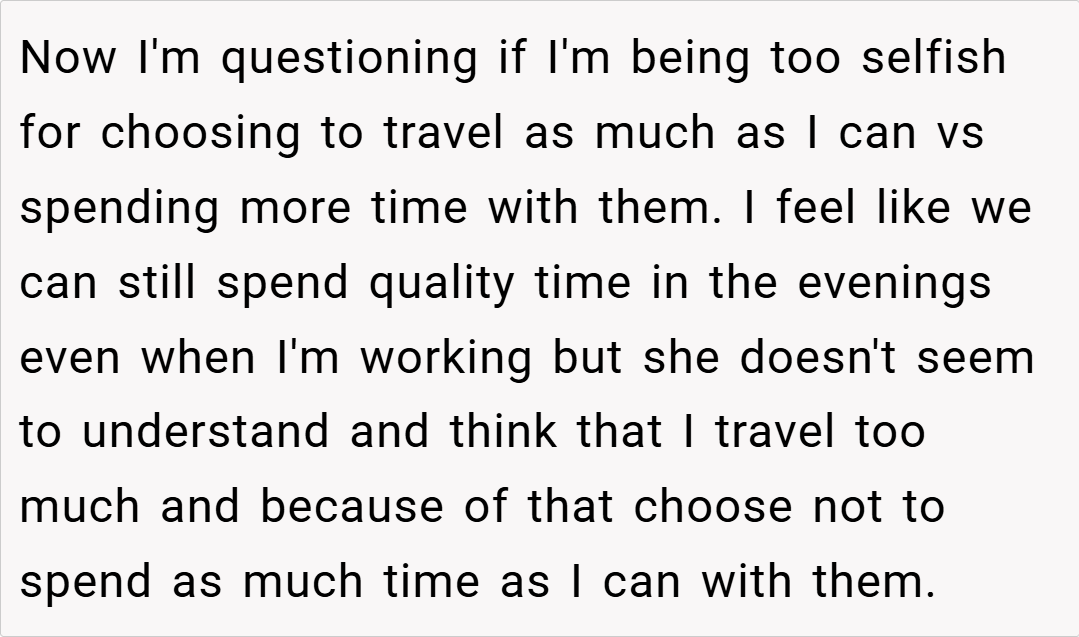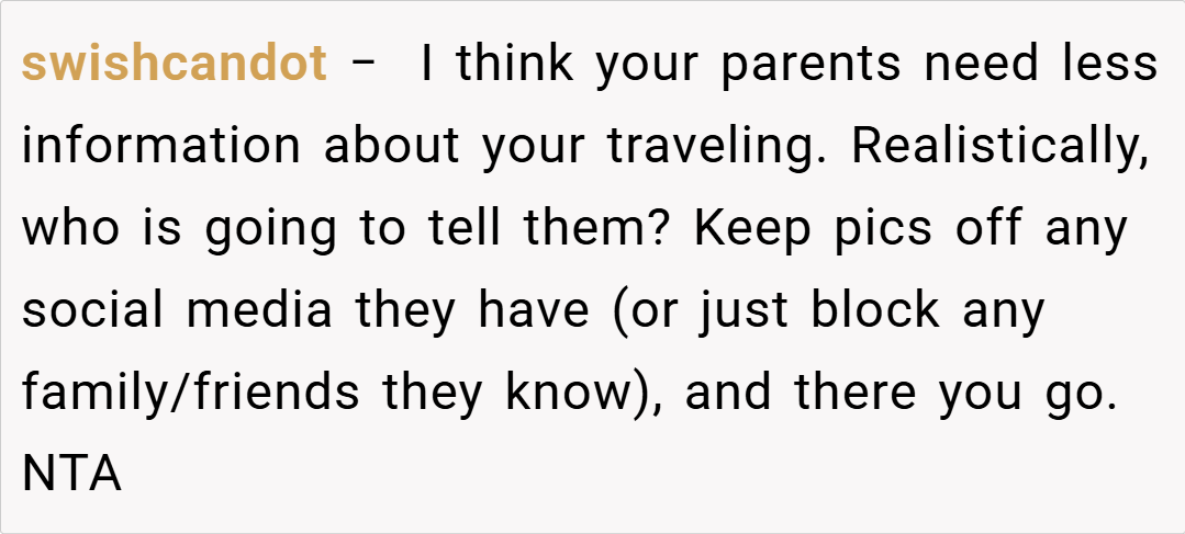 Another commenter shared, “Traveling together as a couple is important for your relationship, especially when you’re planning a future family. As long as you’re making time for your parents when you’re home, you’re not the asshole.”