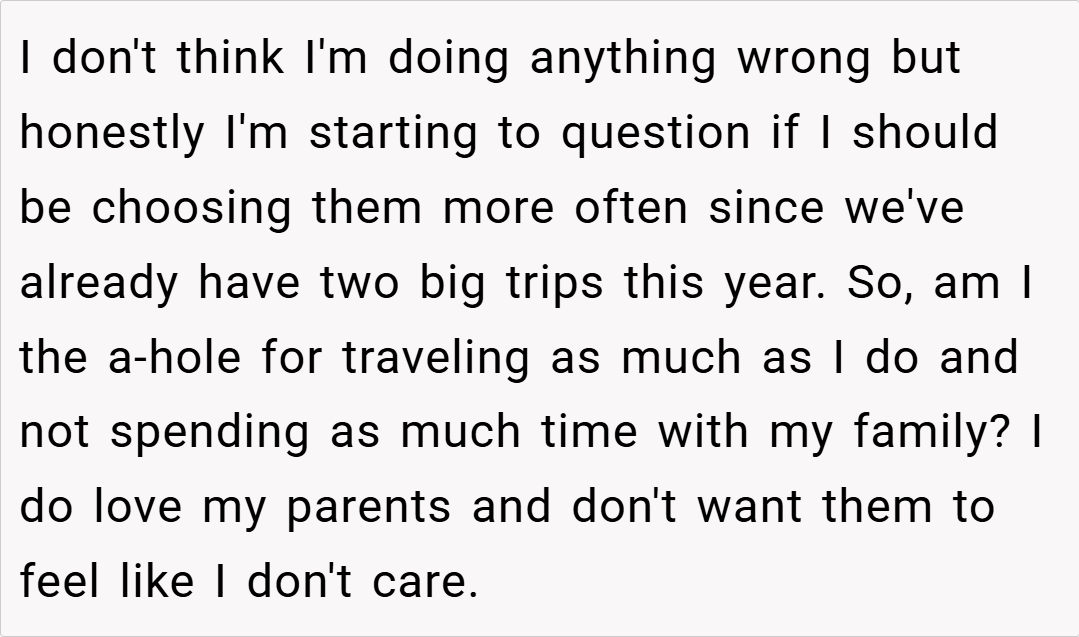 ‘ AITA for choosing to go on a trip with my husband instead of spending more time with my parents?’