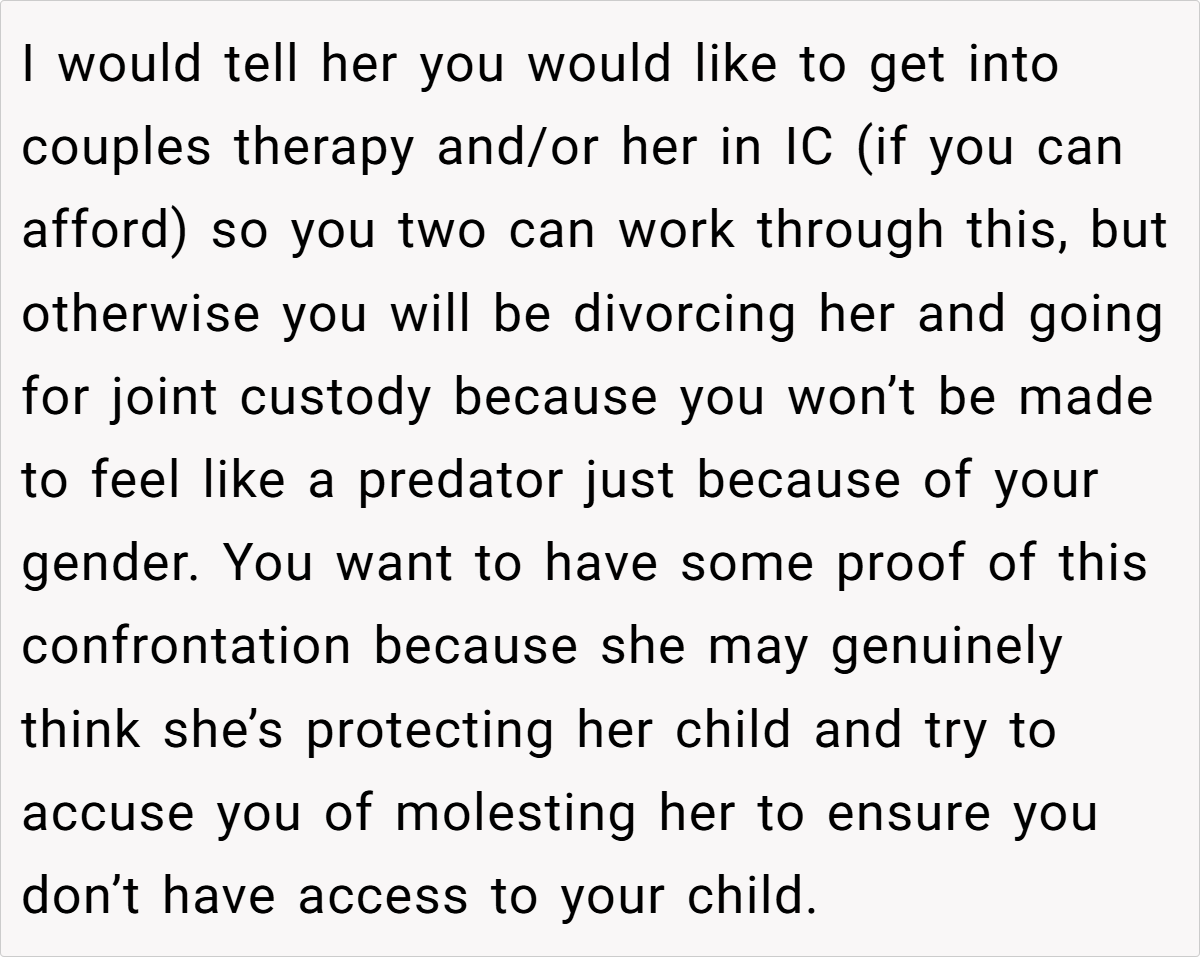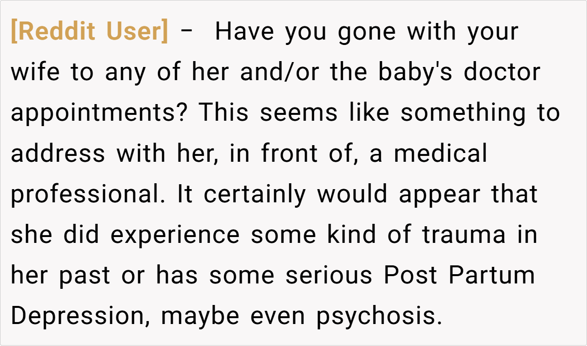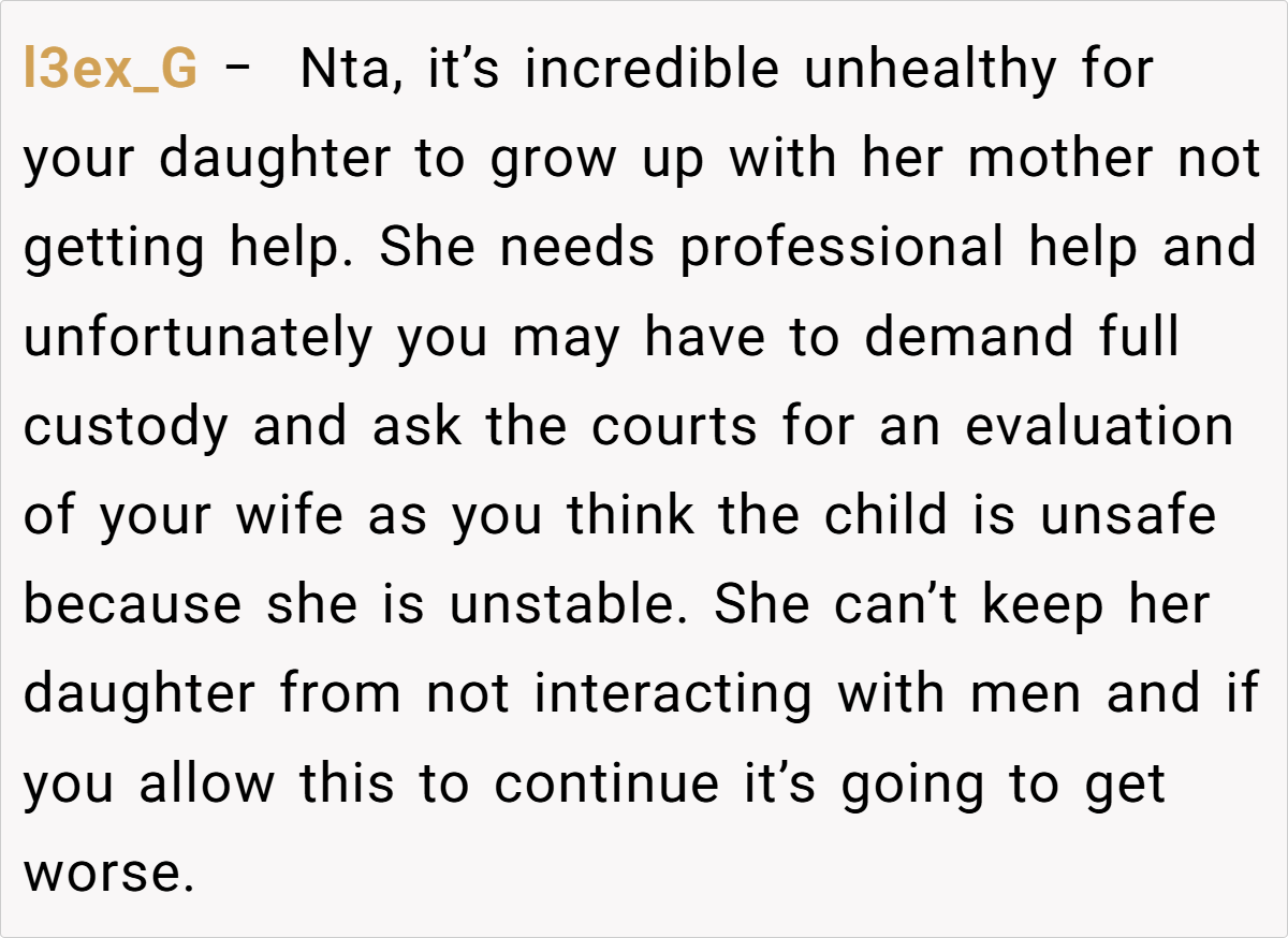 Examining the issue further, it appears that the wife’s actions could stem from personal experiences that have left her with an overwhelming fear of male intentions. The father’s repeated attempts at open conversation have been met with silence or vague explanations, suggesting that the roots of her behavior might be buried in unresolved trauma or even postpartum anxiety.