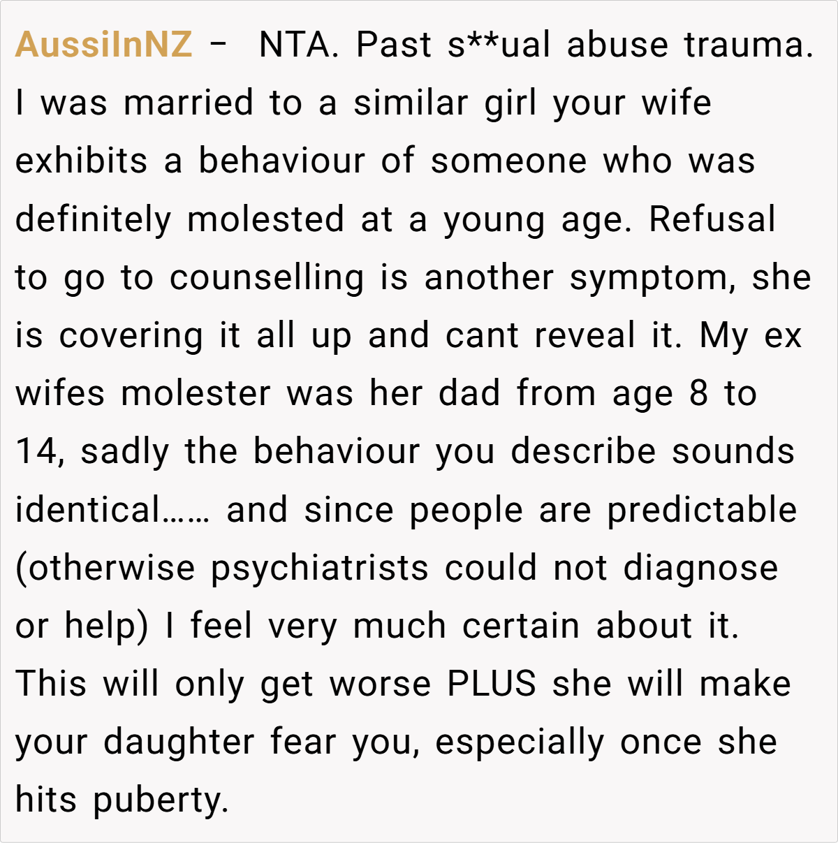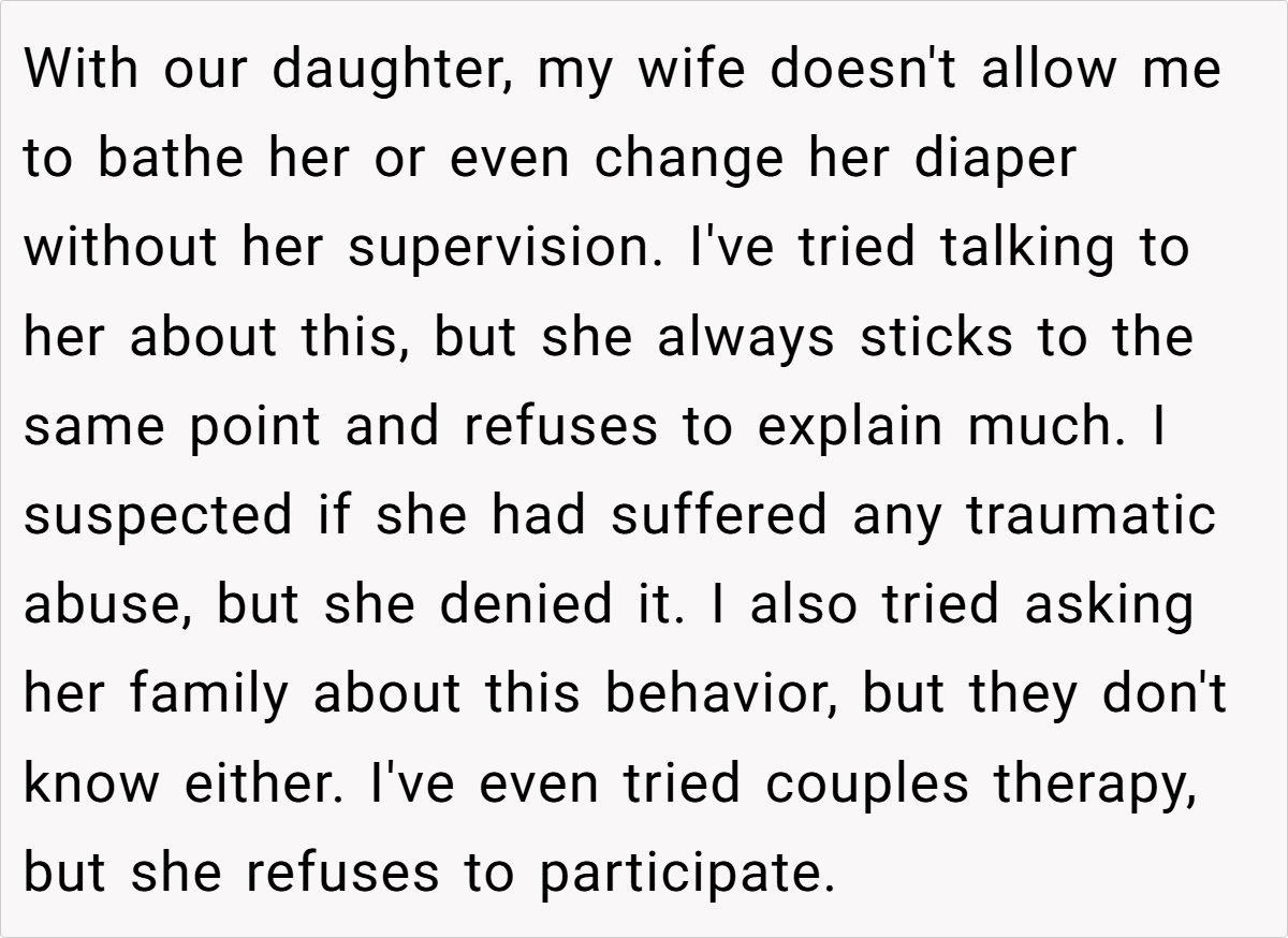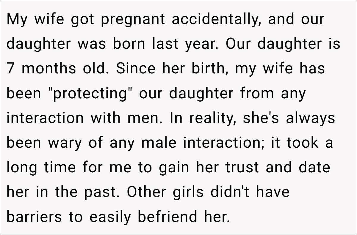 In this situation, the wife’s extreme caution around male interactions—especially when it comes to caring for her own daughter—may hint at a deeper emotional or psychological struggle. Such behavior, while perplexing, is not entirely uncommon when past traumas or unresolved anxieties are left unaddressed. It raises questions about trust and the fine line between care and control.