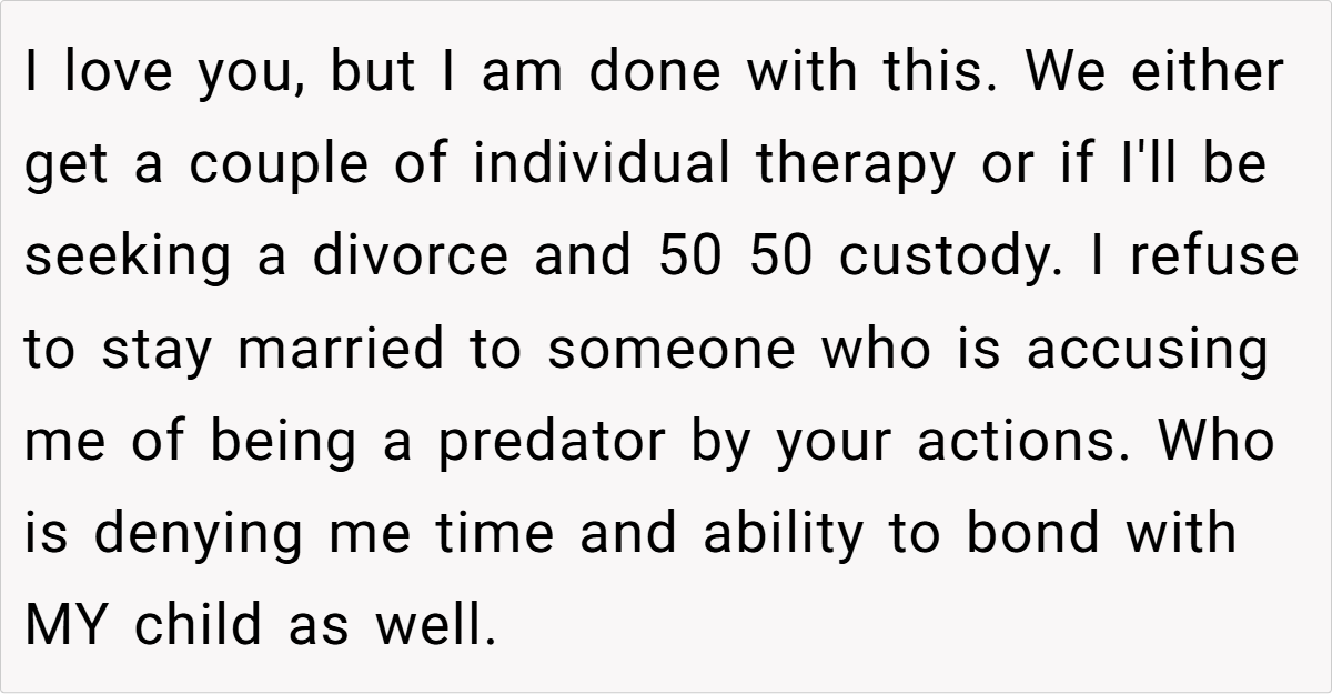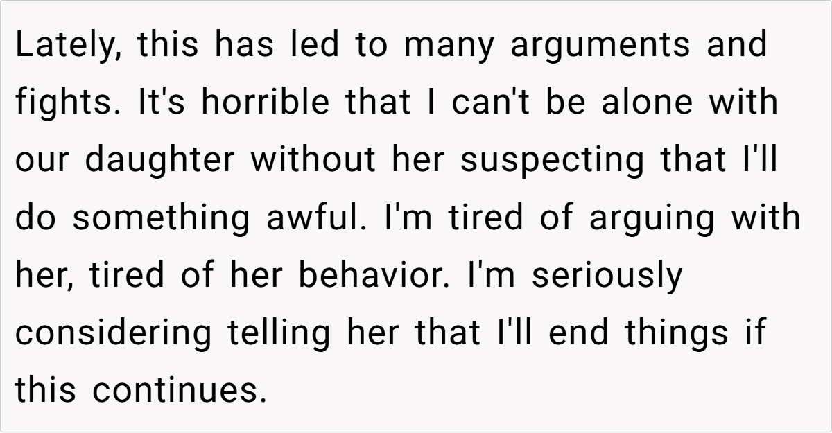 ‘AITA for considering ending things with my wife because she refuses to let me be alone with our daughter?’