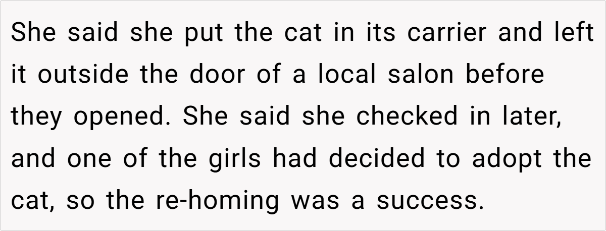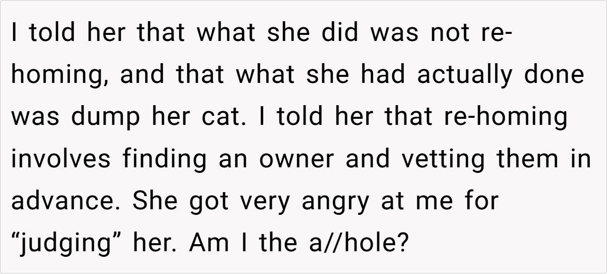 One Reddit user found herself in the middle of this controversy when her friend proudly shared a story of how she “rehomed” her cat. The catch? She left it outside a local salon in a carrier, hoping someone would take it. When the OP (Original Poster) pointed out that this was actually pet abandonment, her friend became furious. Now, OP is wondering: Was I too judgmental, or was my friend really in the wrong?