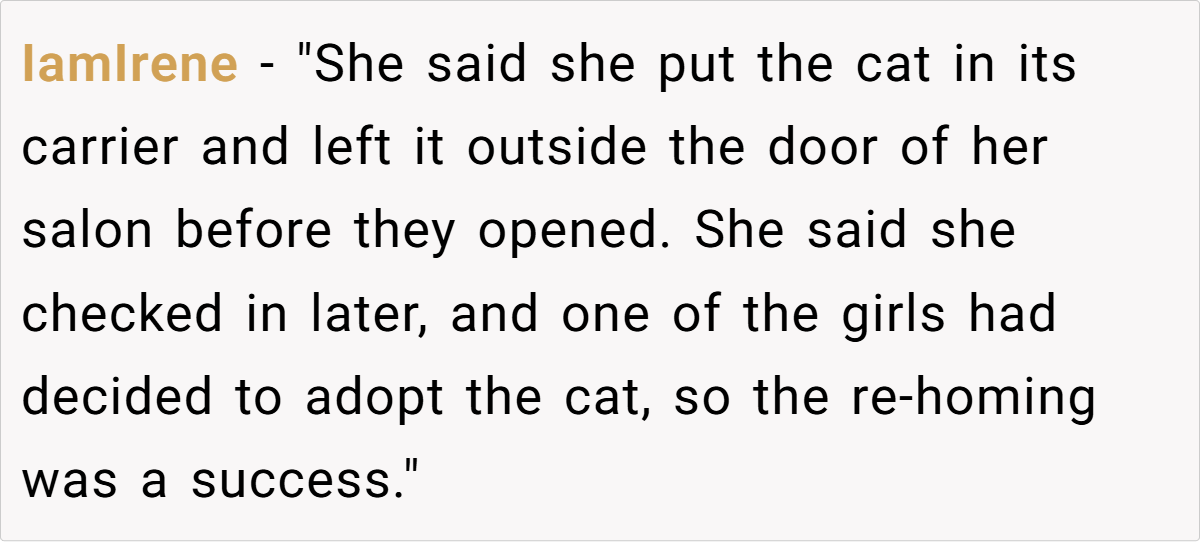 While OP’s friend may think she found a convenient solution, what she did is considered animal abandonment, which is illegal in many places. According to the American Veterinary Medical Association (AVMA), responsible pet ownership includes ensuring animals are placed in safe, stable environments when they can no longer be cared for (Source). Simply leaving a pet outside a business and hoping for the best is neither ethical nor responsible.