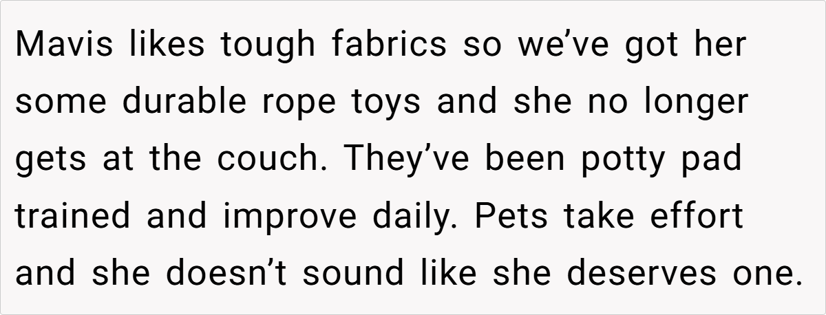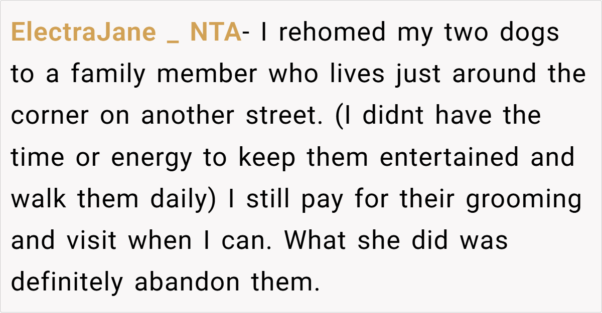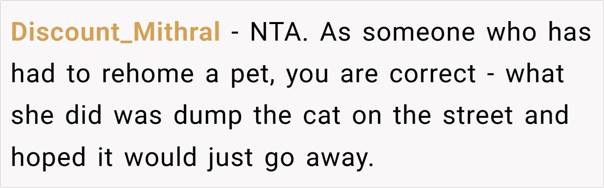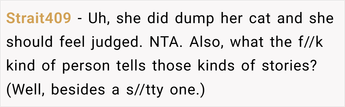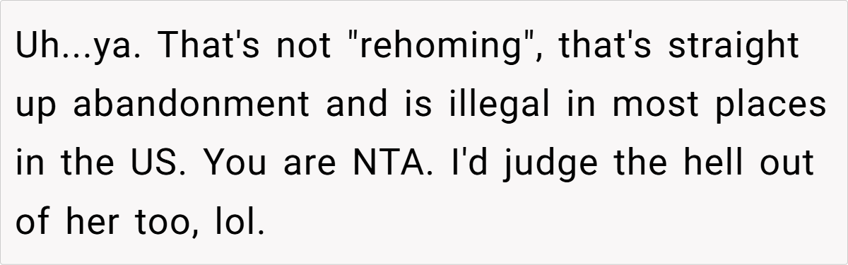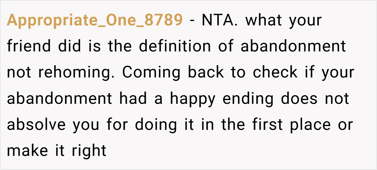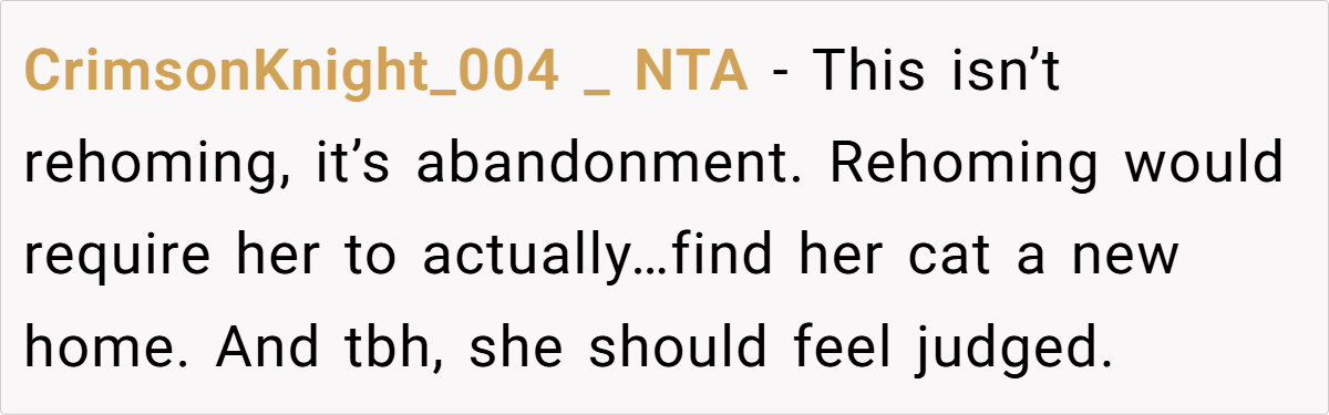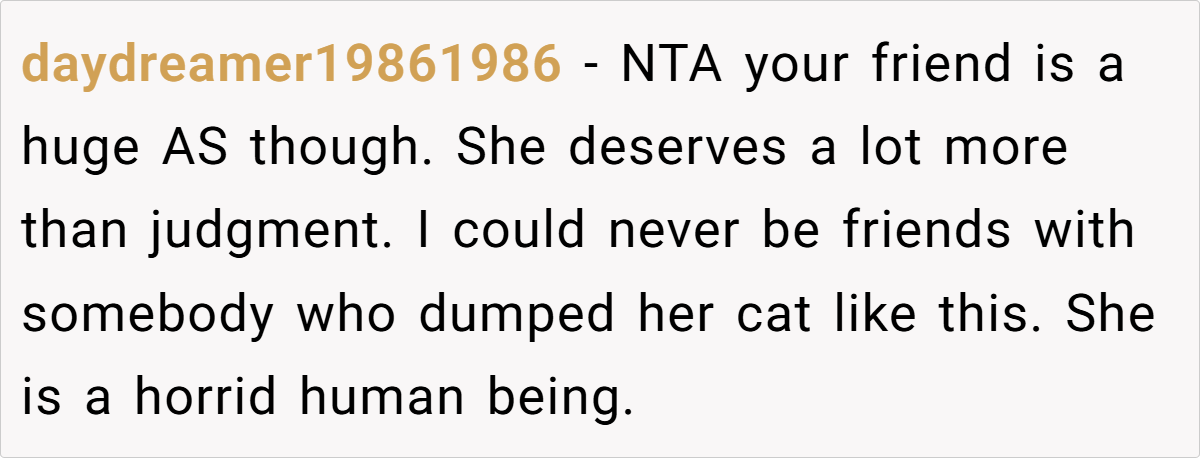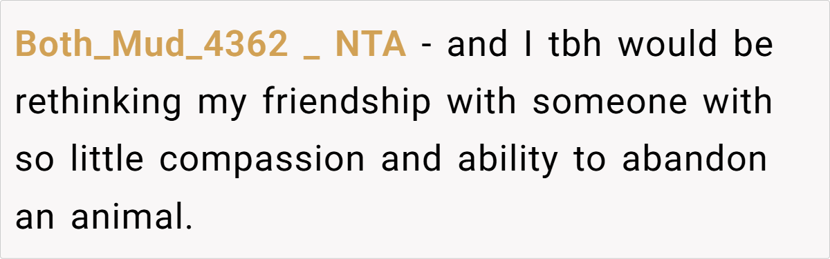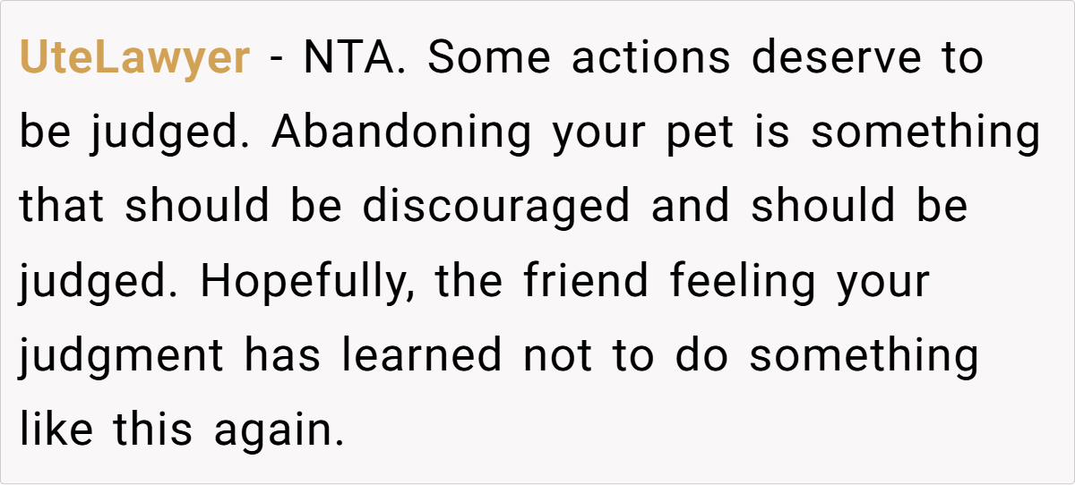 The overwhelming consensus? OP was absolutely right to judge her friend. Abandoning a pet isn’t just morally questionable—it’s dangerous for the animal and can even be illegal. Responsible pet ownership means putting in effort, even when it’s inconvenient.