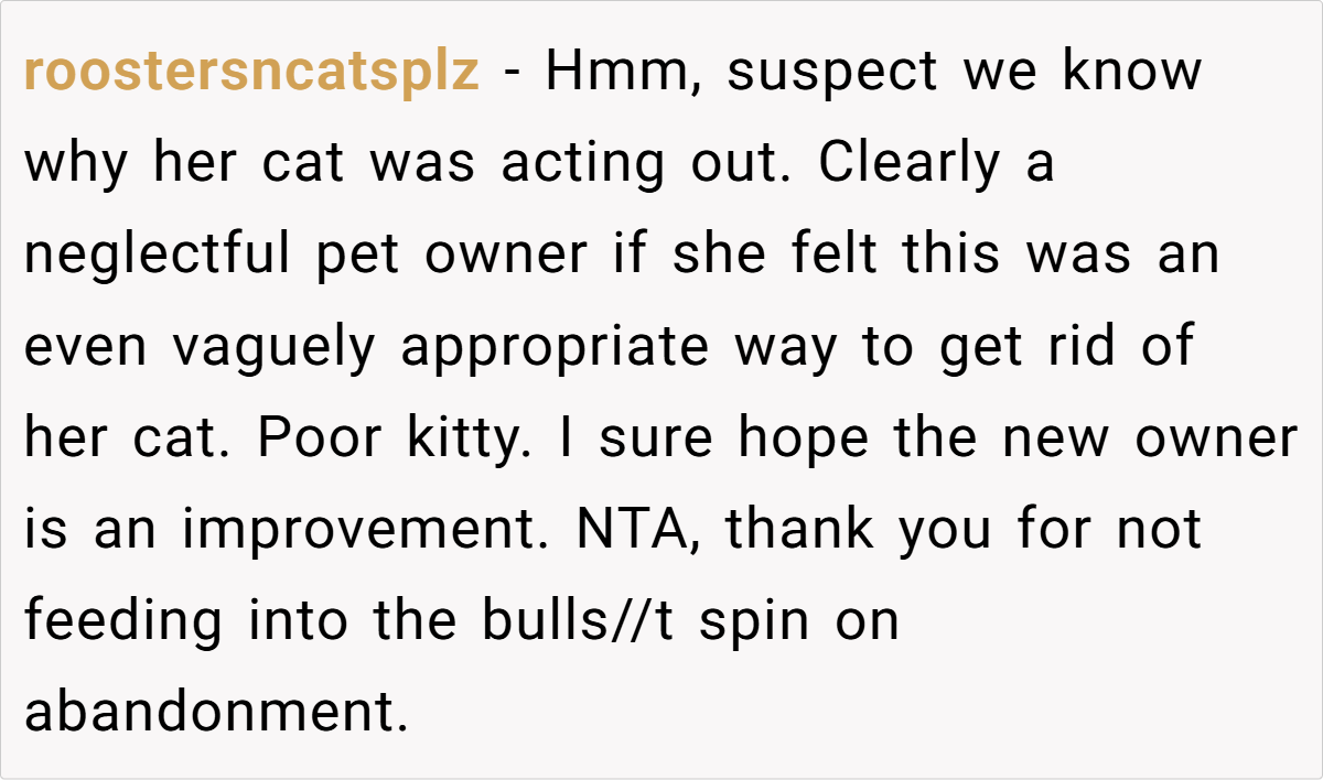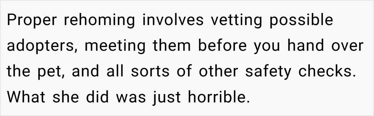 Instead of consulting a veterinarian or an animal behaviorist, OP’s friend decided to take the easiest route—abandoning the pet without ensuring its safety. This decision shows a fundamental misunderstanding of pet ownership. A responsible owner should first attempt to understand and resolve the issue before making the drastic choice of rehoming.