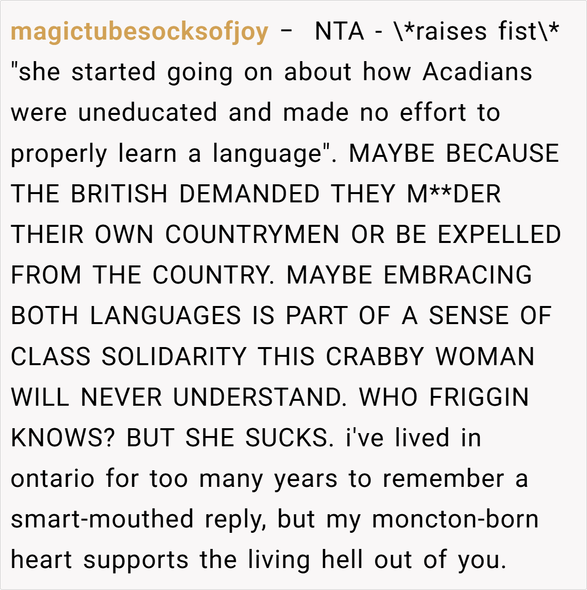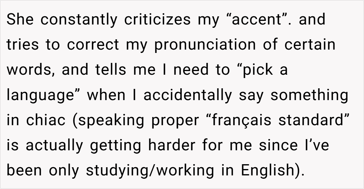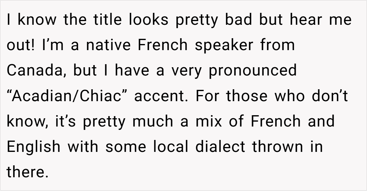 Languages are more than just a means of communication; they are deeply tied to identity and heritage. Linguist Dr. John McWhorter notes, “Language is a living, breathing entity that reflects the culture and history of its speakers.” The OP’s use of Chiac is not merely a linguistic choice; it embodies her cultural background and personal experiences. The aunt’s dismissive attitude toward this dialect not only undermines the OP’s identity but also perpetuates harmful stereotypes about Acadian culture.