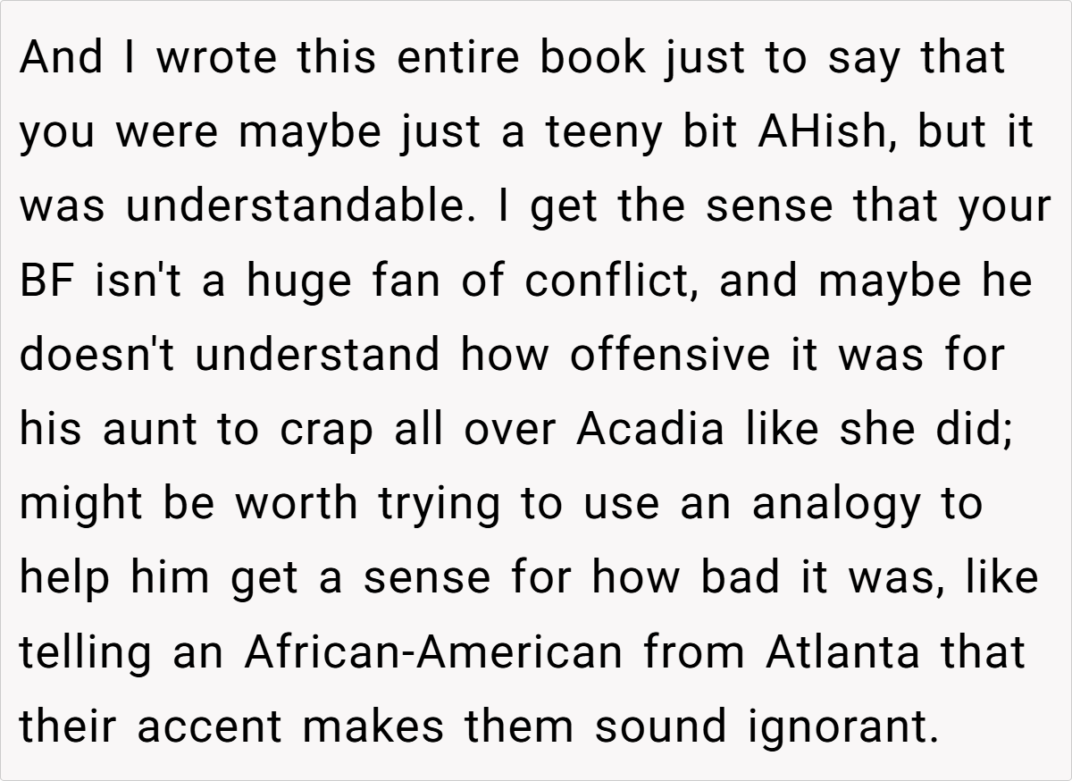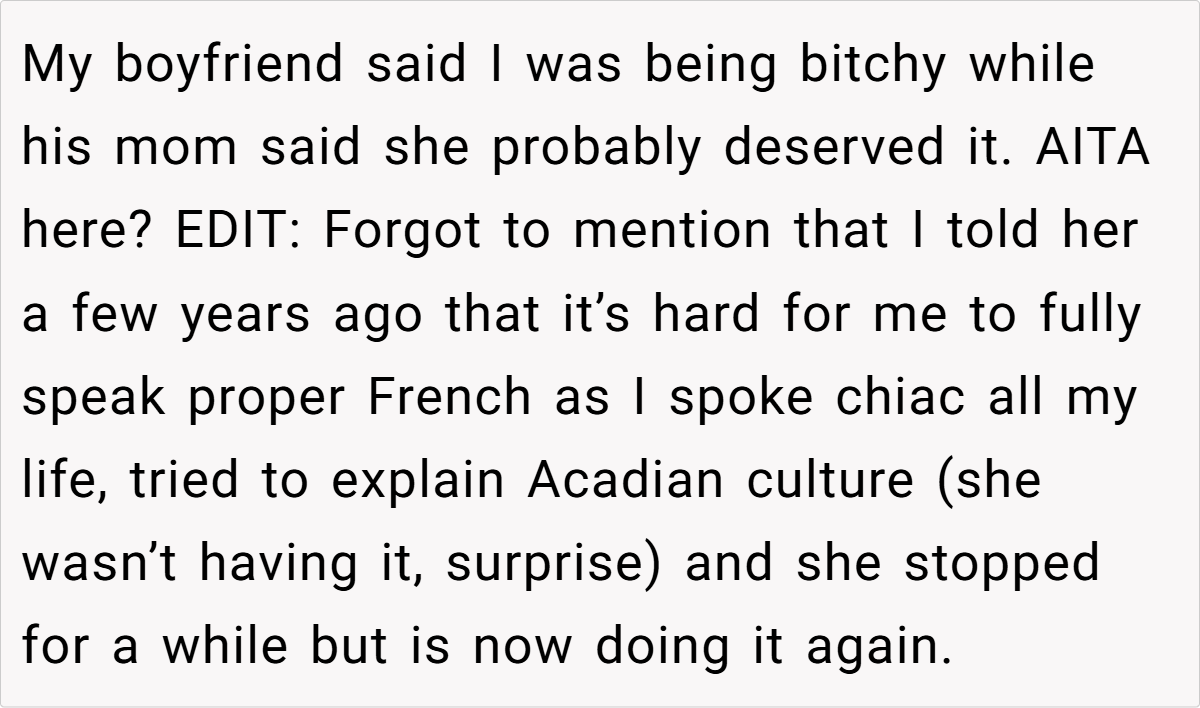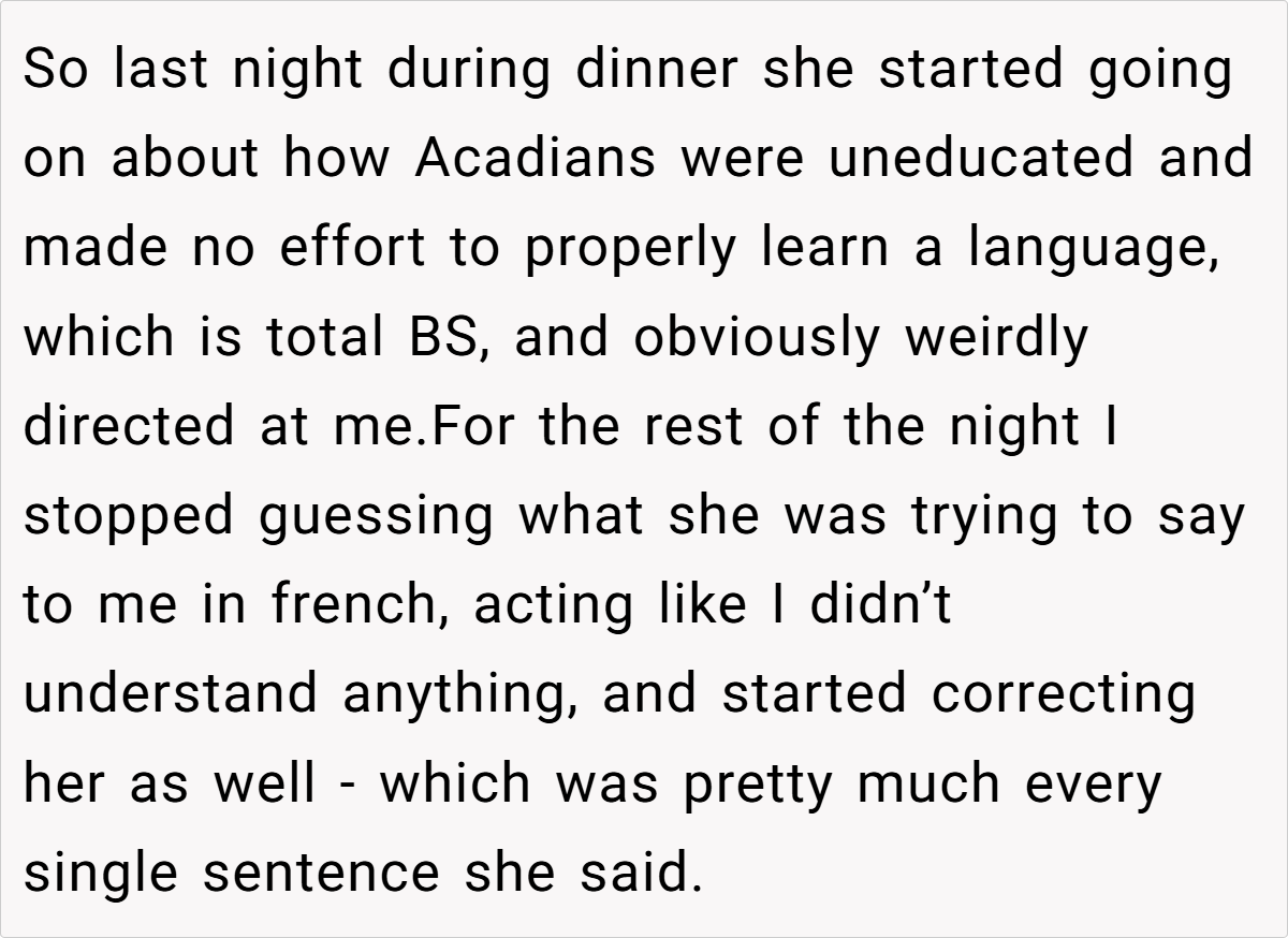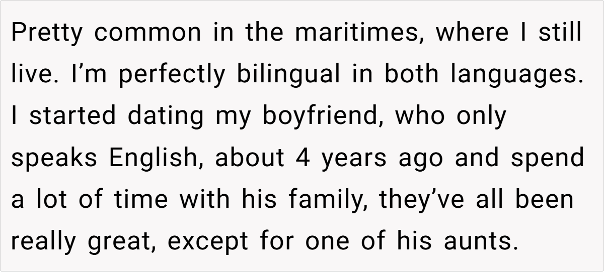 The OP has been in a relationship with her English-speaking boyfriend for four years, spending ample time with his family. While most of them are welcoming, one aunt, a former French teacher, insists on speaking French exclusively with her, despite the OP’s Acadian accent and dialect. The aunt’s consistent criticism and condescending remarks about the OP’s language skills culminate in an offensive comment about Acadians being uneducated. Frustrated, the OP starts correcting the aunt’s French, leading to a tense standoff that leaves the aunt angry and the OP questioning her actions.