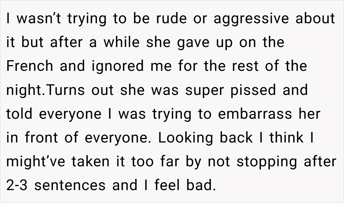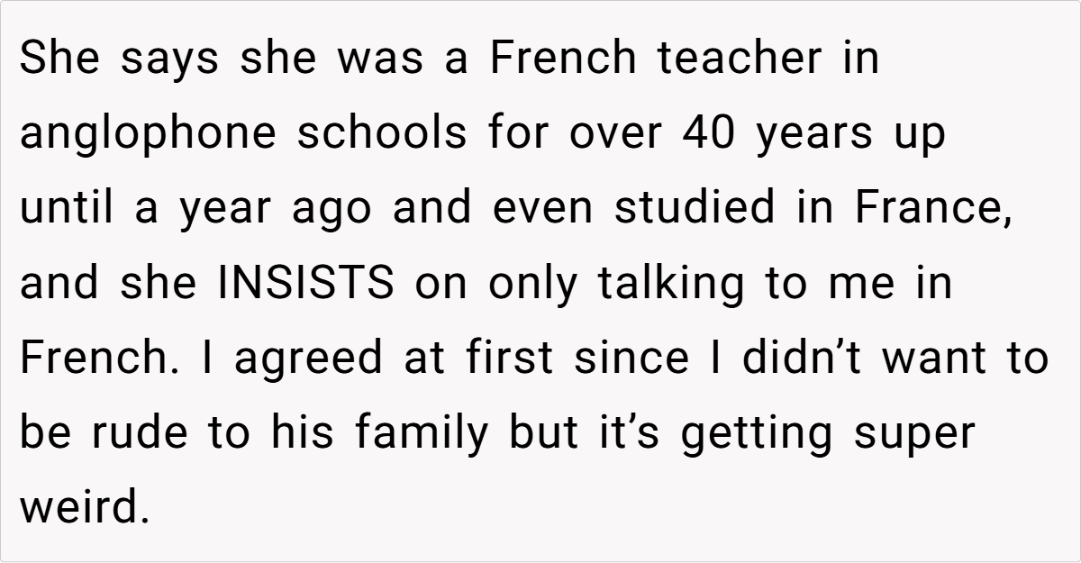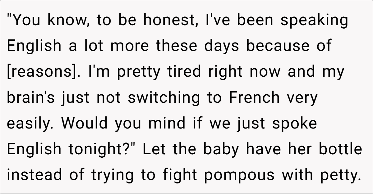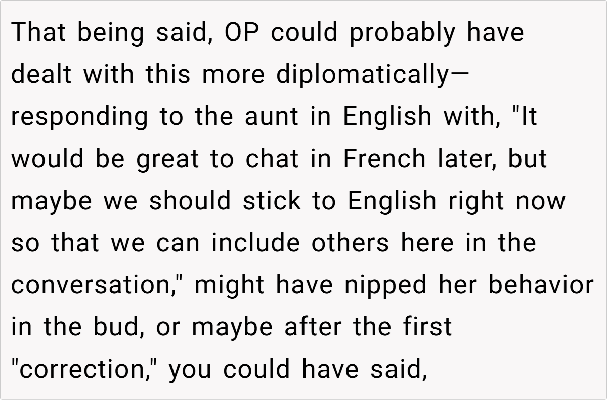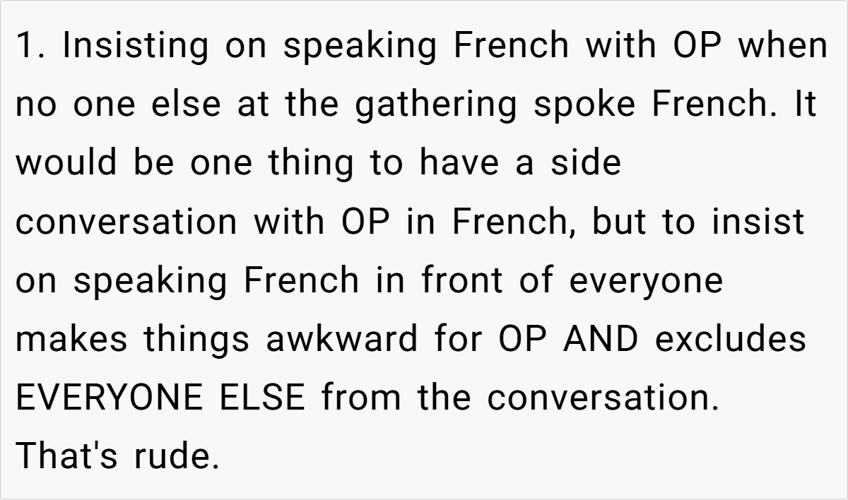 Moreover, the context of a family gathering complicates the dynamics. The aunt’s insistence on speaking French in a mixed-language environment excludes others and creates discomfort. As noted by sociolinguist Dr. Penny Eckert, “Social interactions are influenced by the language choices we make, and these choices can either include or alienate participants.” The OP’s frustration stems from this exclusion, prompting her to respond in a way that highlights the aunt’s hypocrisy.