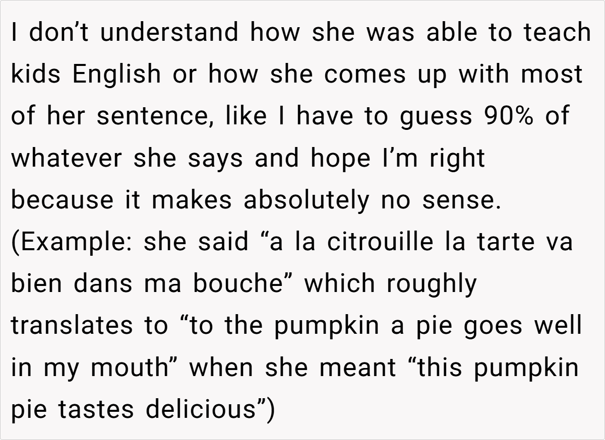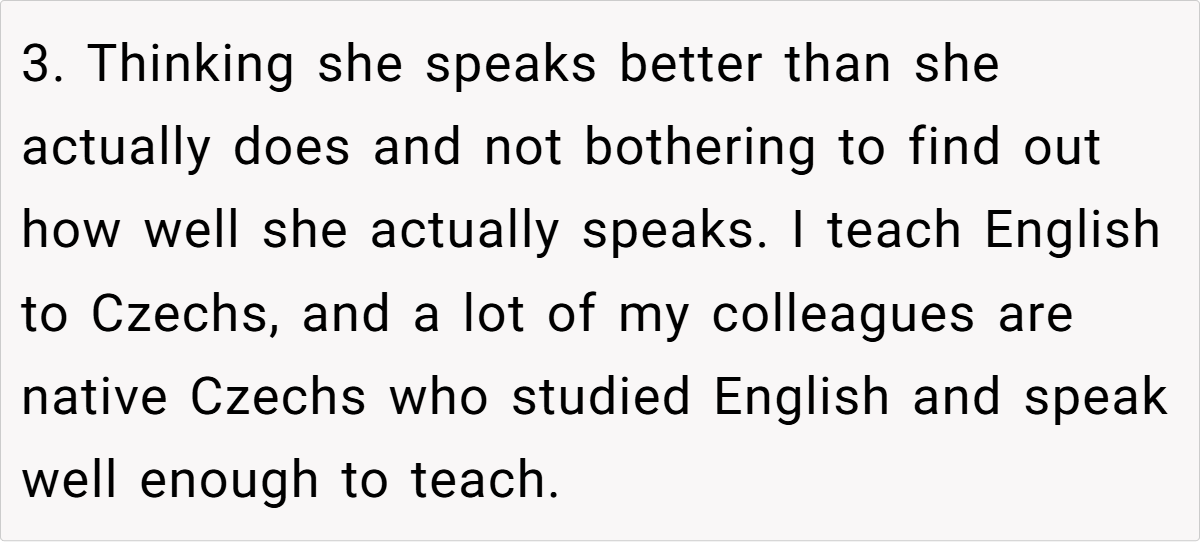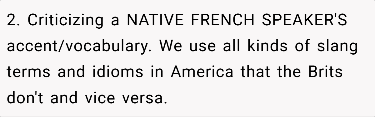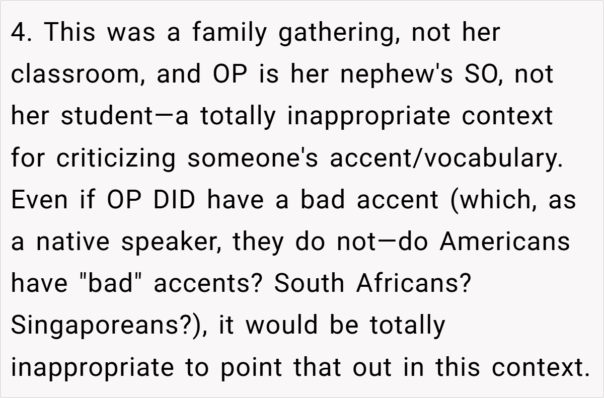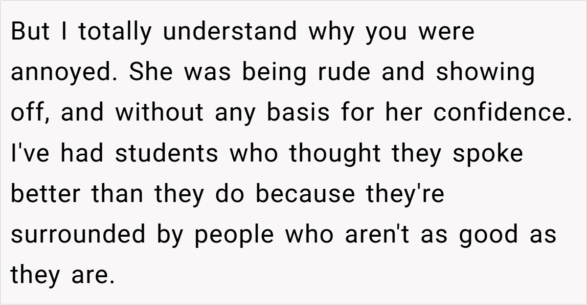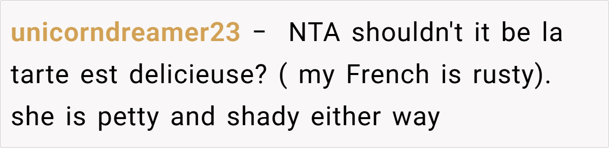 Moreover, the context of a family gathering complicates the dynamics. The aunt’s insistence on speaking French in a mixed-language environment excludes others and creates discomfort. As noted by sociolinguist Dr. Penny Eckert, “Social interactions are influenced by the language choices we make, and these choices can either include or alienate participants.” The OP’s frustration stems from this exclusion, prompting her to respond in a way that highlights the aunt’s hypocrisy.