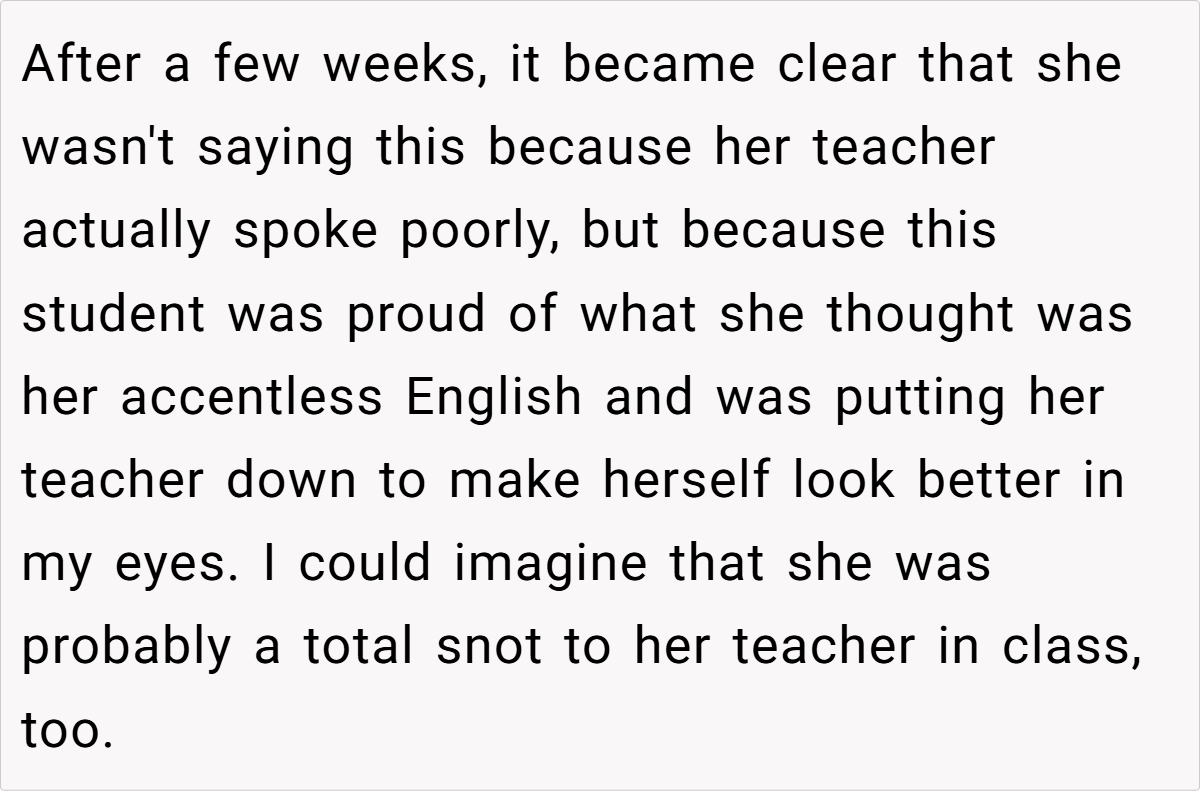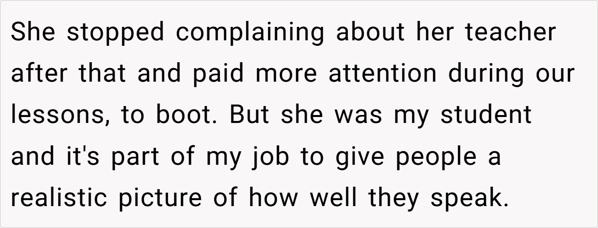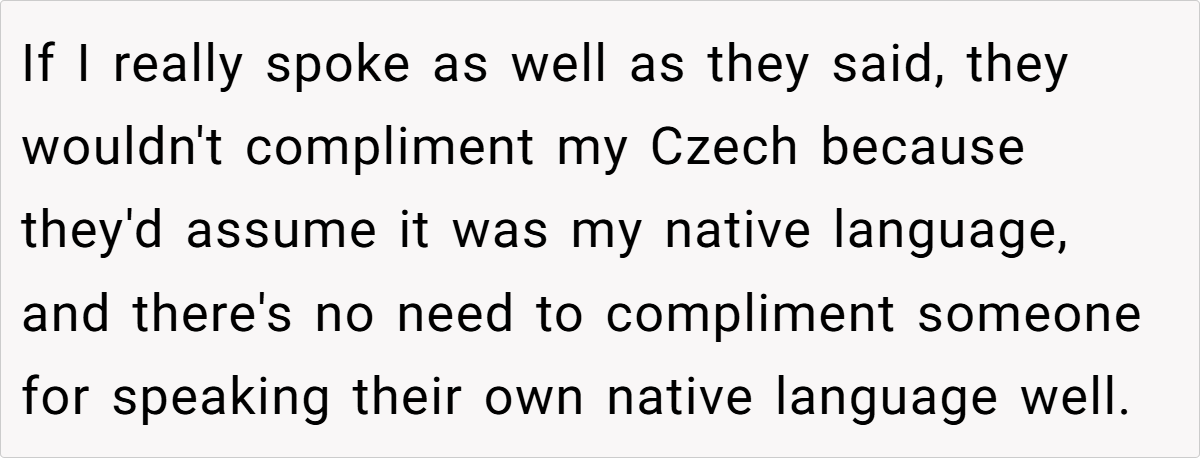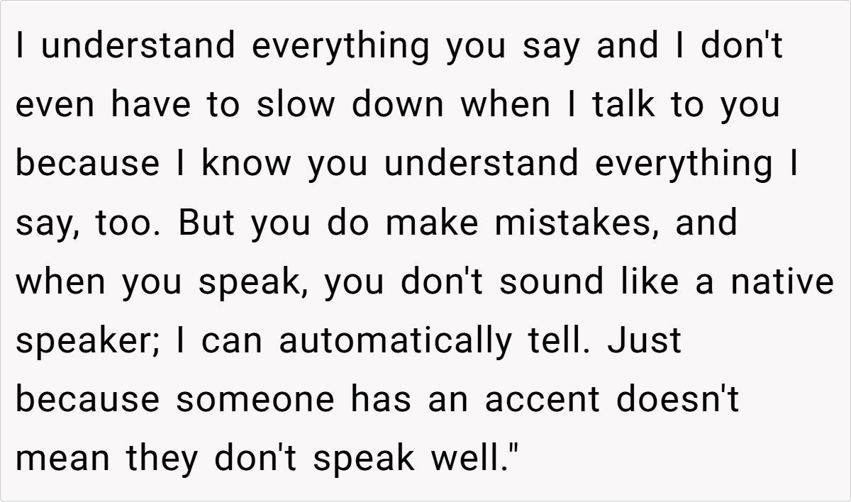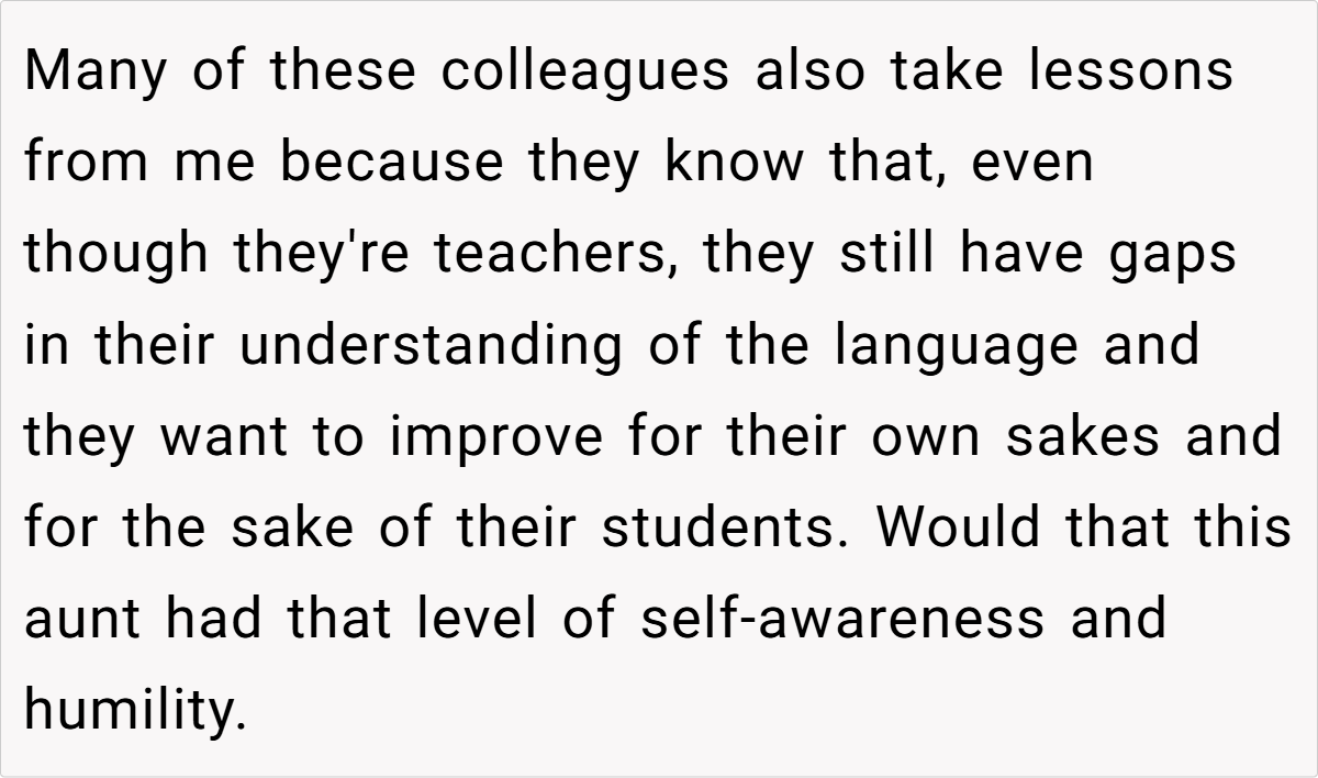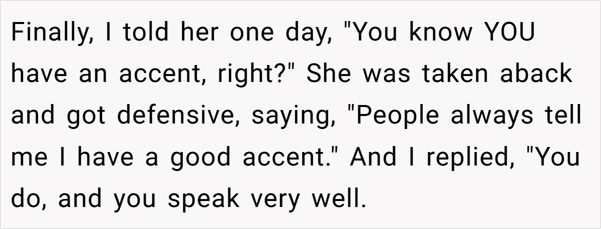 Moreover, the context of a family gathering complicates the dynamics. The aunt’s insistence on speaking French in a mixed-language environment excludes others and creates discomfort. As noted by sociolinguist Dr. Penny Eckert, “Social interactions are influenced by the language choices we make, and these choices can either include or alienate participants.” The OP’s frustration stems from this exclusion, prompting her to respond in a way that highlights the aunt’s hypocrisy.