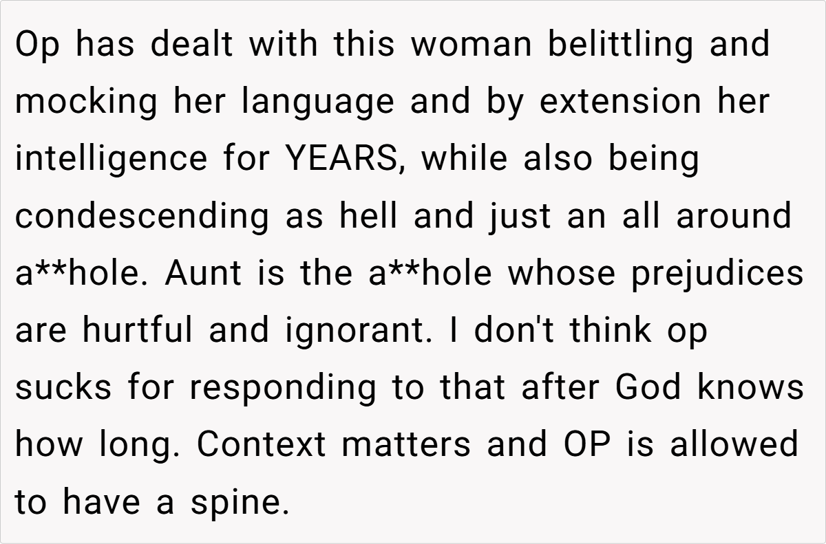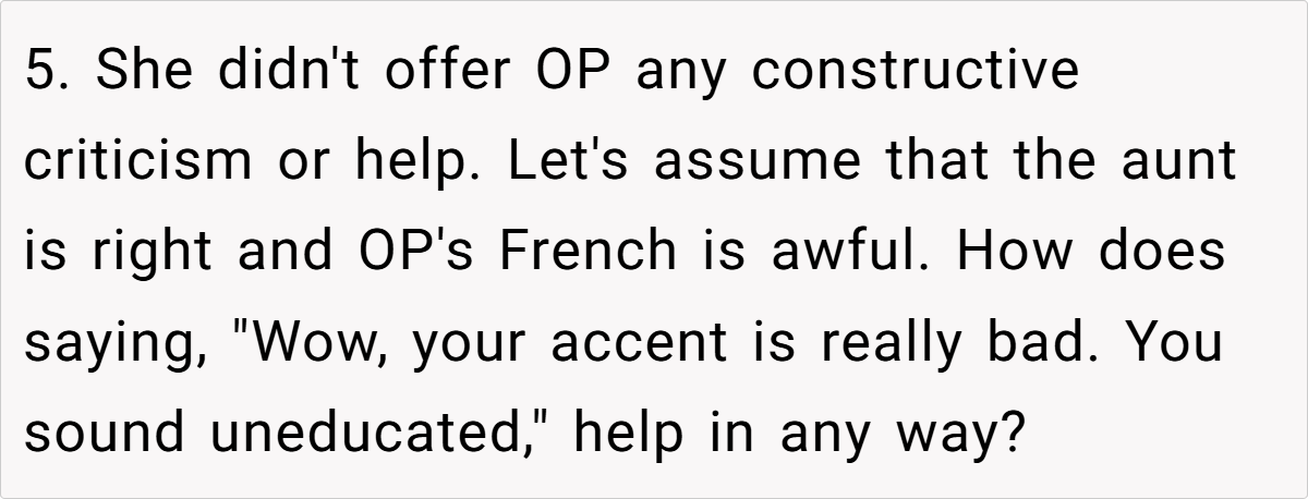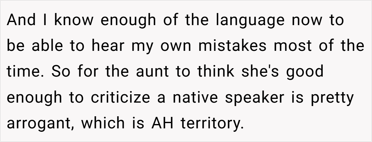In situations where language is weaponized to belittle or exclude, it’s crucial to recognize the impact of such actions. The OP’s response, while perhaps perceived as harsh, can be seen as a defense mechanism against years of condescension and disrespect. Research from the Journal of Language and Social Psychology shows that individuals often react strongly when their identity is threatened, especially in social settings. In this case, the OP’s decision to correct the aunt’s French could be viewed as reclaiming agency in a conversation that was intended to belittle her.
