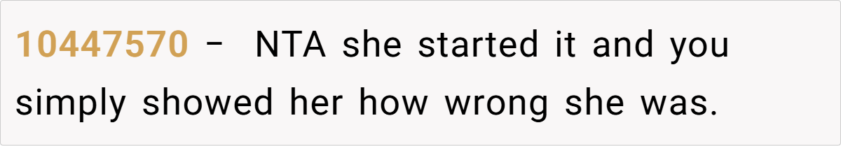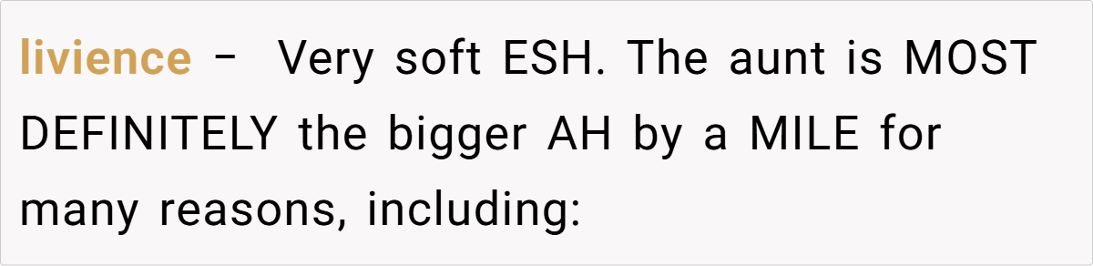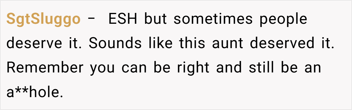 The community response reflects a broader understanding of the OP’s plight. Many recognize the aunt’s behavior as unjustifiable and support the OP’s decision to stand up for herself, even if it meant crossing a line.