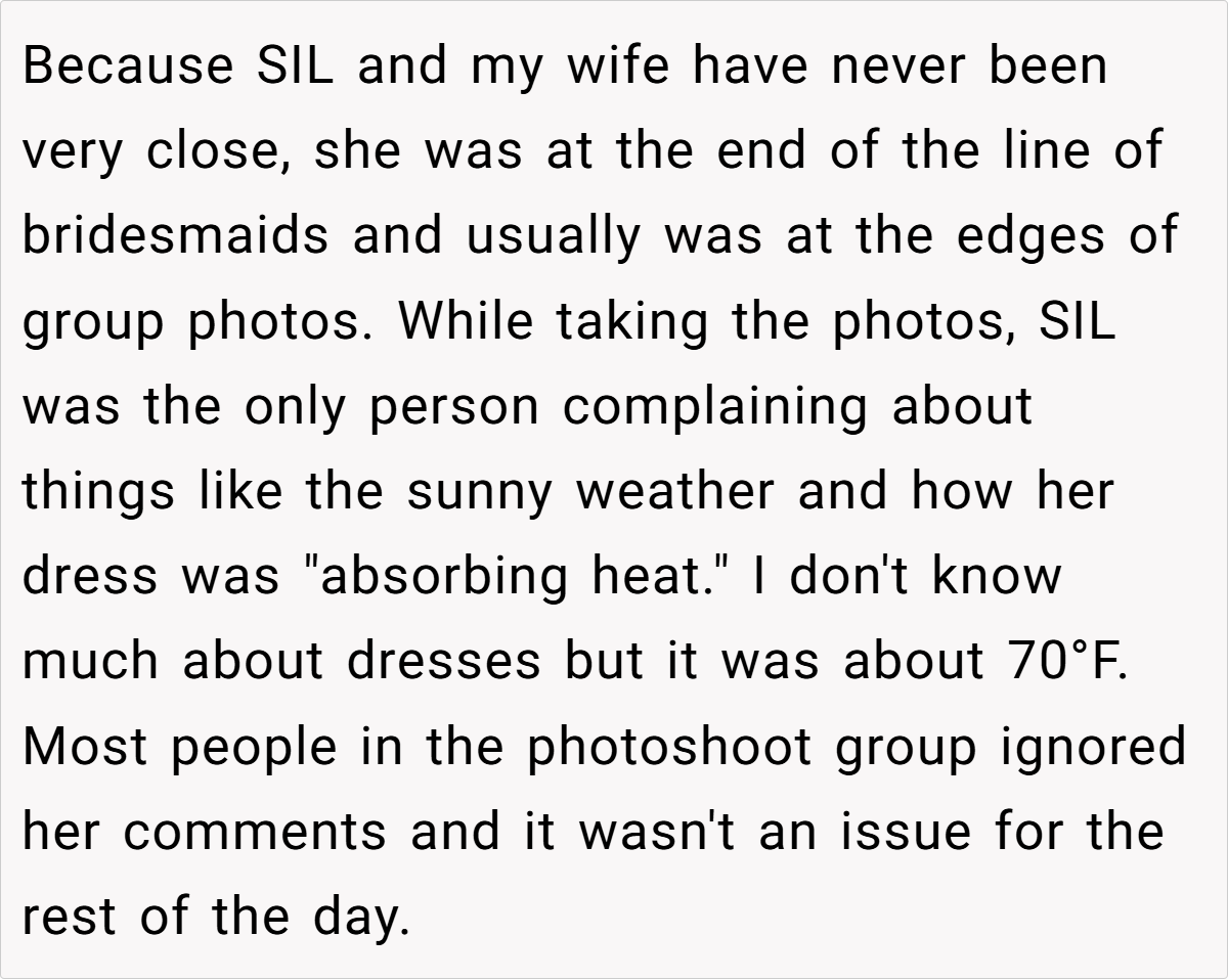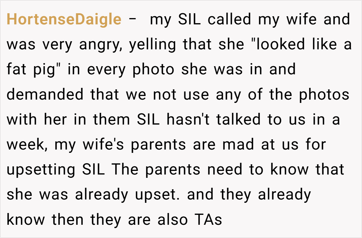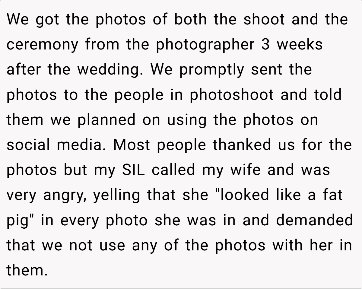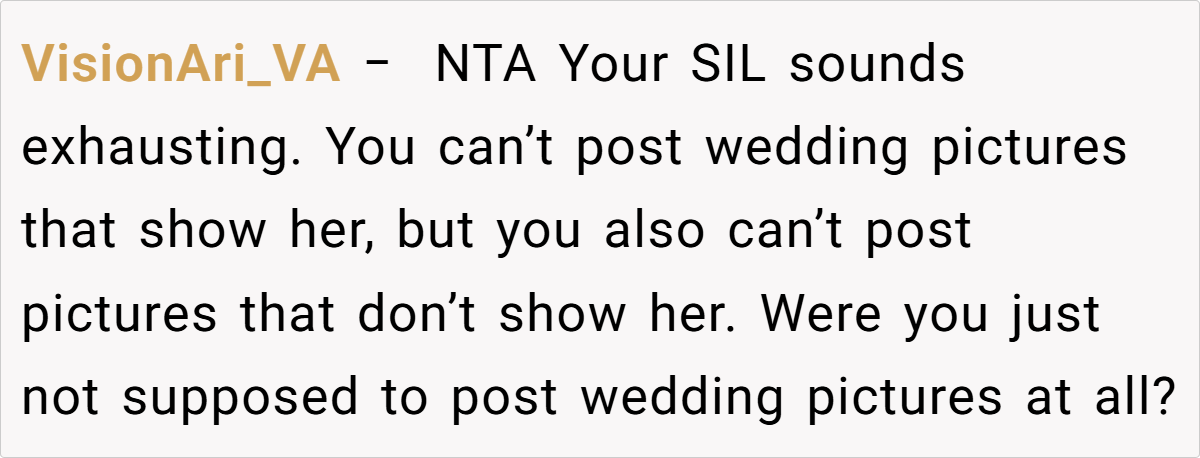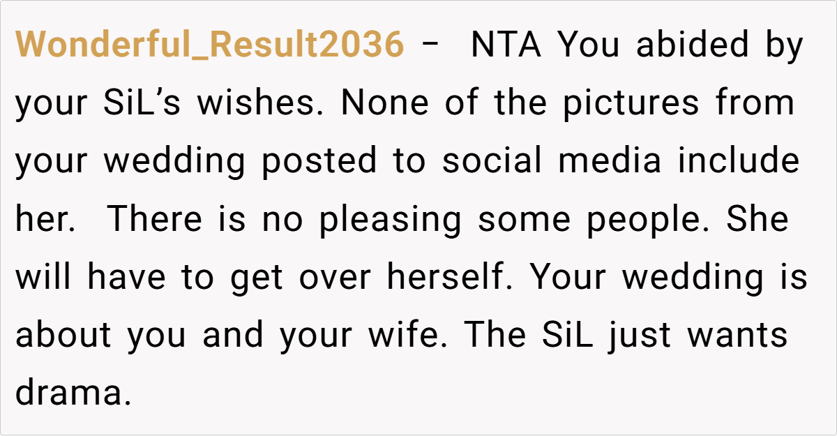 The couple’s blissful day turned complicated when a negative comment from a bridesmaid—who happens to be the sister-in-law—triggered a chain reaction. The OP explains how the sister-in-law’s continual complaints during the photoshoot eventually led her to demand exclusion from any wedding photos posted online. This seemingly small spat reveals much about how personal insecurities and family expectations can clash dramatically on one of life’s happiest occasions.