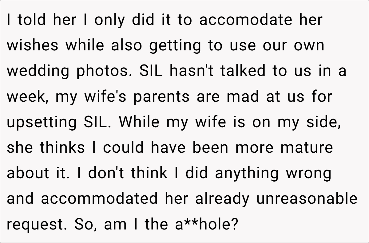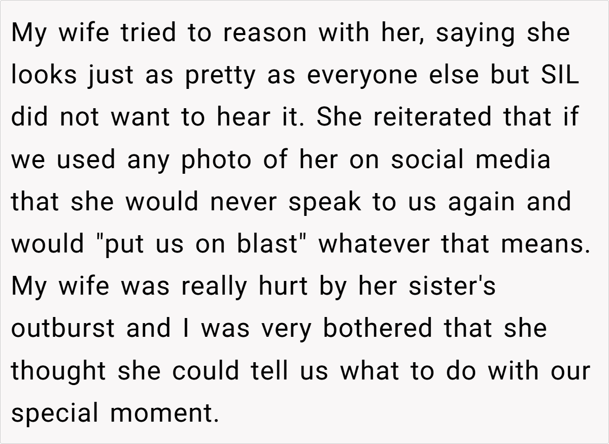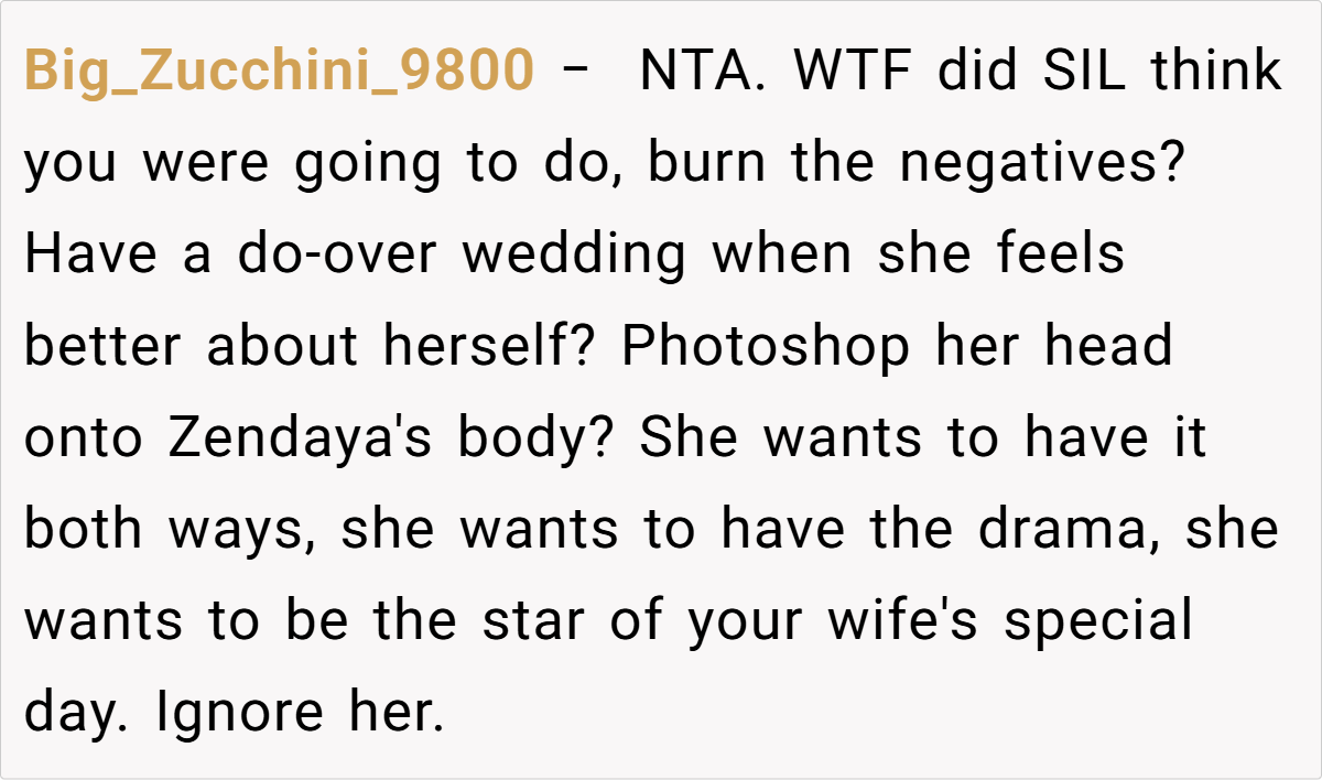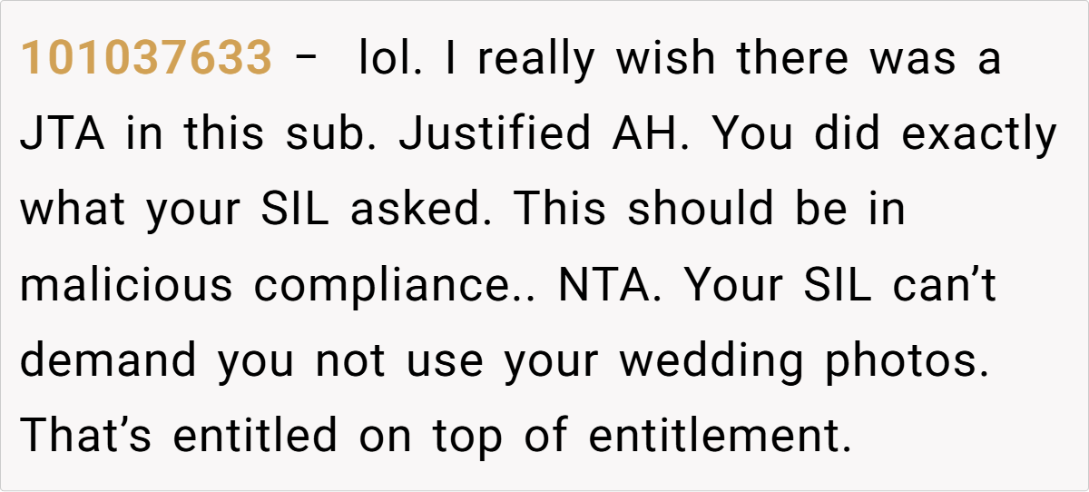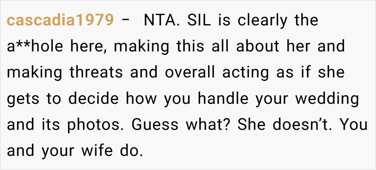 The couple’s blissful day turned complicated when a negative comment from a bridesmaid—who happens to be the sister-in-law—triggered a chain reaction. The OP explains how the sister-in-law’s continual complaints during the photoshoot eventually led her to demand exclusion from any wedding photos posted online. This seemingly small spat reveals much about how personal insecurities and family expectations can clash dramatically on one of life’s happiest occasions.