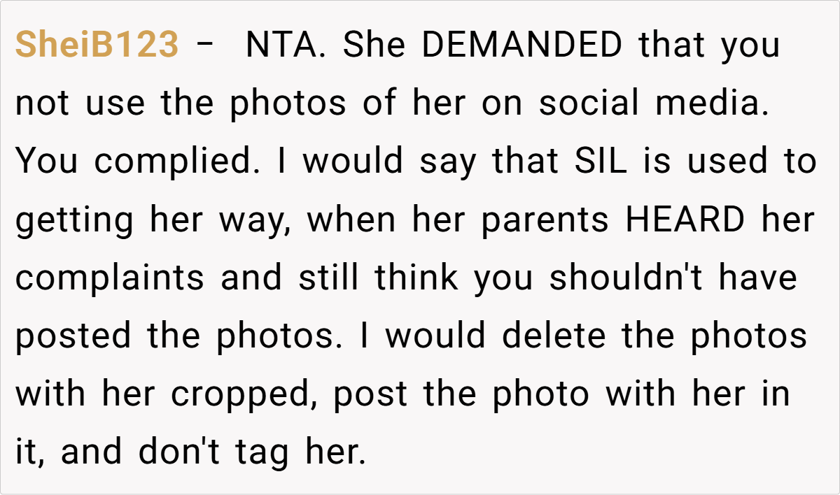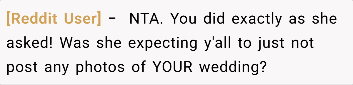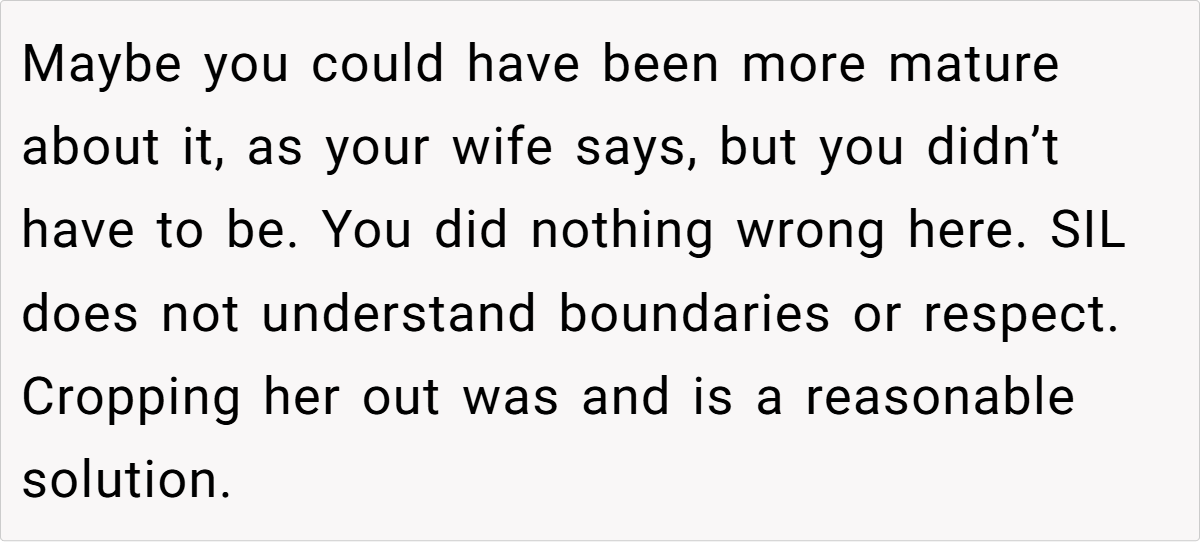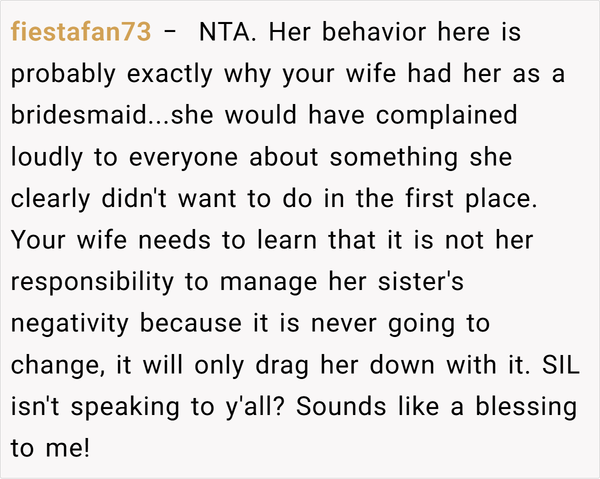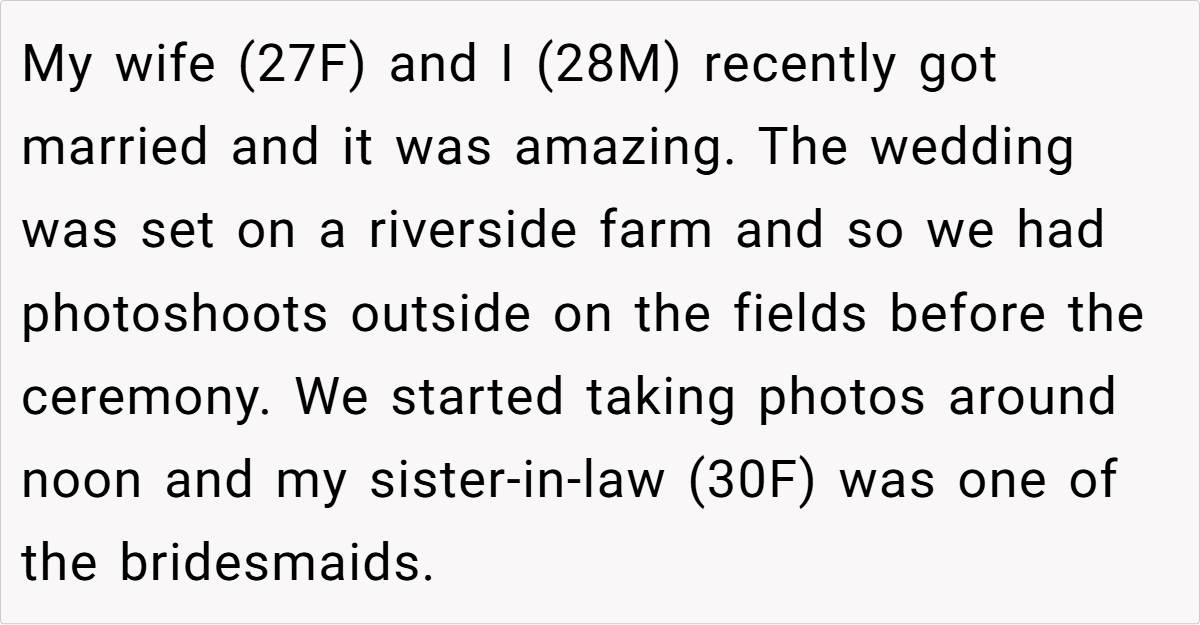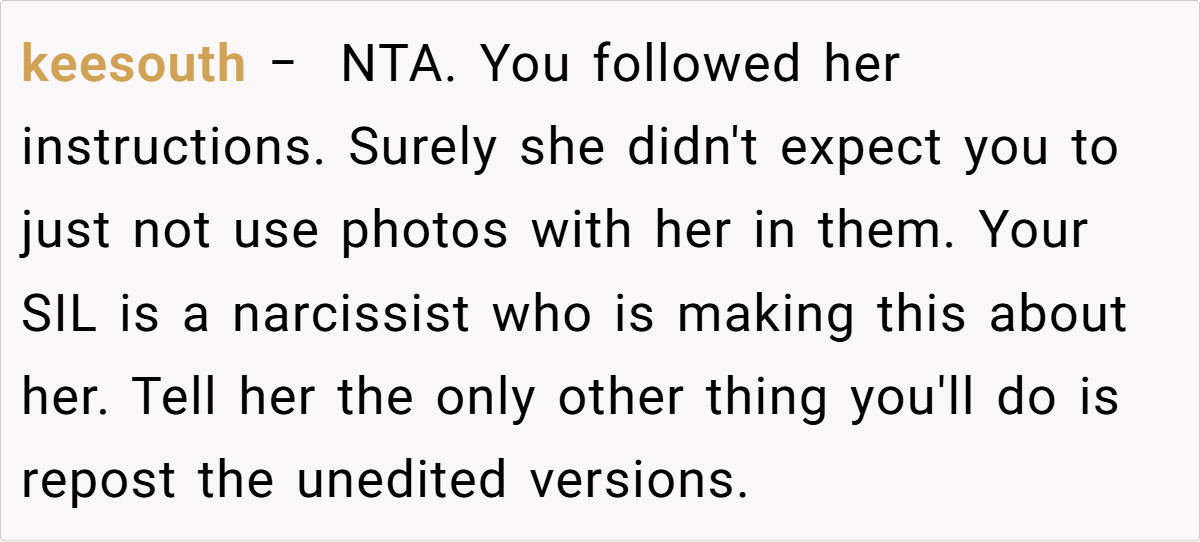 The couple’s blissful day turned complicated when a negative comment from a bridesmaid—who happens to be the sister-in-law—triggered a chain reaction. The OP explains how the sister-in-law’s continual complaints during the photoshoot eventually led her to demand exclusion from any wedding photos posted online. This seemingly small spat reveals much about how personal insecurities and family expectations can clash dramatically on one of life’s happiest occasions.