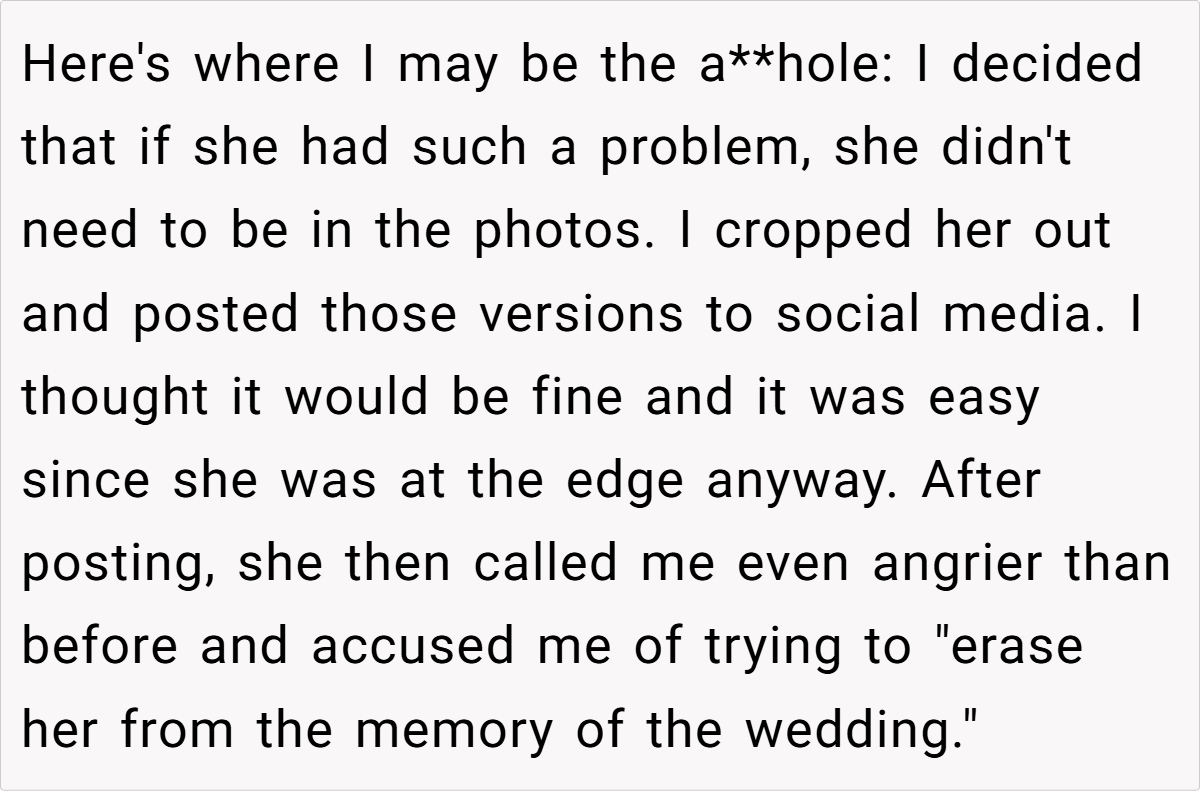 Dr. John Gottman, a renowned relationship researcher, once remarked, “It’s not the conflict itself but the way couples handle conflict that determines the quality and longevity of their relationship.” This insight is particularly relevant here. The OP’s approach—cropping the contentious figure out of cherished memories—was his attempt to protect his wedding day from negativity.