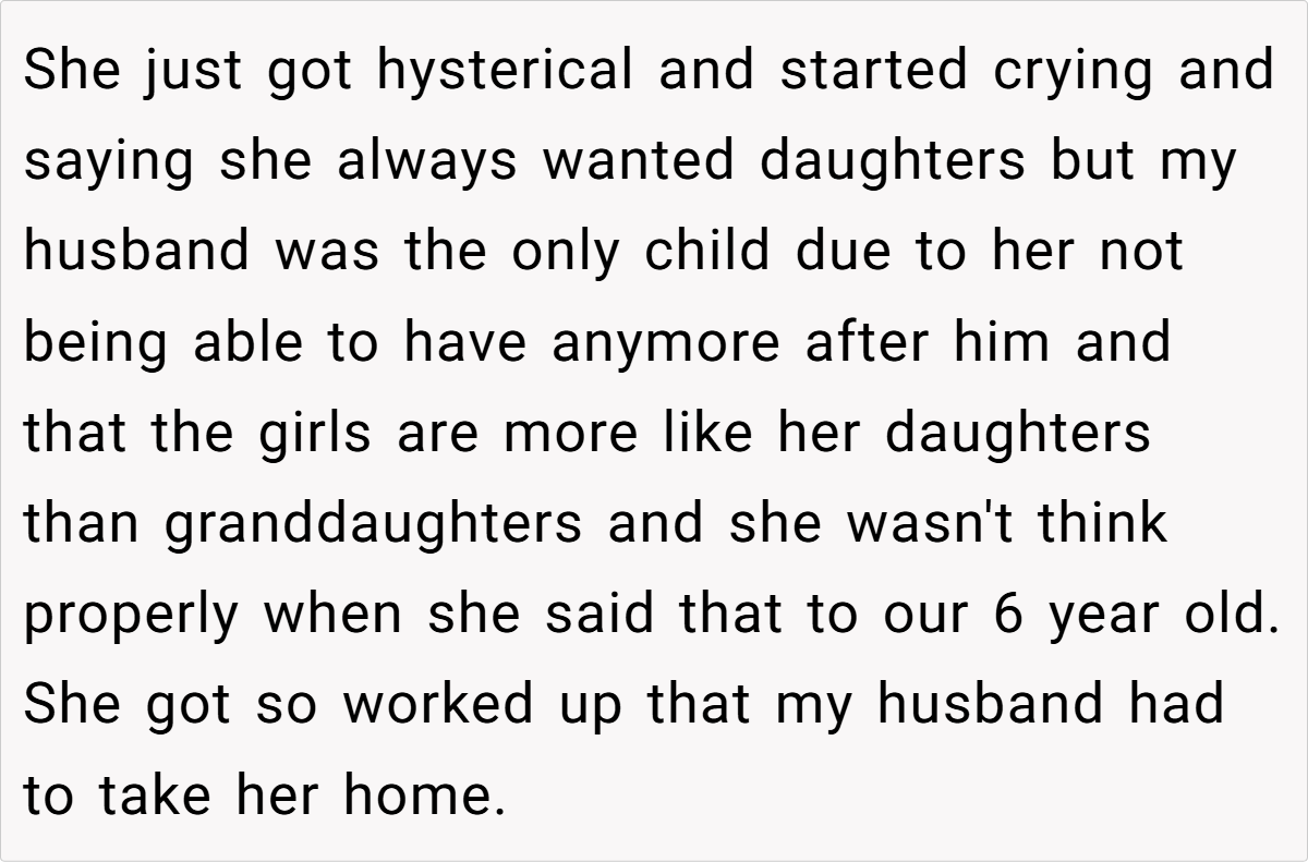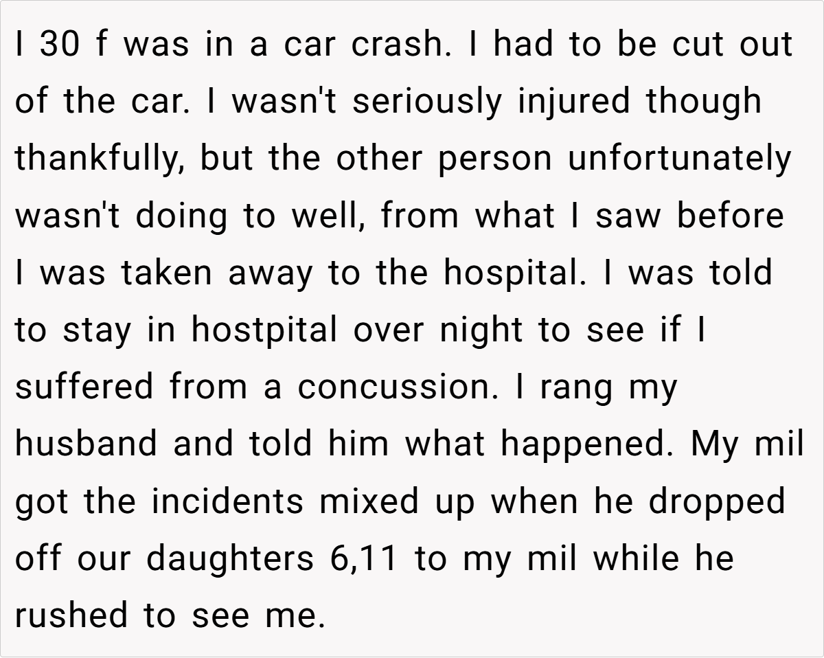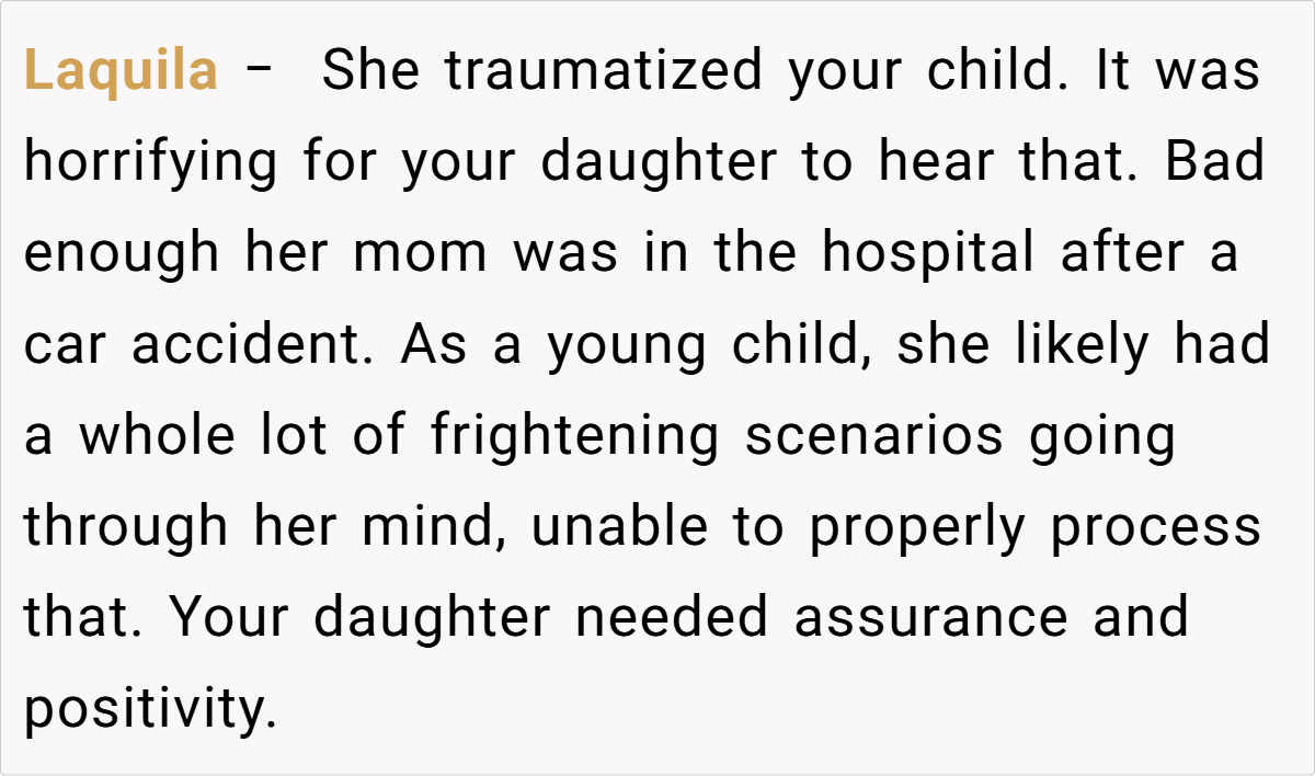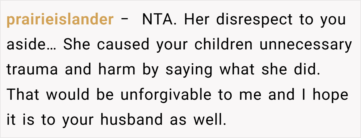 The Reddit community has overwhelmingly supported the mom’s decision. Many users have condemned the MIL’s behavior as not only insensitive but downright abusive, particularly given the traumatic context of a car accident. Commenters have expressed shock that such a remark could be made in front of a frightened child and insist that protecting the children’s emotional well-being must come first.