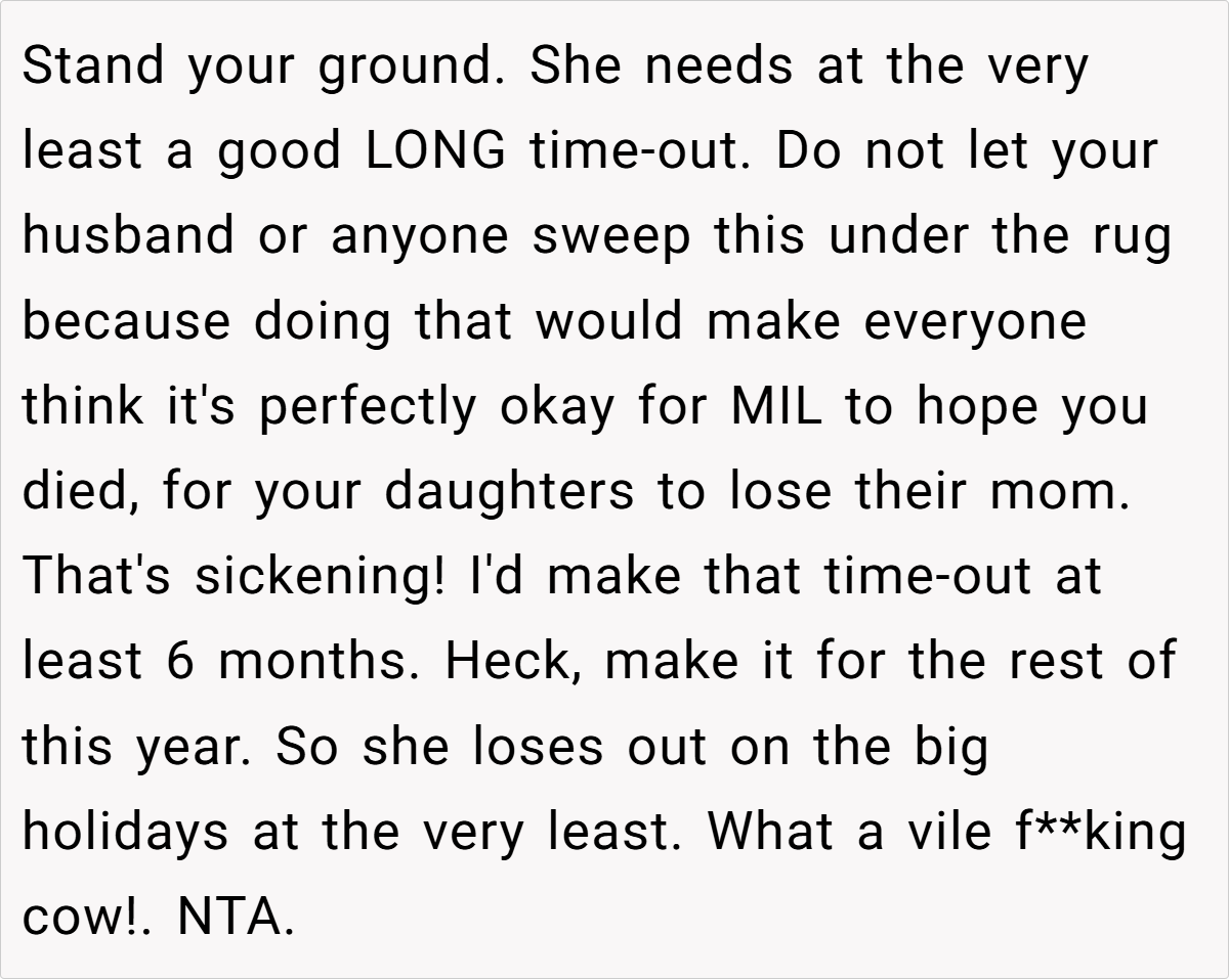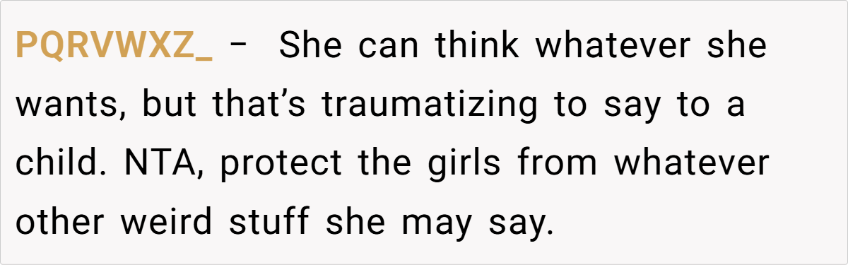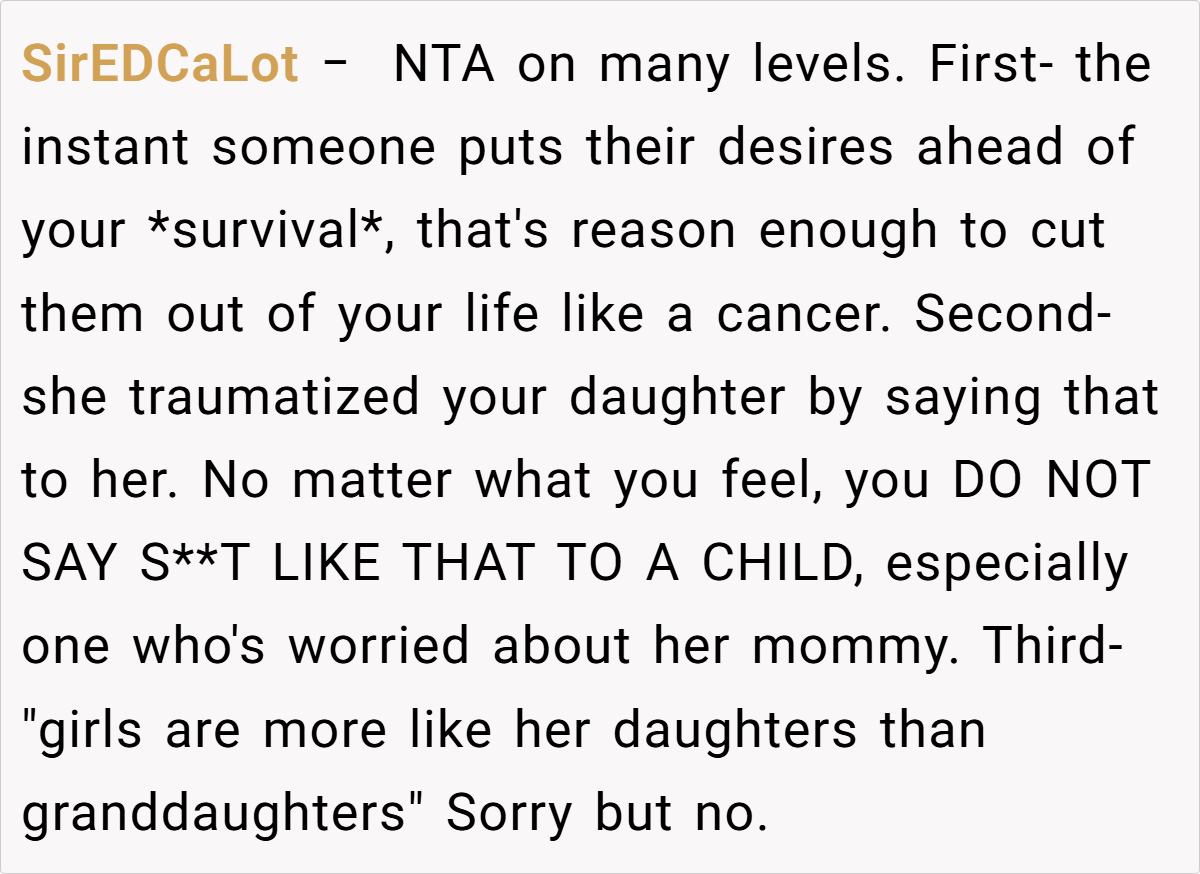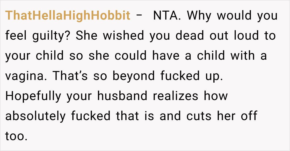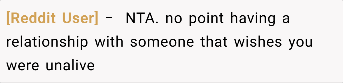One user argued, “There’s no excuse for telling a child you hope their mom dies—this crosses every boundary of acceptable behavior.” Others have echoed the sentiment that if a family member’s words cause such deep hurt, it’s entirely justified to limit or even sever contact until trust can be rebuilt.