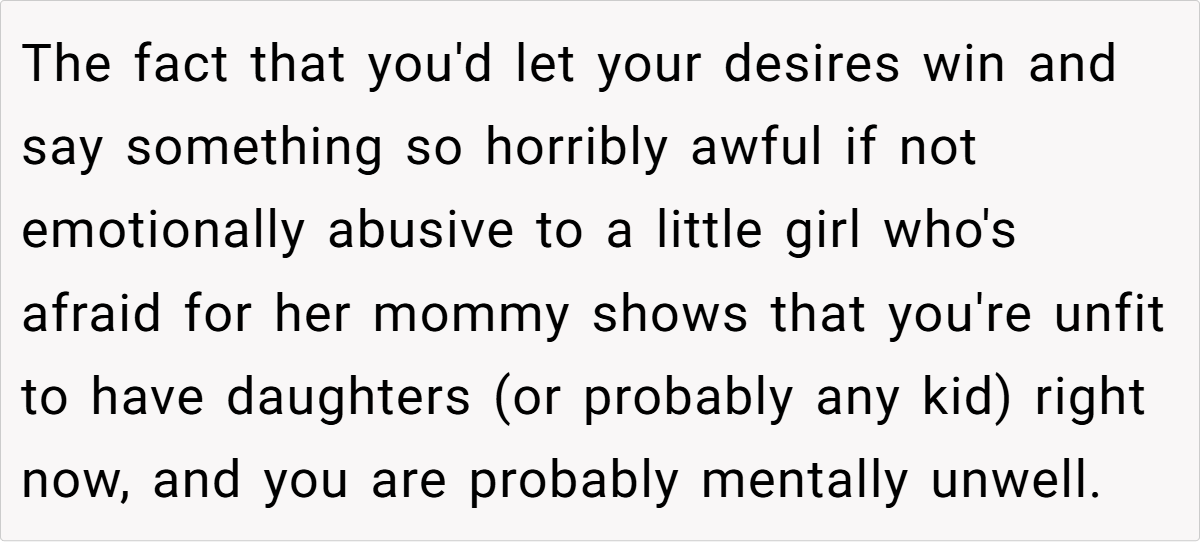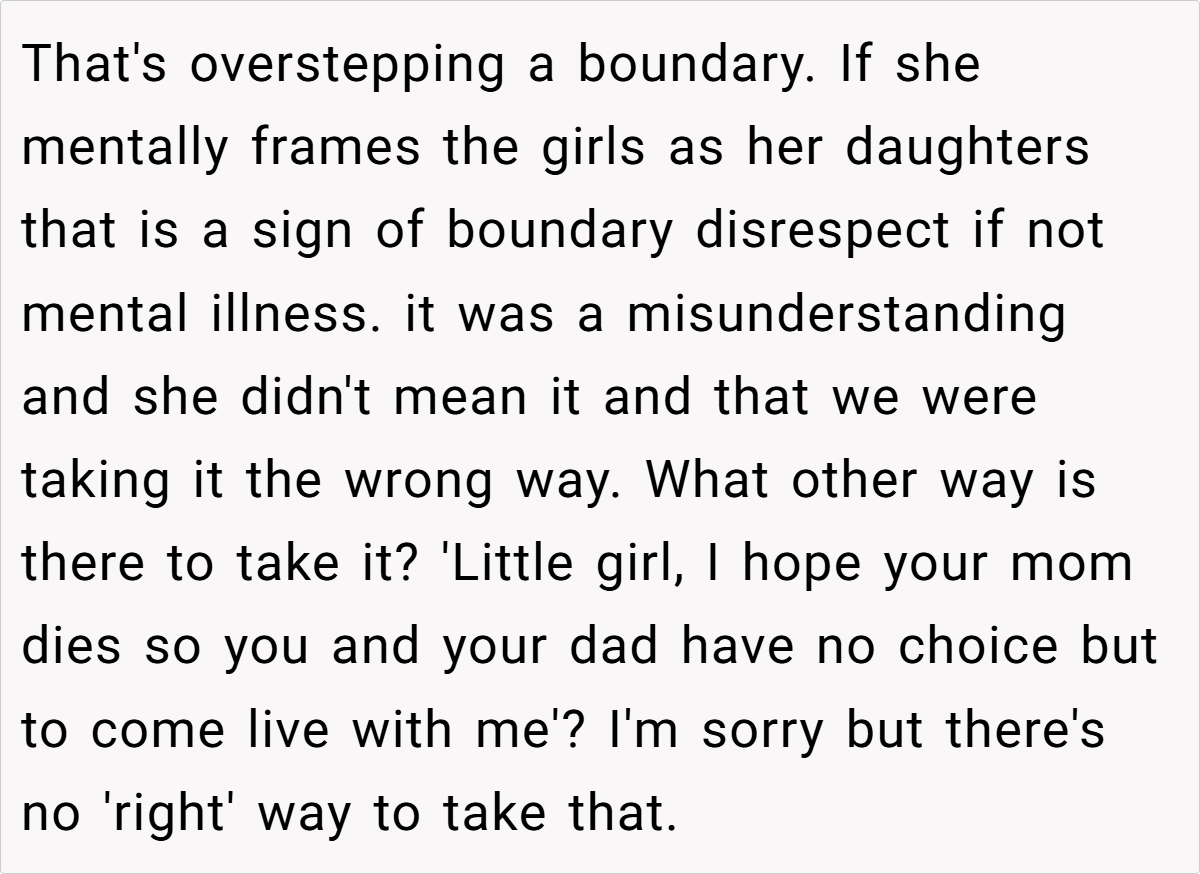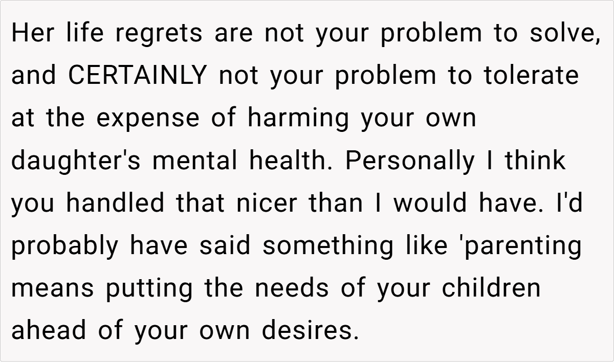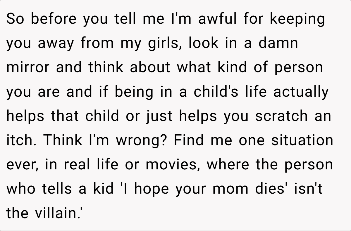 One user argued, “There’s no excuse for telling a child you hope their mom dies—this crosses every boundary of acceptable behavior.” Others have echoed the sentiment that if a family member’s words cause such deep hurt, it’s entirely justified to limit or even sever contact until trust can be rebuilt.