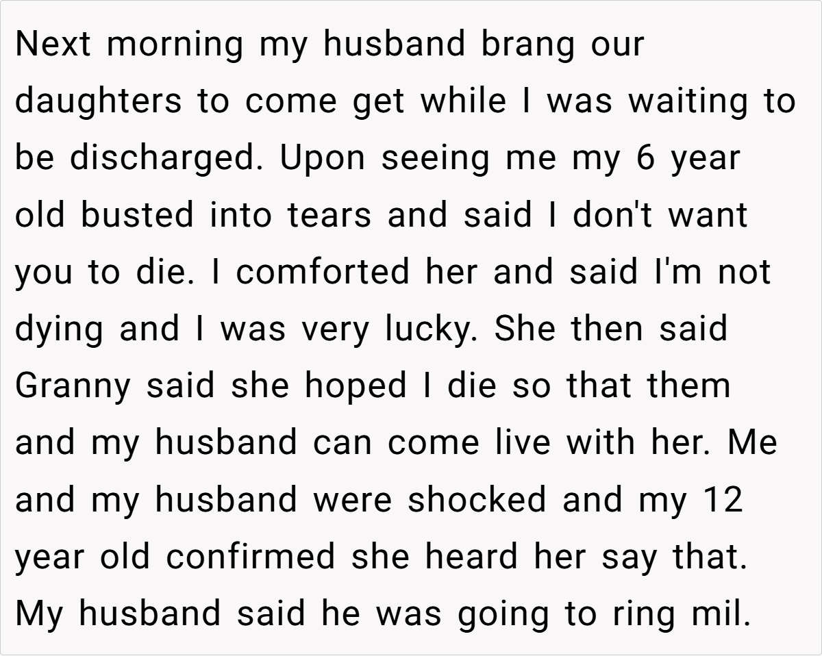 ‘AITA for cutting my mil off because she told my daughter she hoped I had died when I was taken to hostpital?’